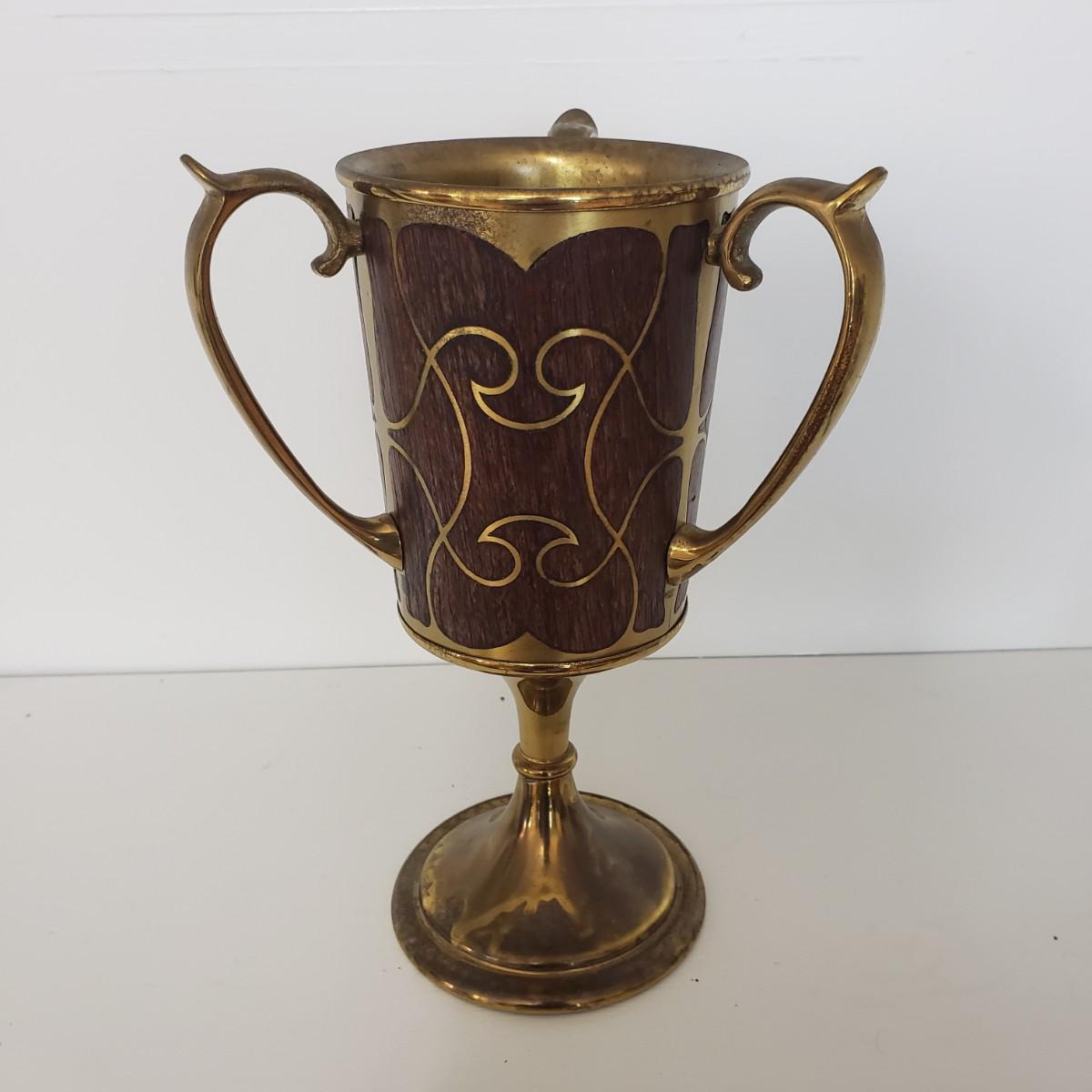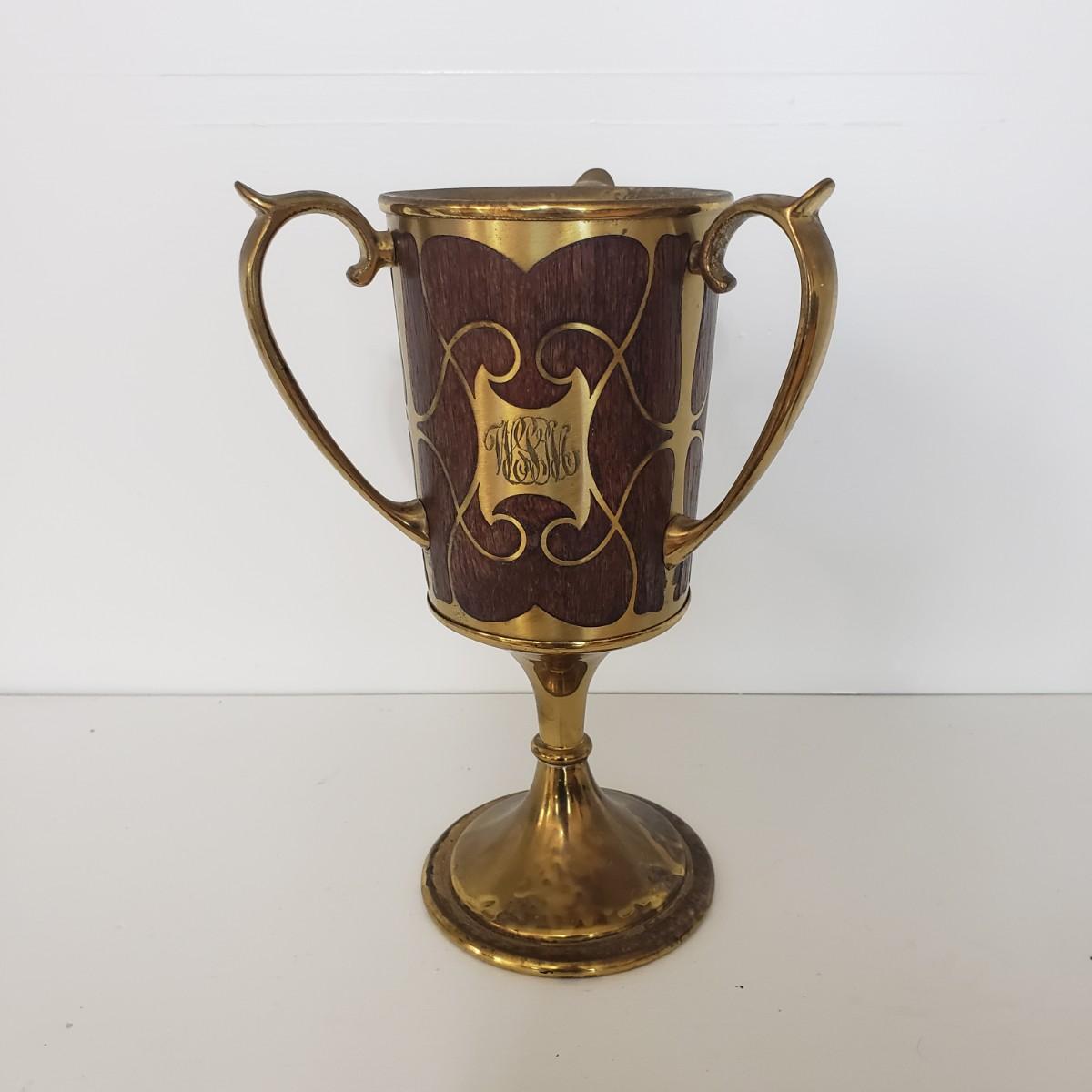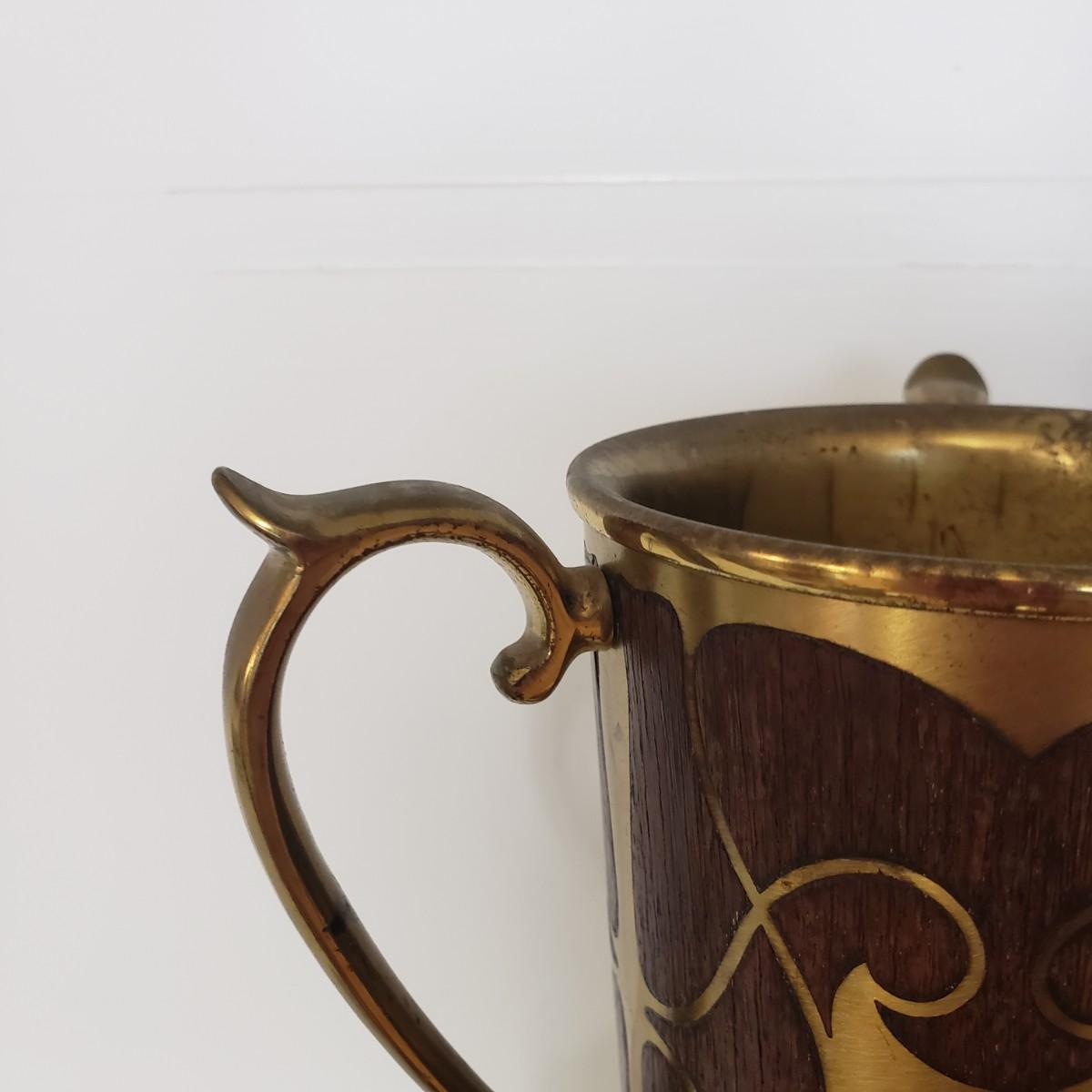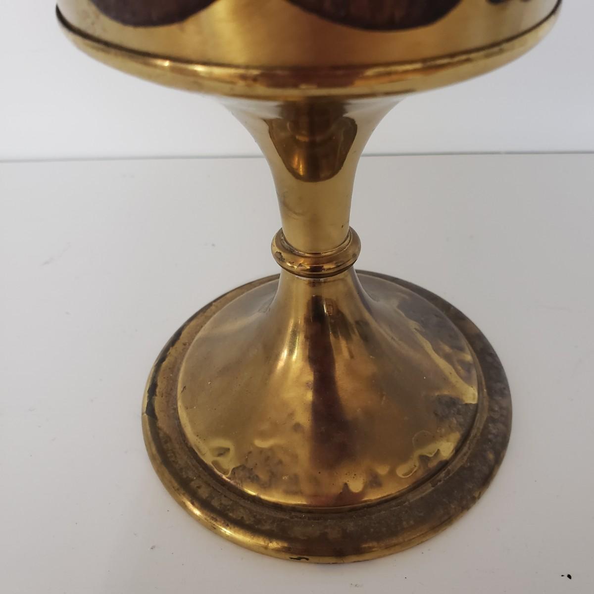 This unique chalice has a brass body with wood inlay. The monogram has W. S. M. on the front. The chalice measures 4"D x 9.5"H. One of the handles is slightly loose and there is a small chip of wood near the top of a handle. There is some discoloration on the inside. Please see photos for details.