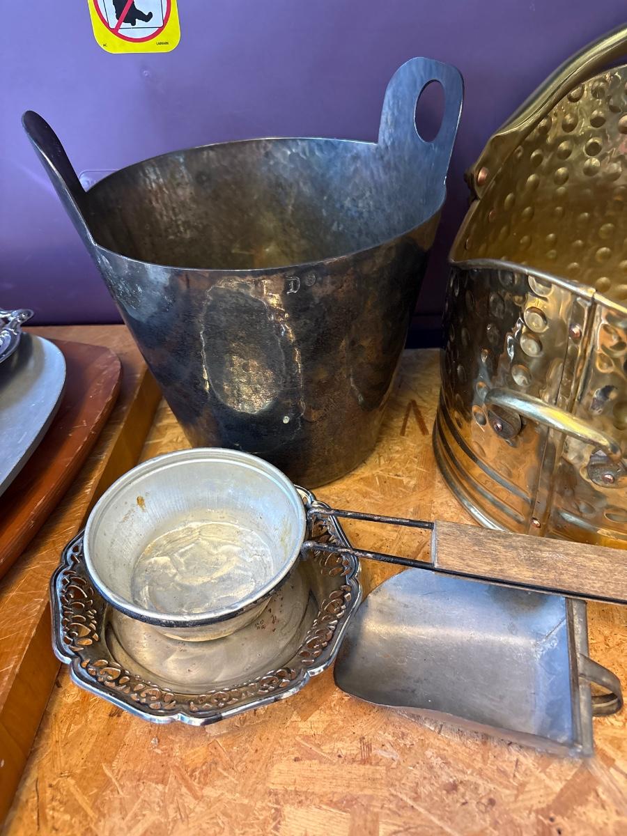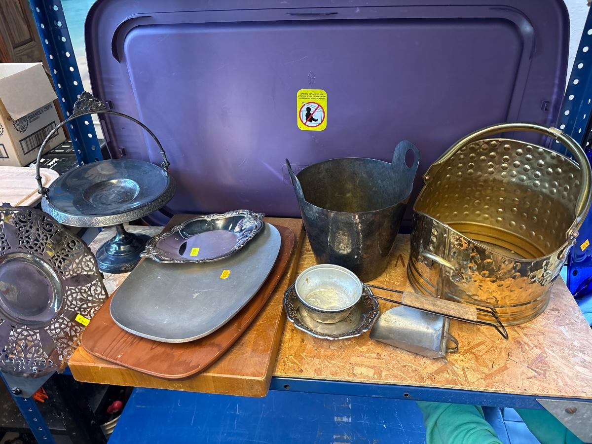 Brass ash bucket, silver plate & trays
