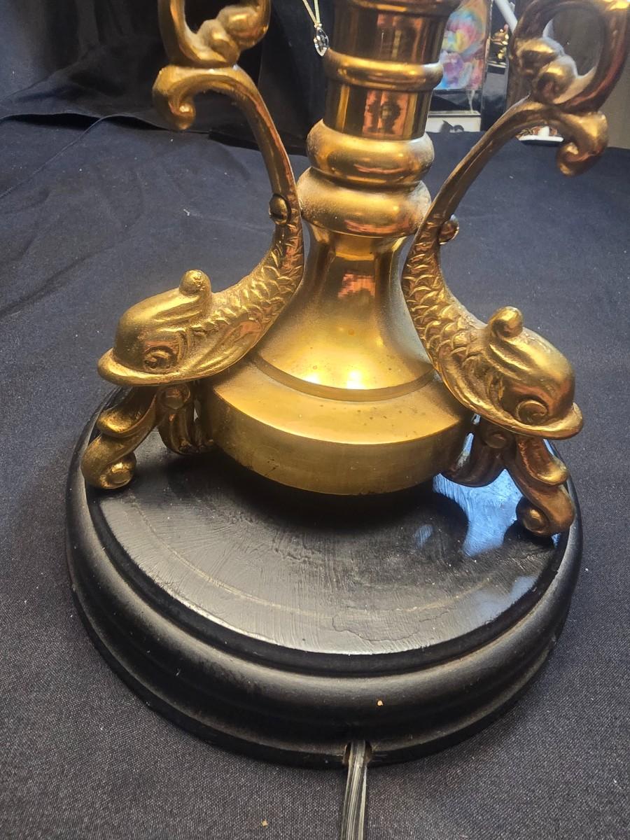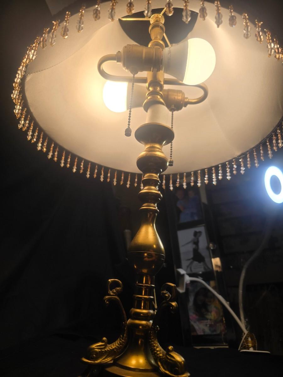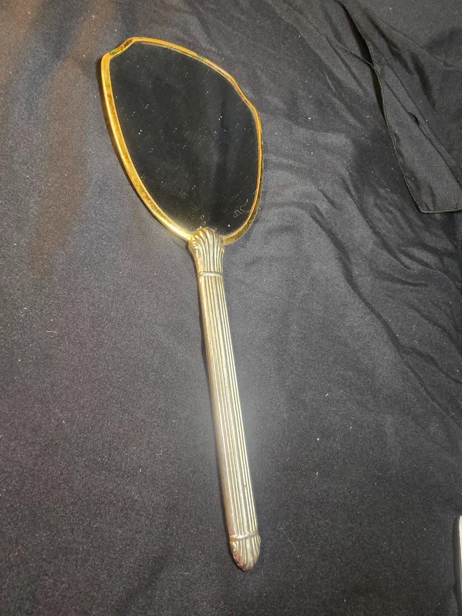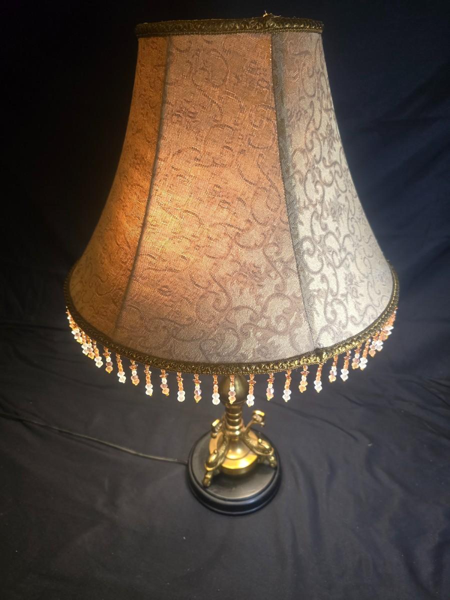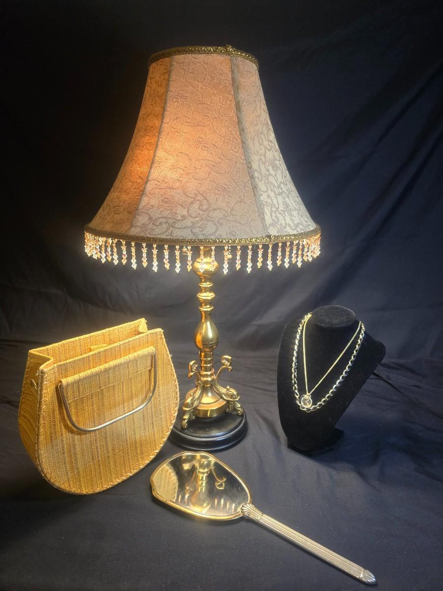 BRASS BASE DOUBLE LIGHTED LAMP, VANITY MIRROR, 2 NECKLACES AND A PURSE