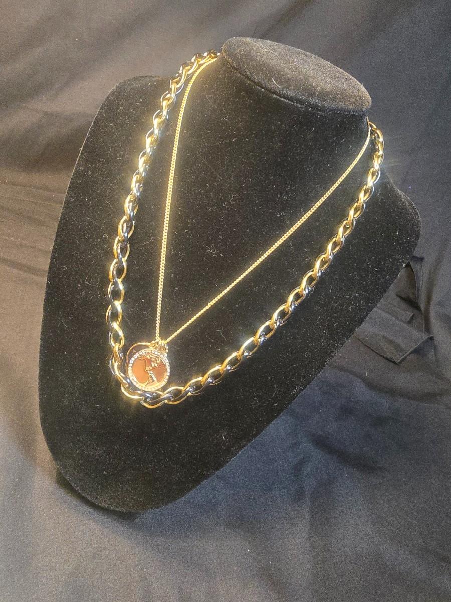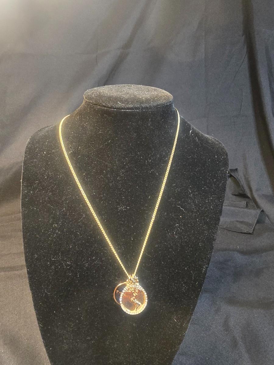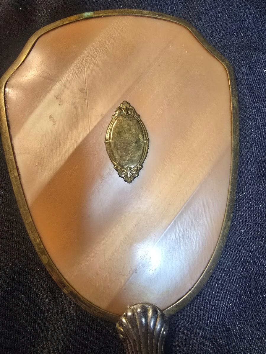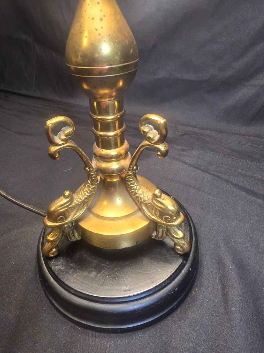 BRASS BASE DOUBLE LIGHTED LAMP, VANITY MIRROR, 2 NECKLACES AND A PURSE