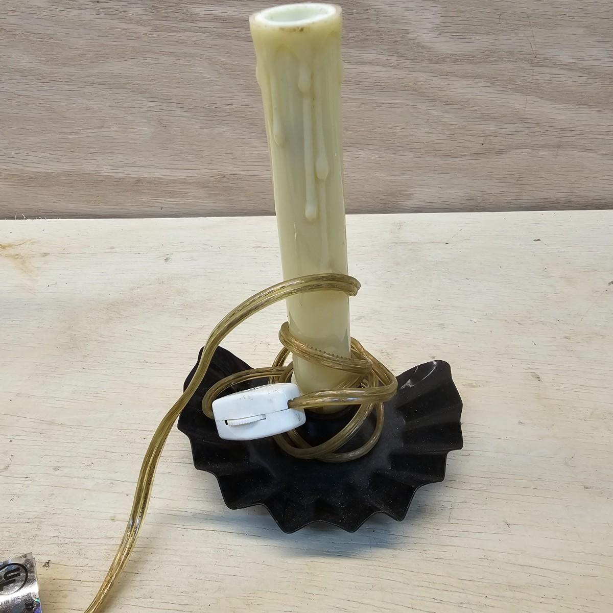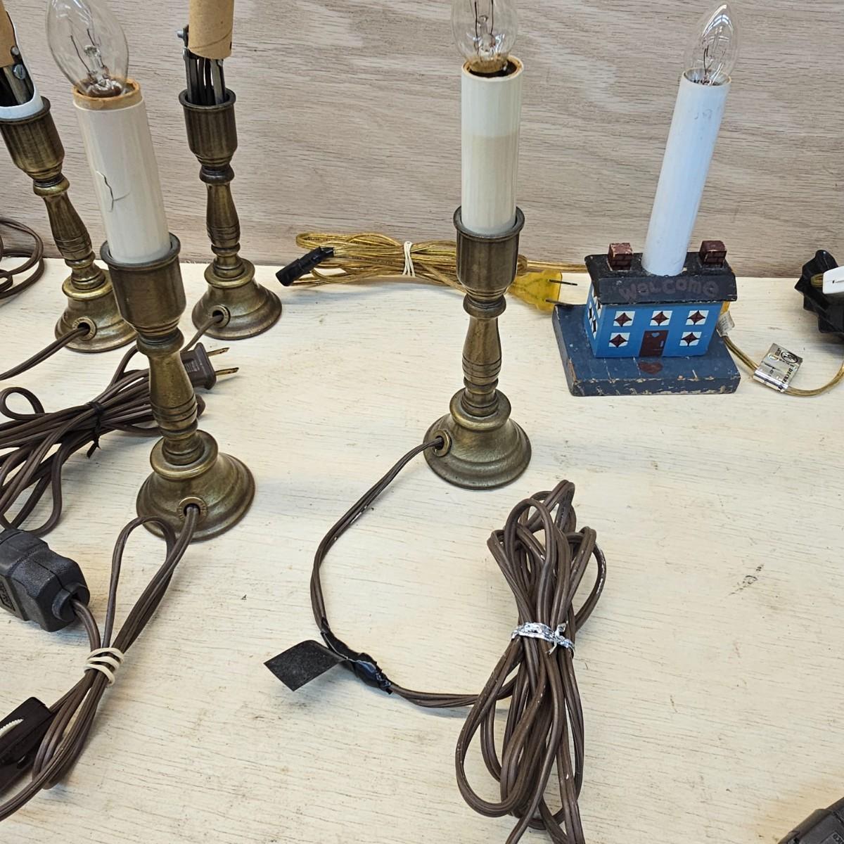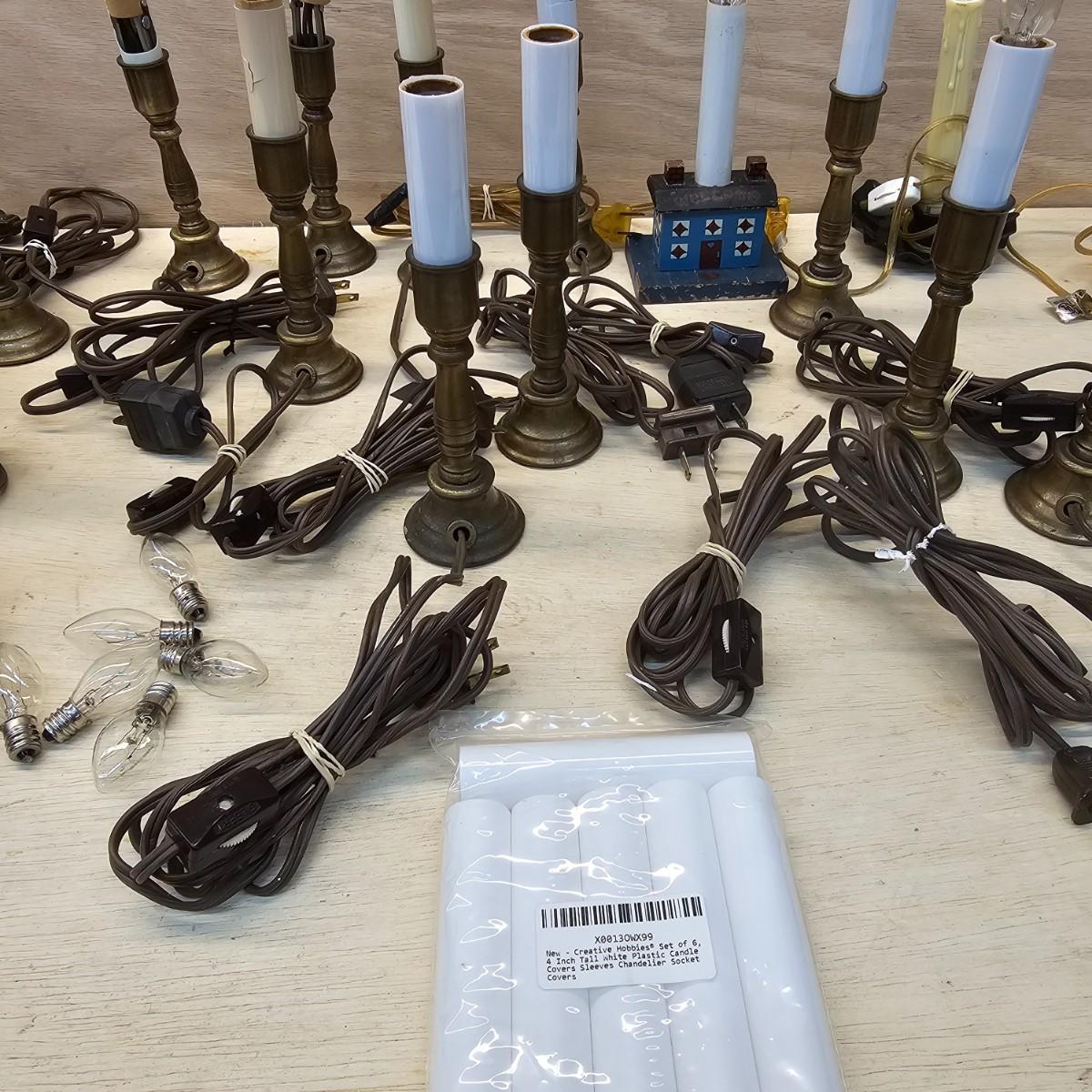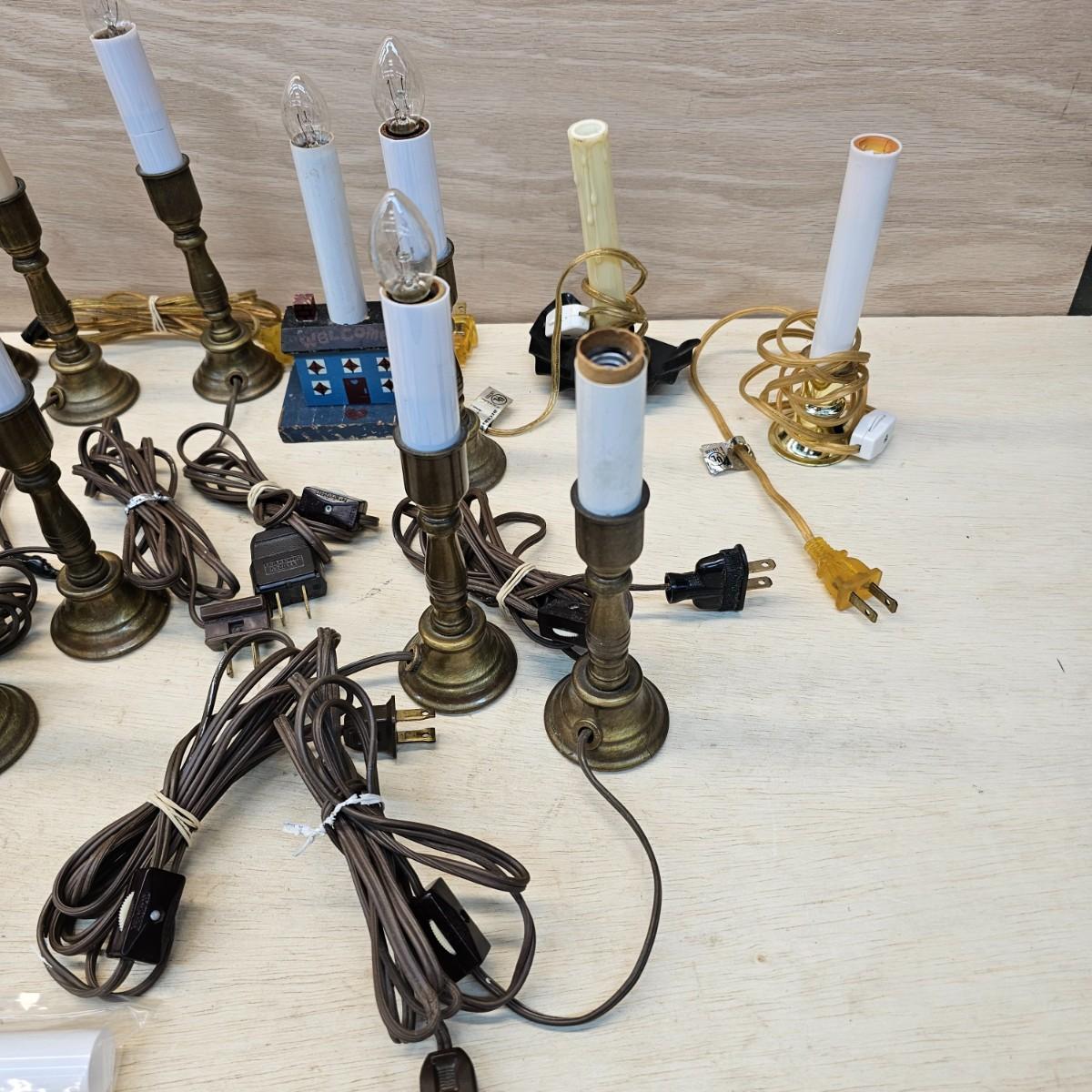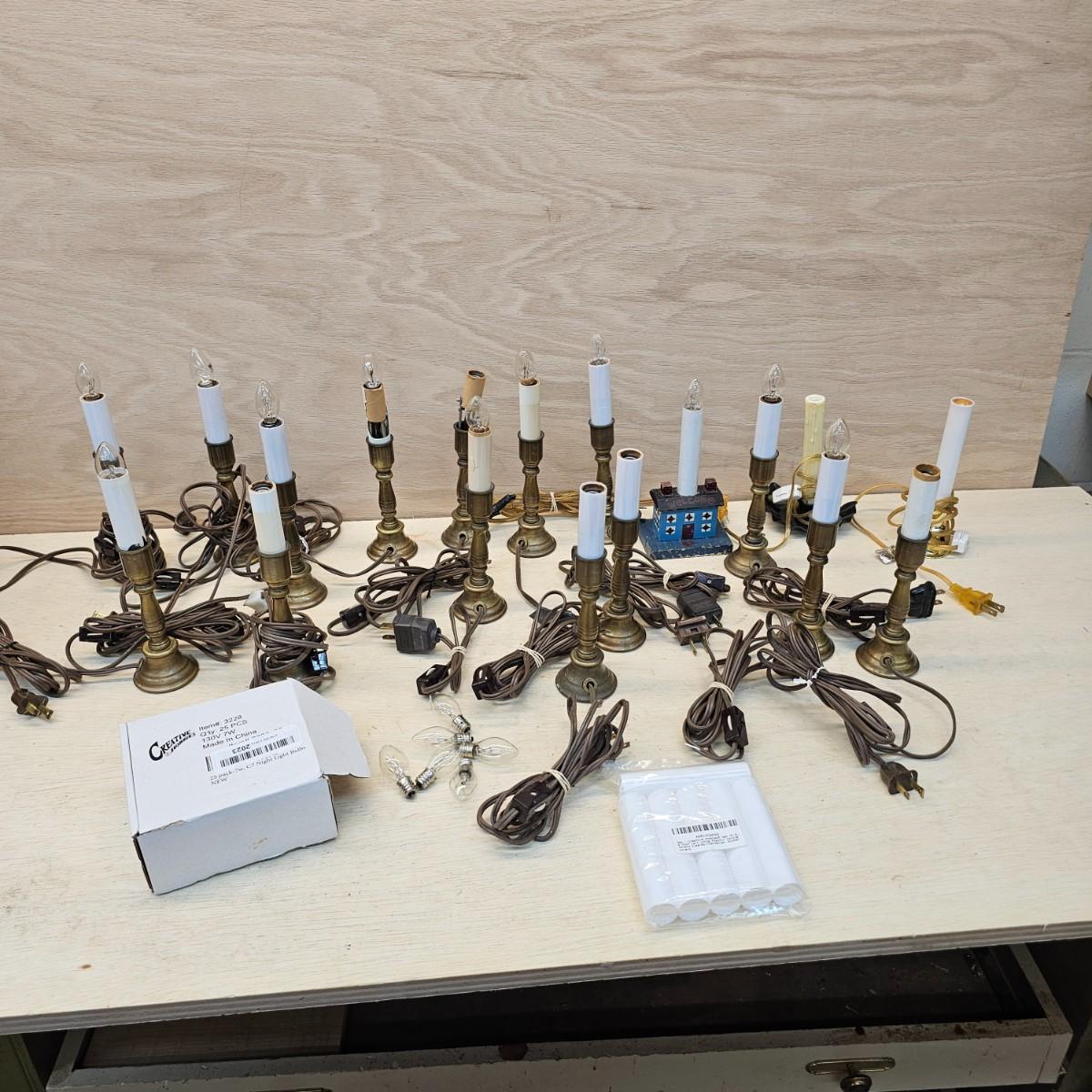 Fifteen brass base electric candelabras, most with inline switches. Approximately seven foot cords, with white socket covers at top. Takes C-7 size 7W bulb, an extra 25 pack included. Candles measure 2"D x 7.5"H. An extra package of replacement sleeves is also included. A few items have taped cords, may need to be replaced, and some will need new covers. Also includes two smaller plastic base Candles and a wooden cottage with candle, 4" x 2.5" x 7"H. All items powered on when plugged in. Some bulbs are LED style. See photos for details. Shipping available.