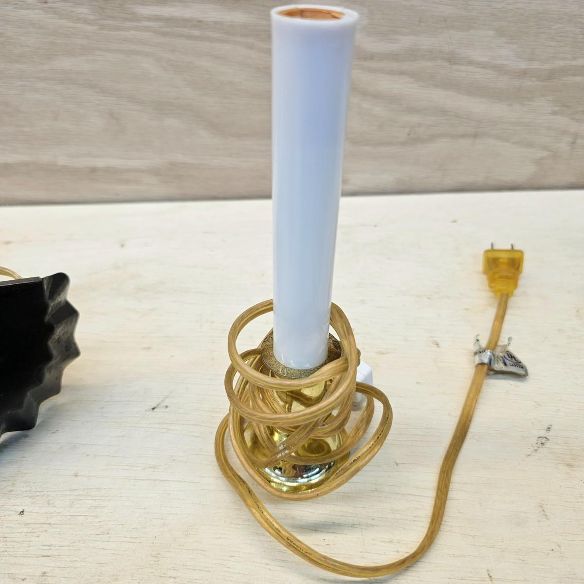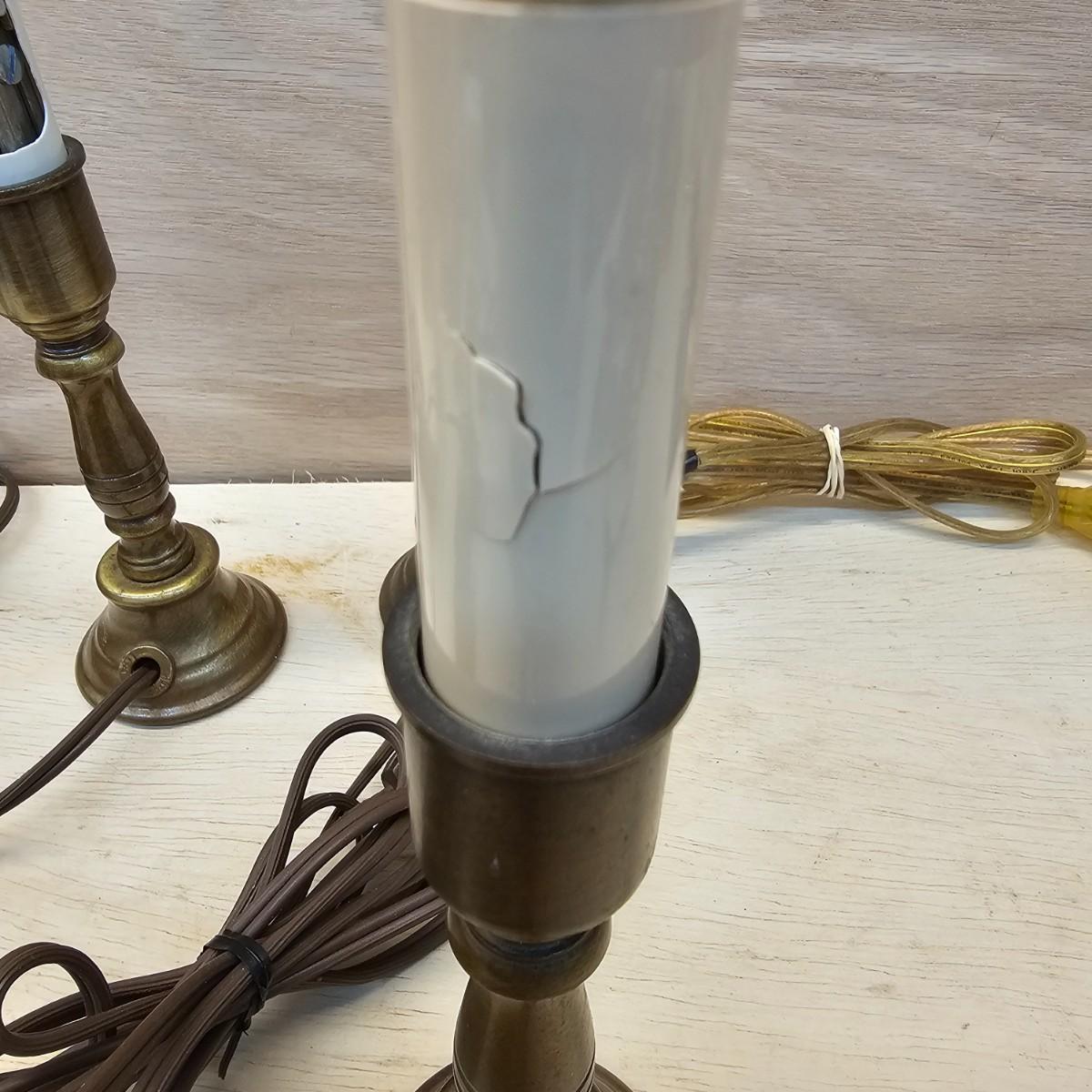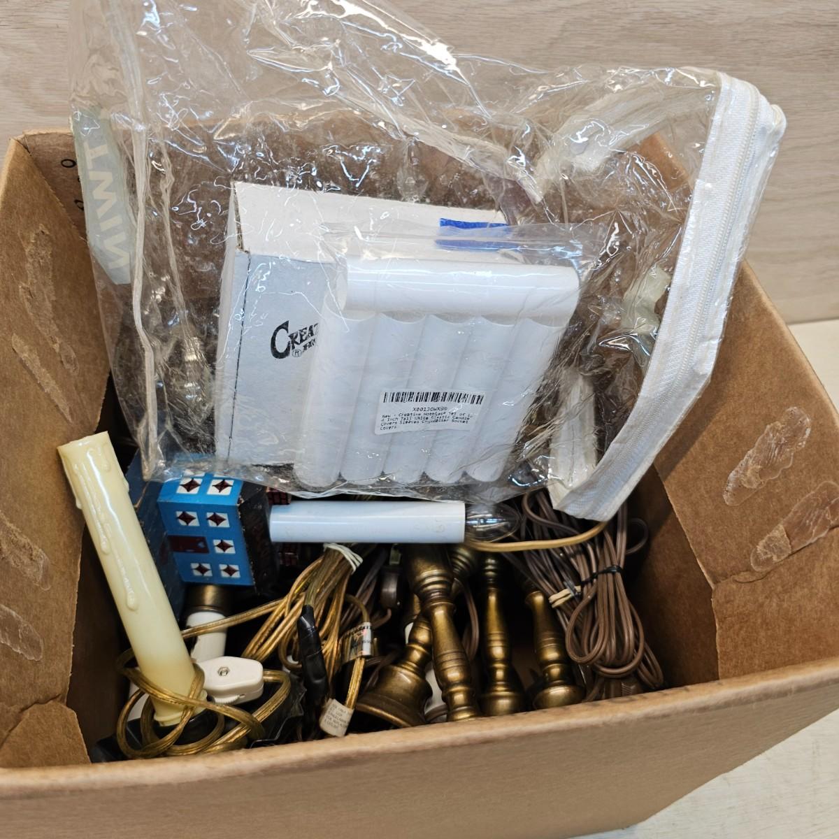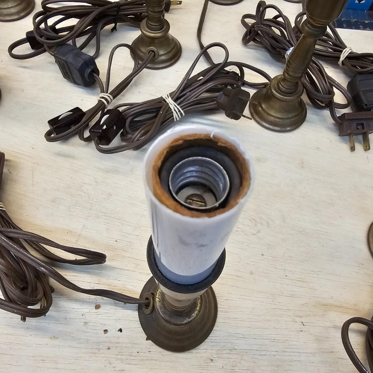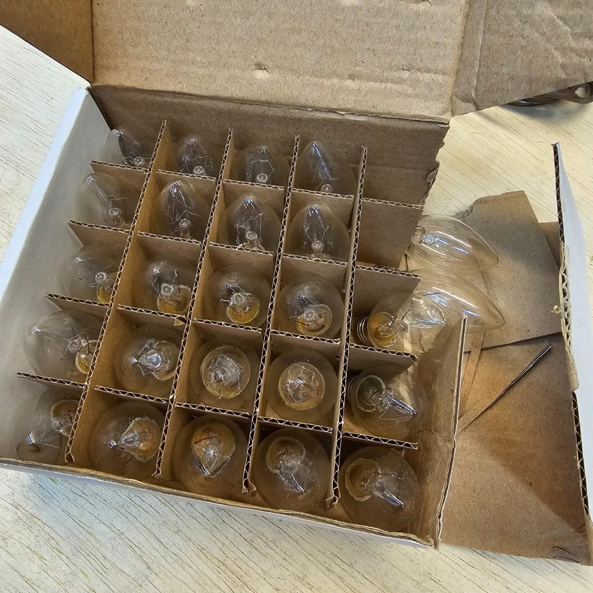 Fifteen brass base electric candelabras, most with inline switches. Approximately seven foot cords, with white socket covers at top. Takes C-7 size 7W bulb, an extra 25 pack included. Candles measure 2"D x 7.5"H. An extra package of replacement sleeves is also included. A few items have taped cords, may need to be replaced, and some will need new covers. Also includes two smaller plastic base Candles and a wooden cottage with candle, 4" x 2.5" x 7"H. All items powered on when plugged in. Some bulbs are LED style. See photos for details. Shipping available.