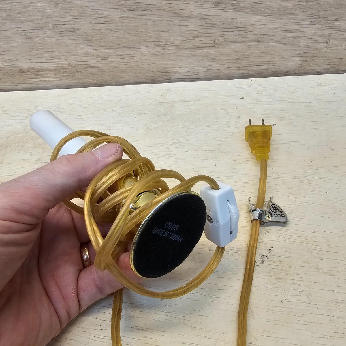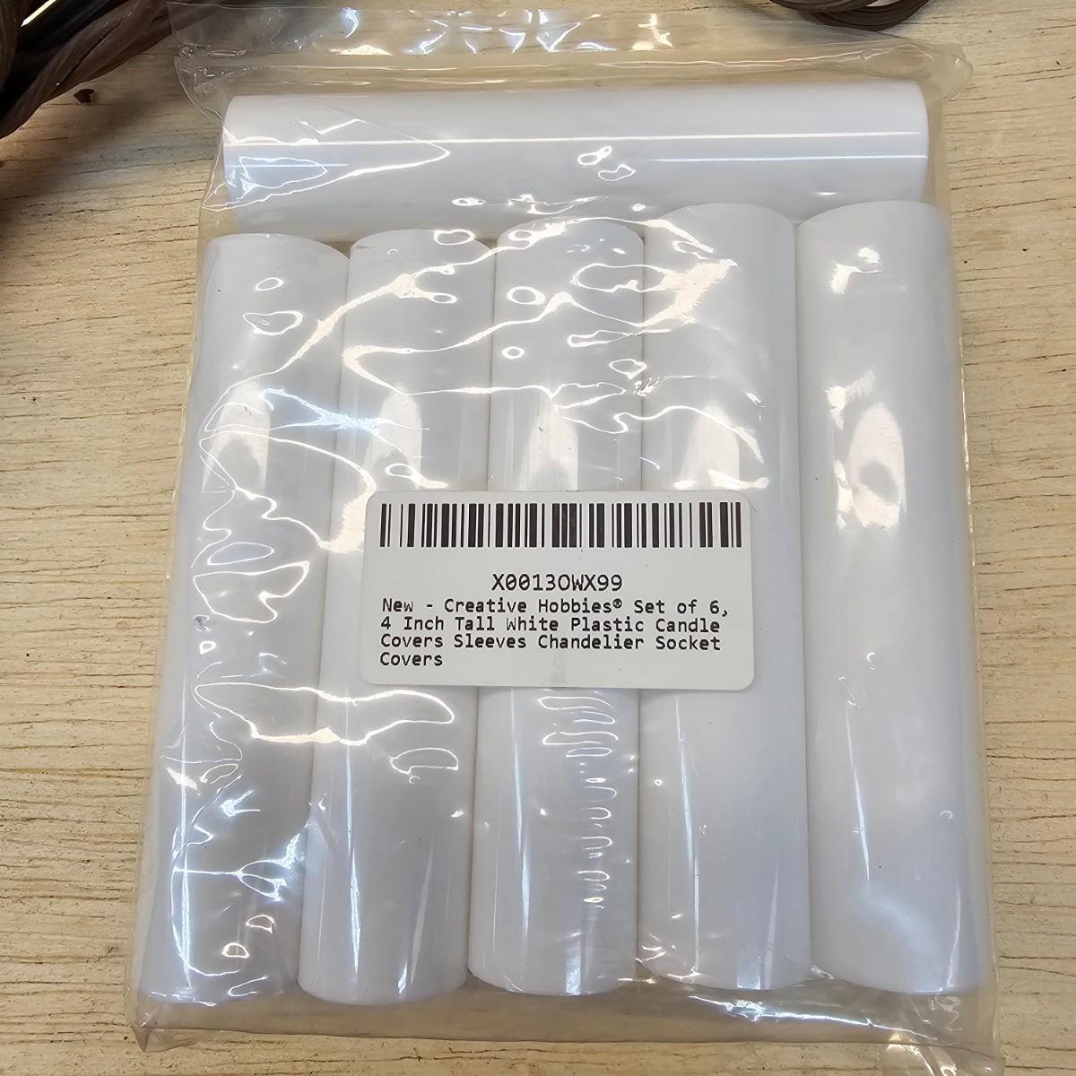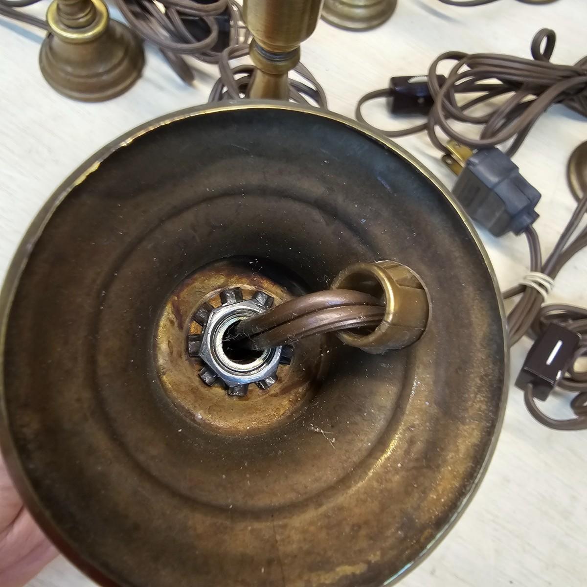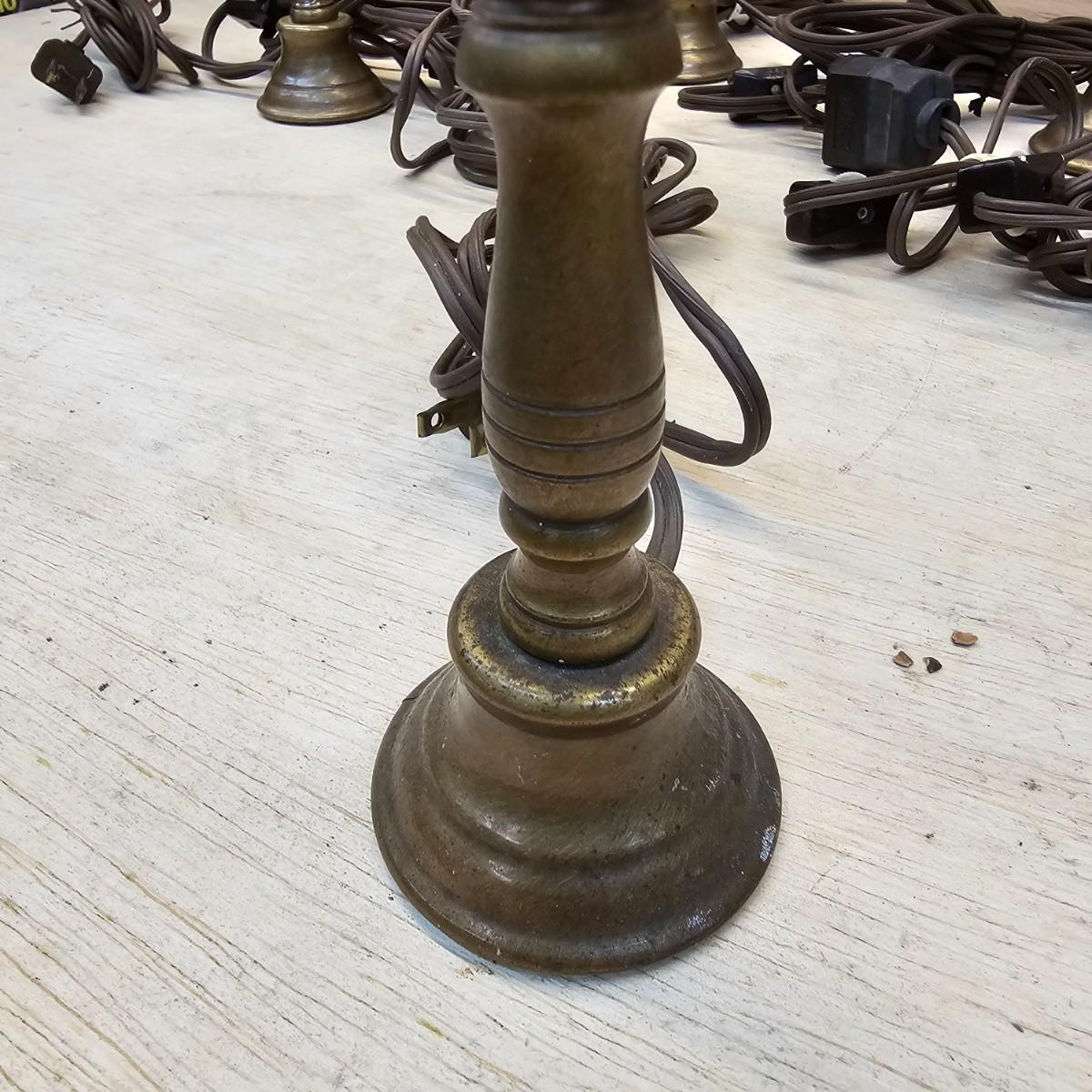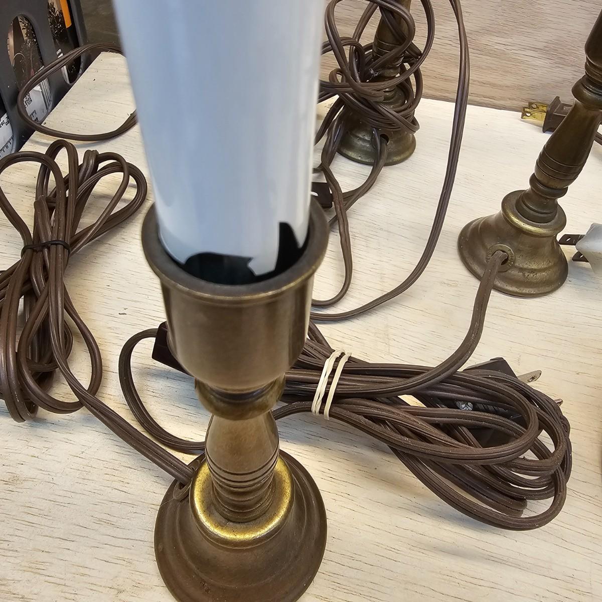 Fifteen brass base electric candelabras, most with inline switches. Approximately seven foot cords, with white socket covers at top. Takes C-7 size 7W bulb, an extra 25 pack included. Candles measure 2"D x 7.5"H. An extra package of replacement sleeves is also included. A few items have taped cords, may need to be replaced, and some will need new covers. Also includes two smaller plastic base Candles and a wooden cottage with candle, 4" x 2.5" x 7"H. All items powered on when plugged in. Some bulbs are LED style. See photos for details. Shipping available.