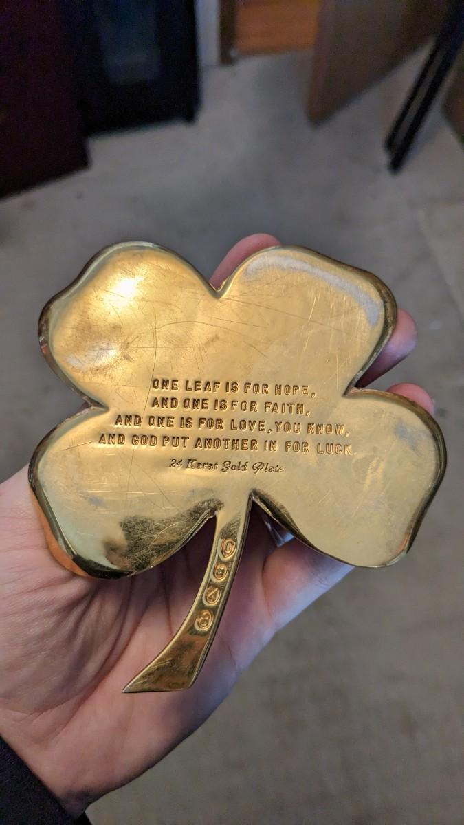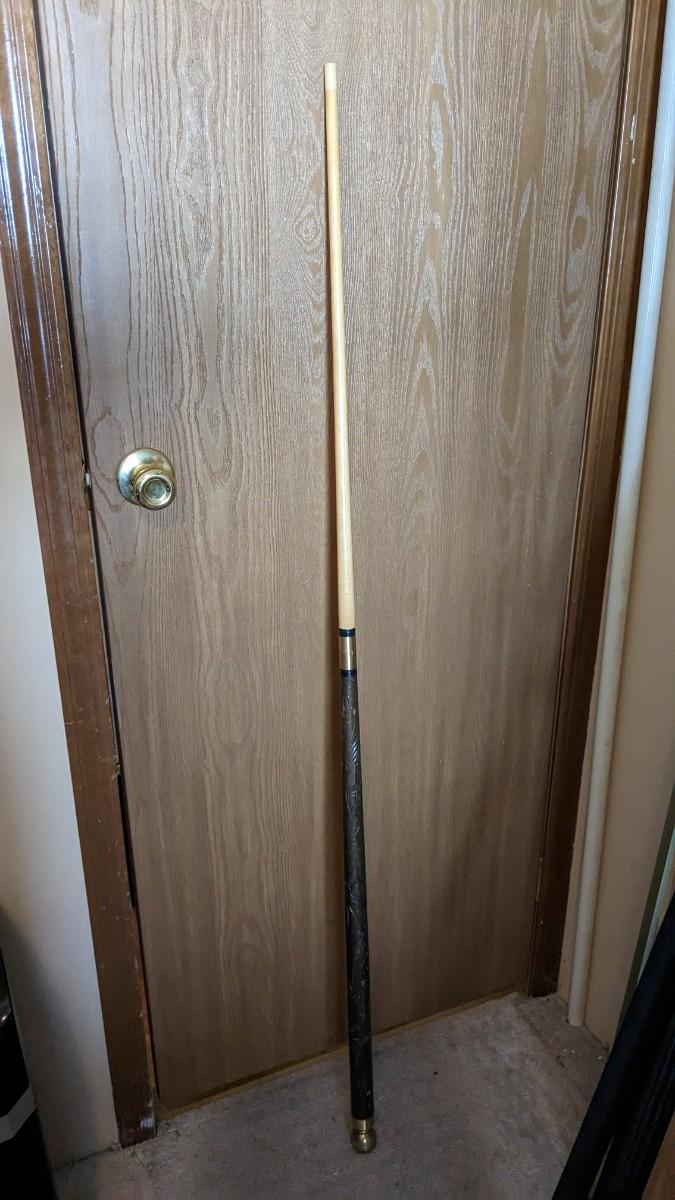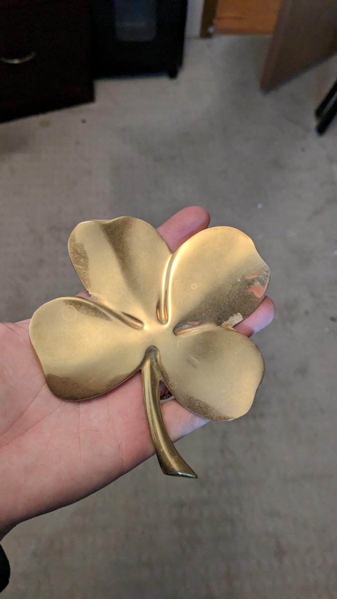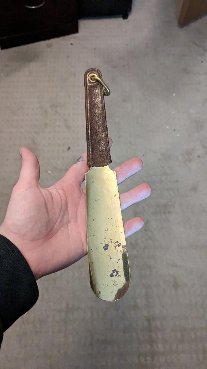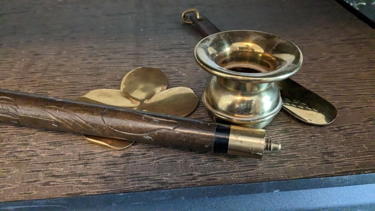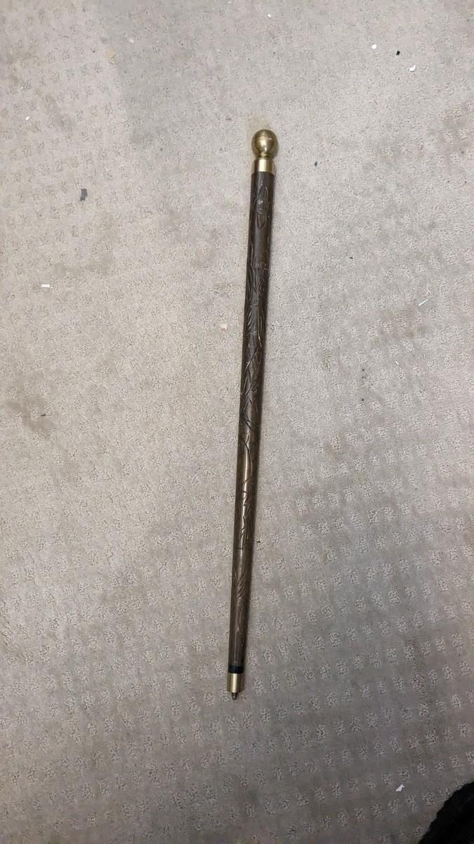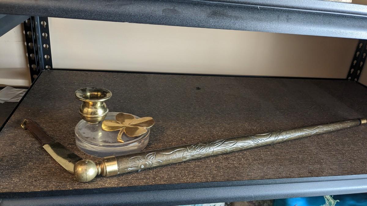a cute little collection of brass items including mini spittoon with marbles, 4 leaf clover, shoe horn, and carved cane/pool cue with brass tone knob. Note this piece is missing cane tip and cue tip. No shipping. bdrm2