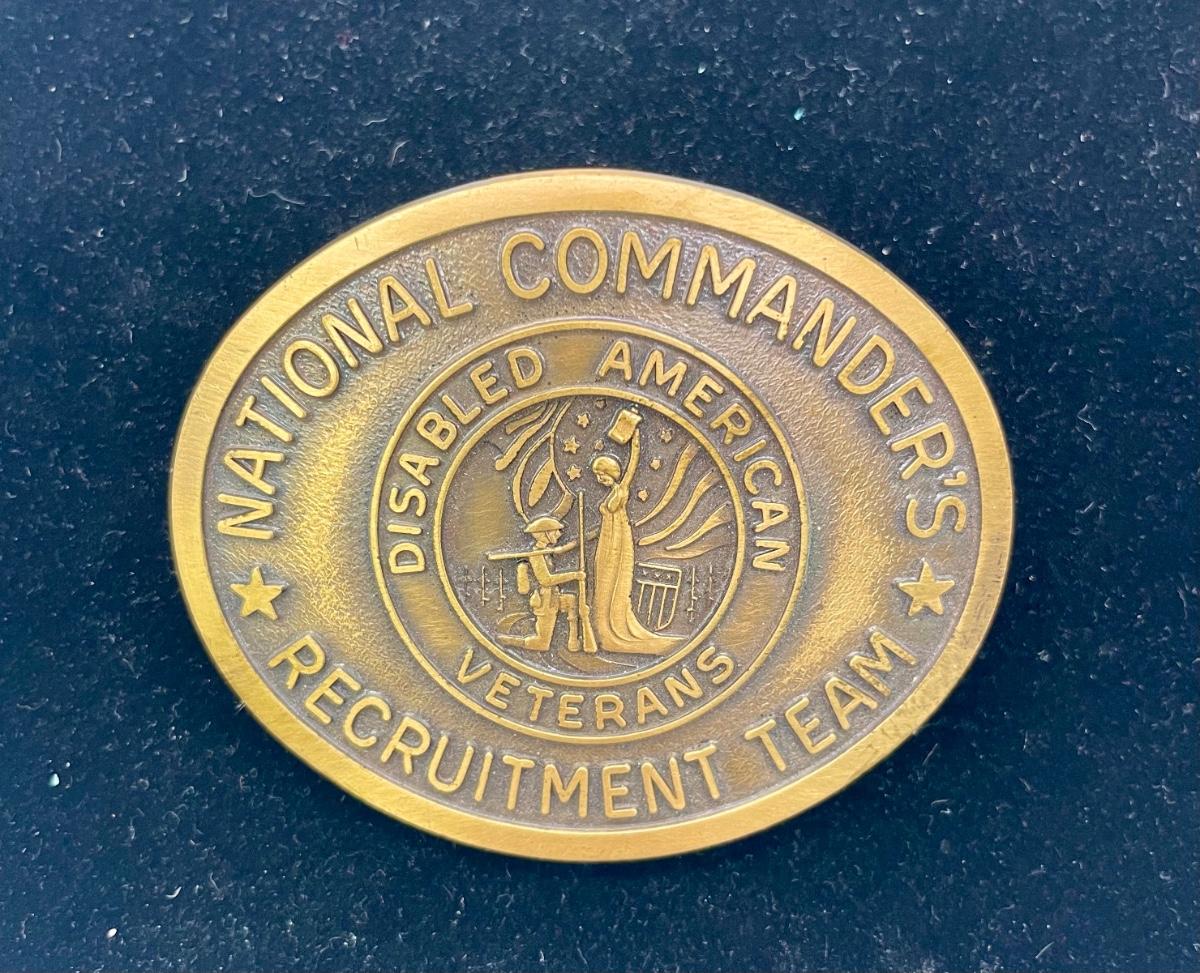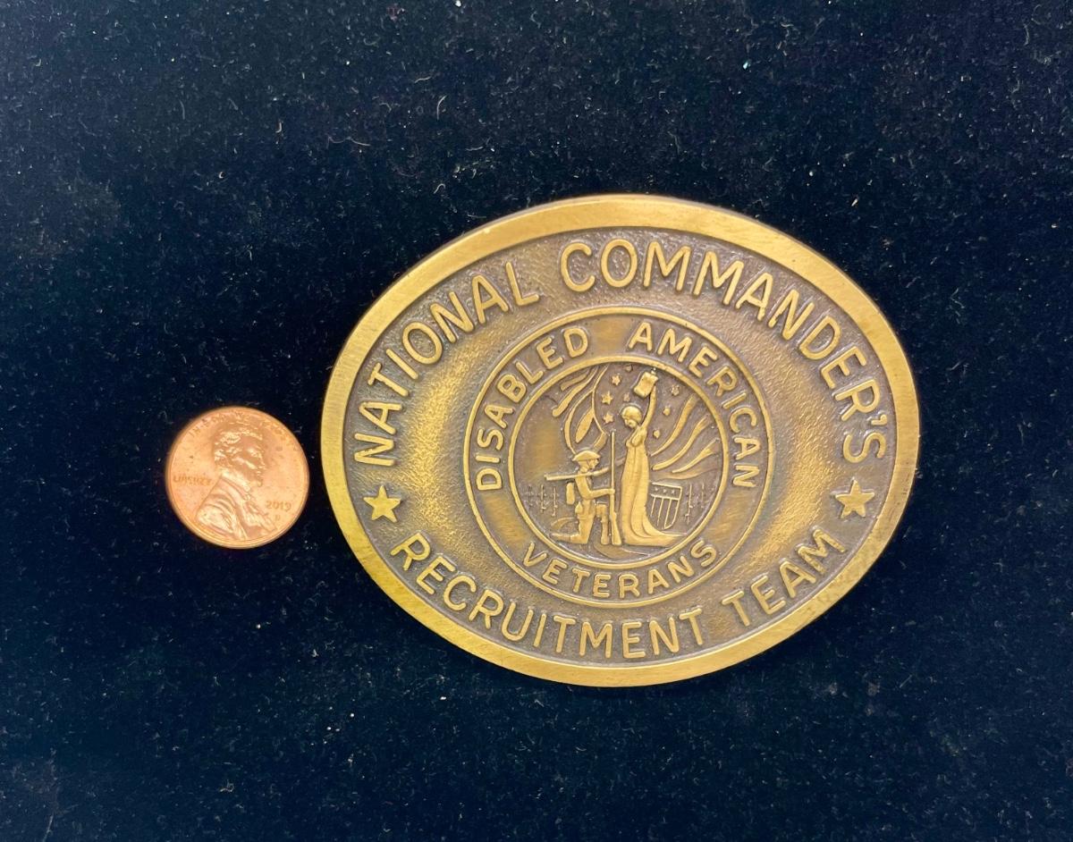 Belt buckle issued for the Disabled American Veterans. Signifies membership in the Nation Commander's Recruitment Team. Near new condition.