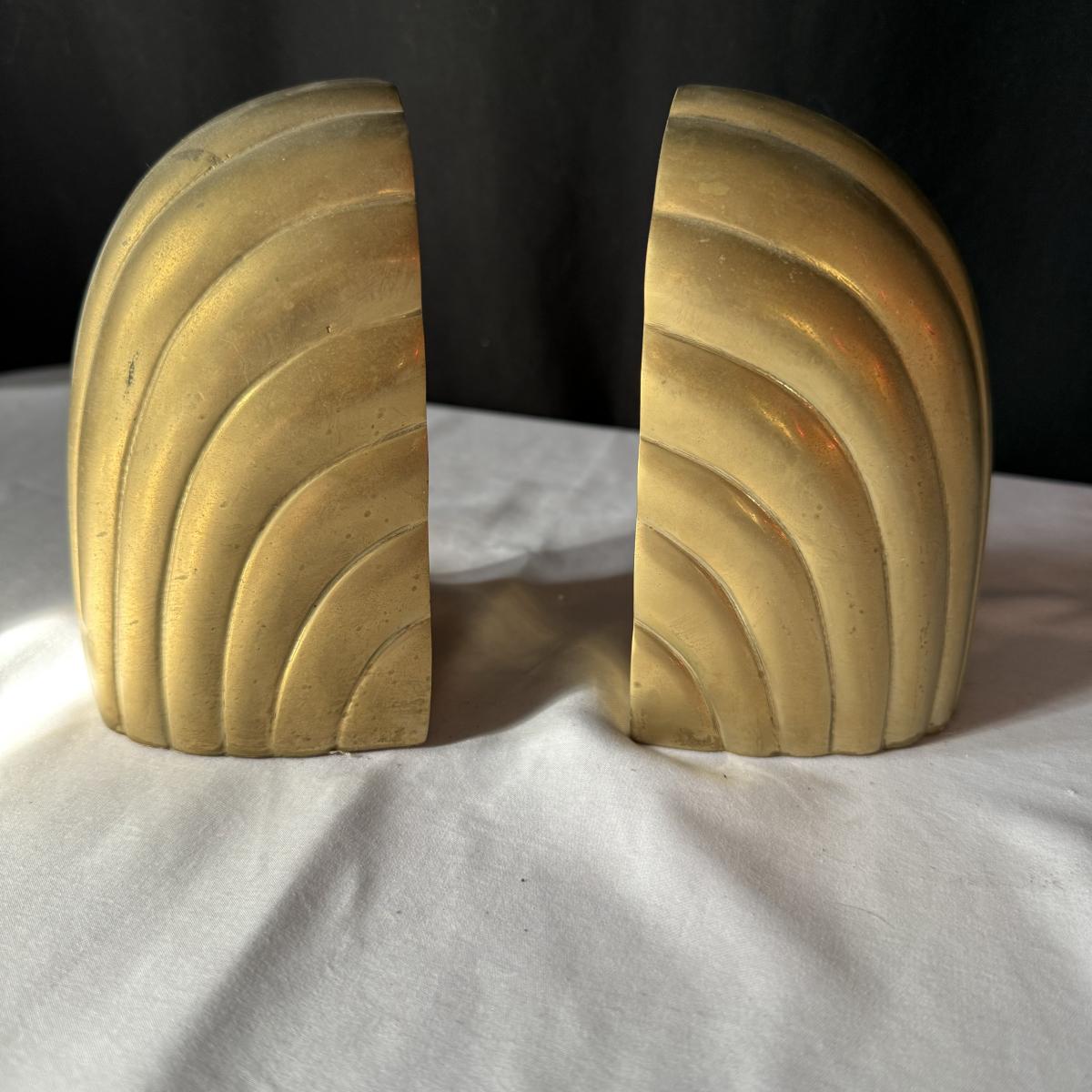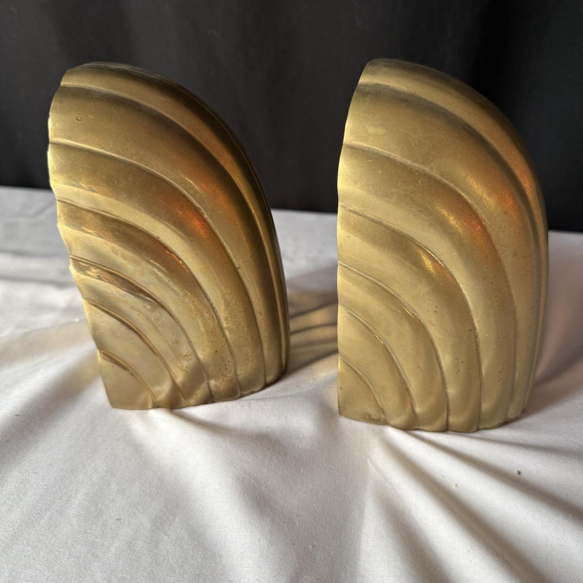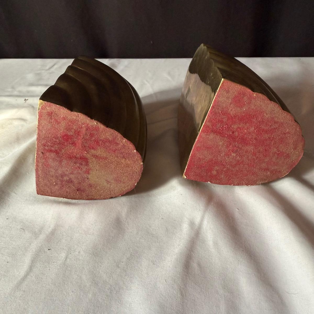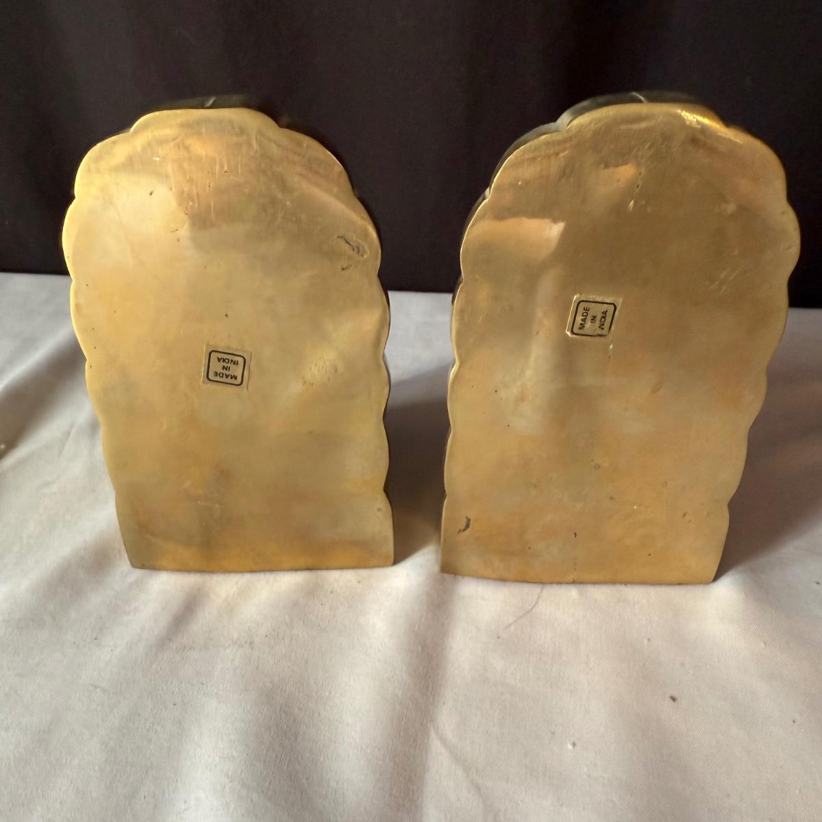 Two heavy book ends that appear to be plated by or made from brass. They each measure approximately 4” X 3” X 5.5”H.