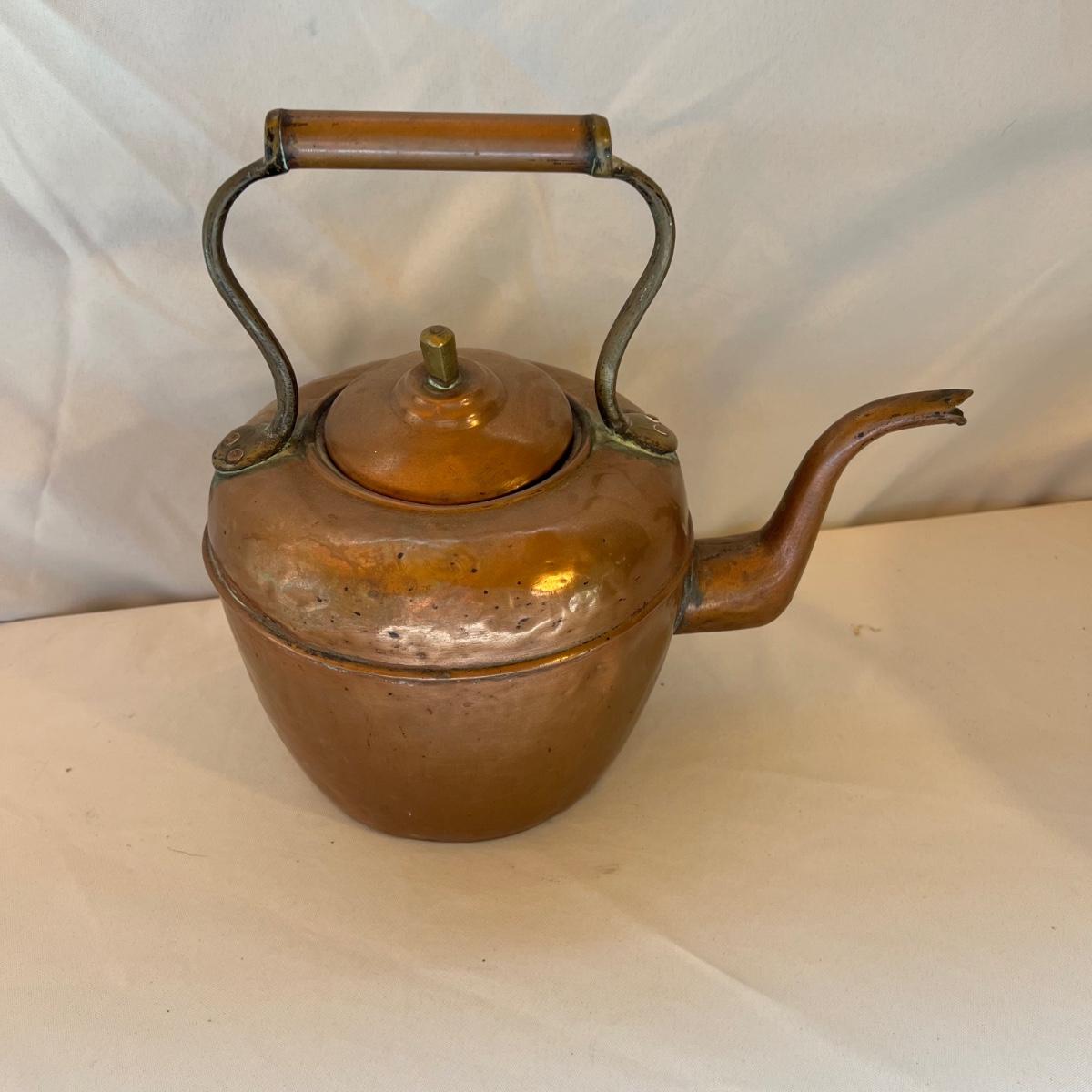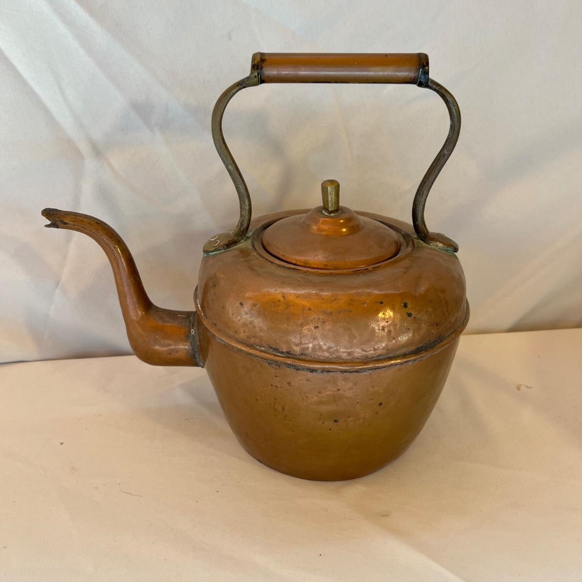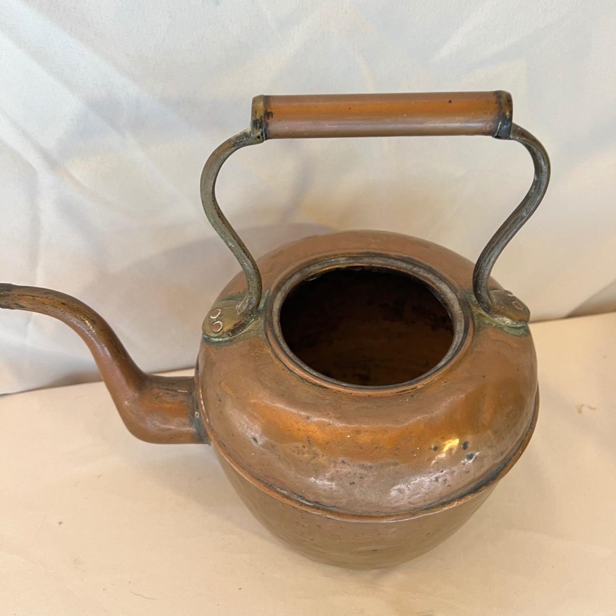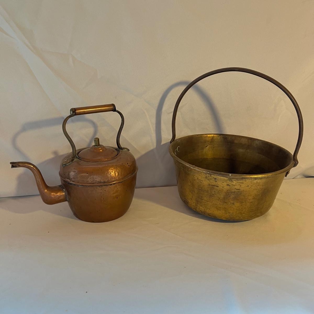 A beautiful brass bucket that appears to be hand crafted measures approximately 13”D x 14”H. The copper kettle has a riveted handle and a spout, it measures 8”D x 11”H.