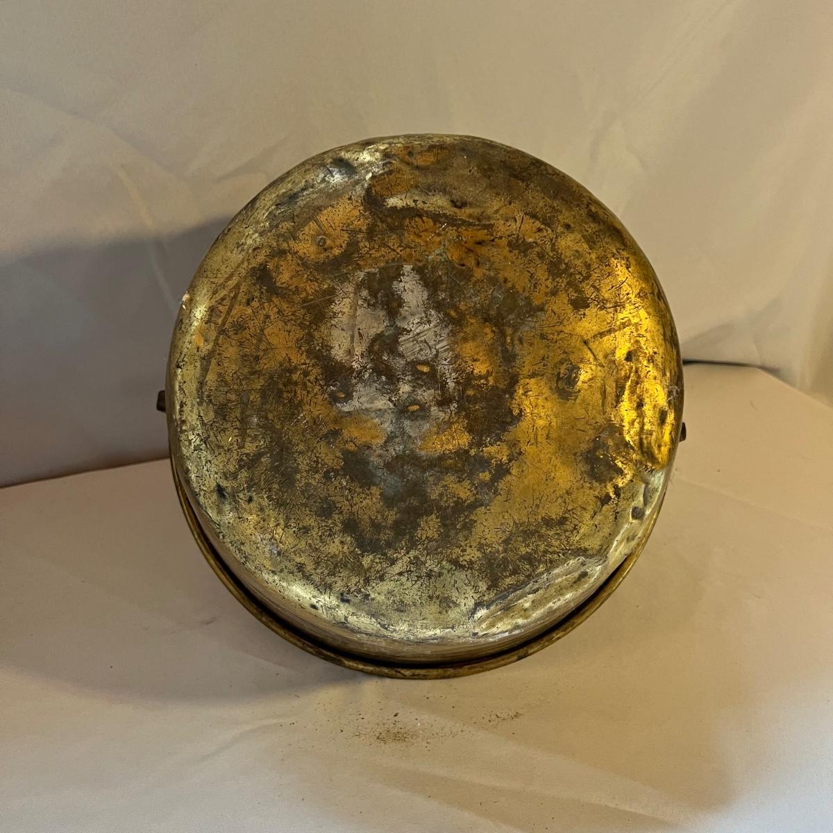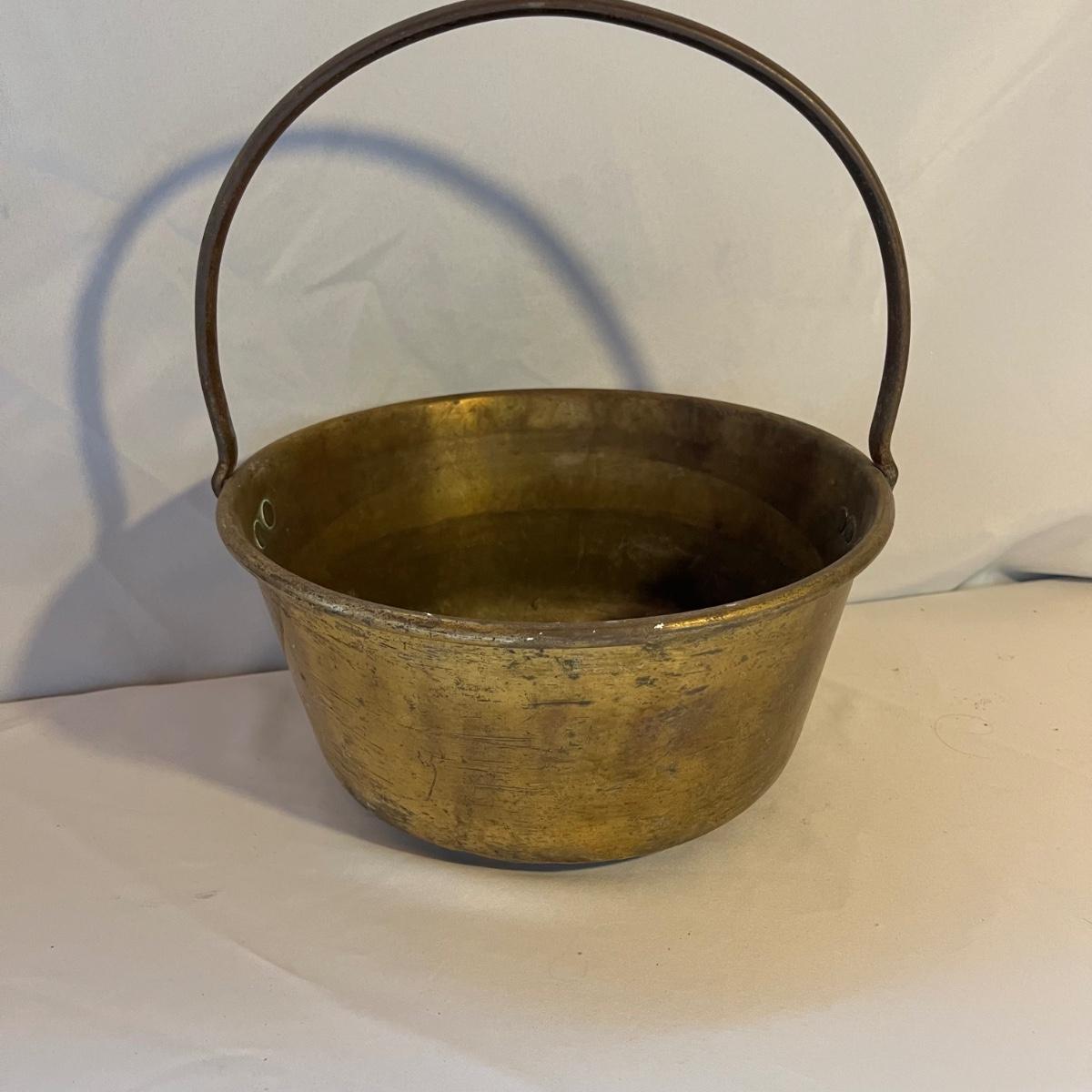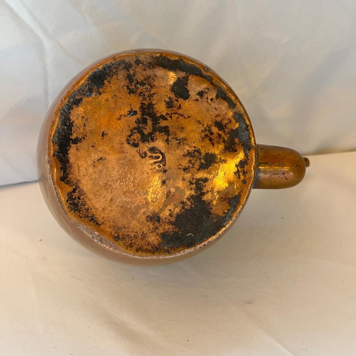 A beautiful brass bucket that appears to be hand crafted measures approximately 13”D x 14”H. The copper kettle has a riveted handle and a spout, it measures 8”D x 11”H.