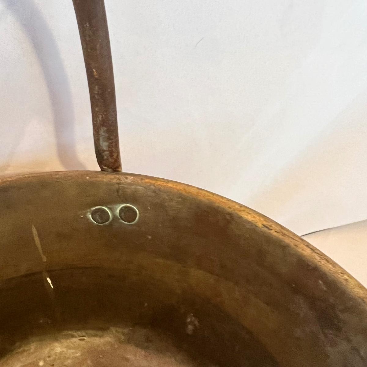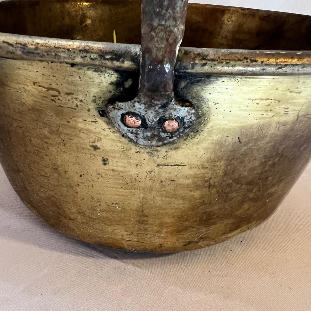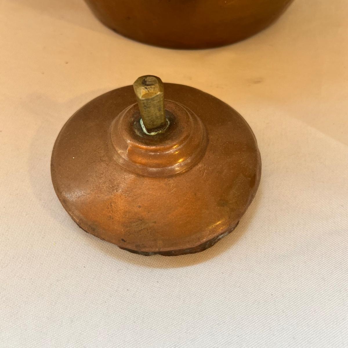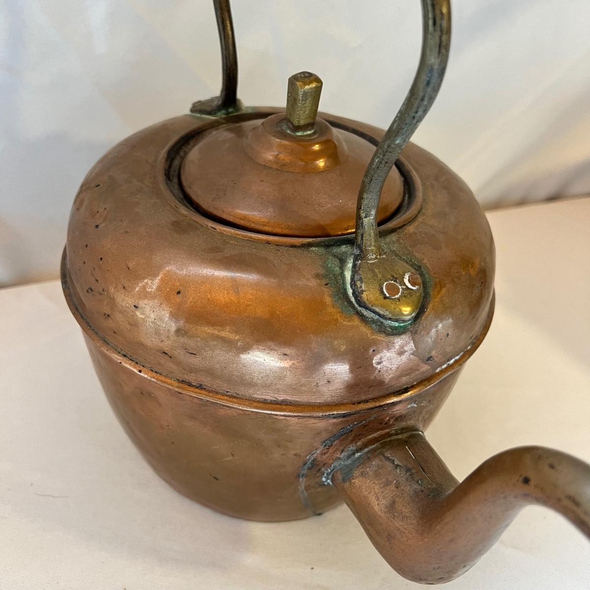 A beautiful brass bucket that appears to be hand crafted measures approximately 13”D x 14”H. The copper kettle has a riveted handle and a spout, it measures 8”D x 11”H.