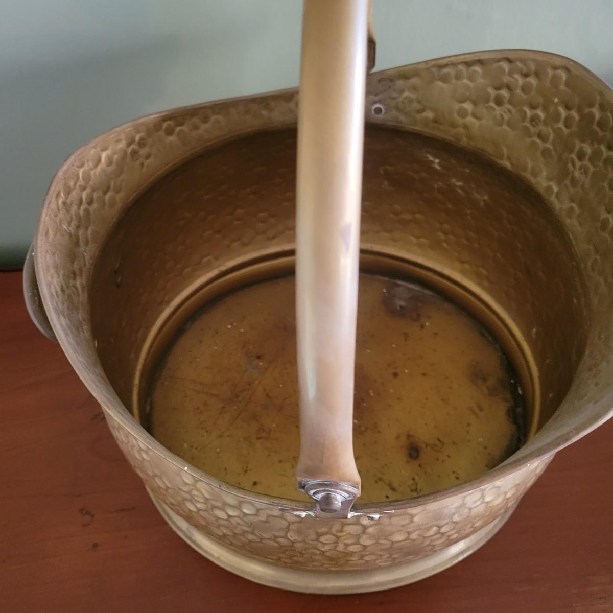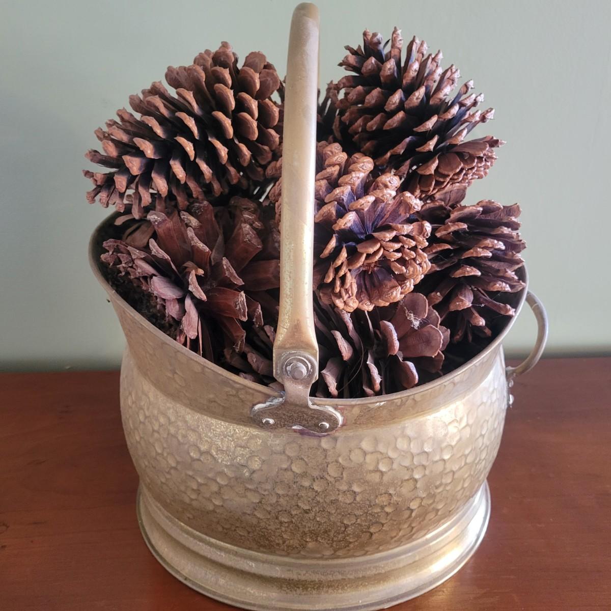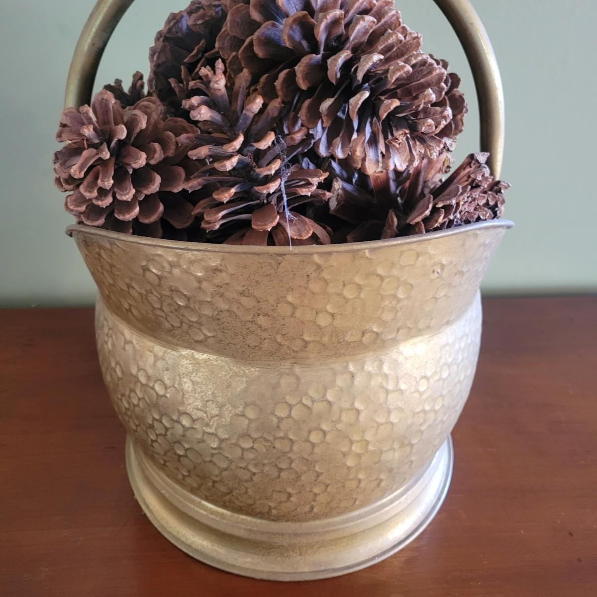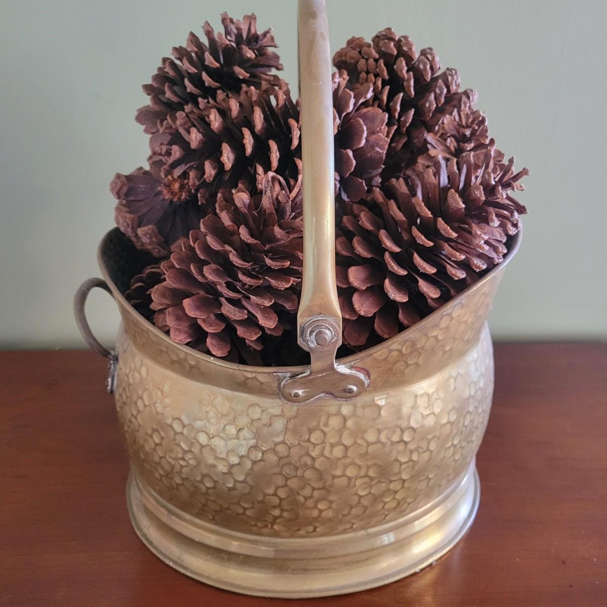 A brass bucket and pine cones in good condition with no notable damage. The brass features a pivoting handle, a hammered exterior and was made in England. Included is an assortment of decorative pine cones. Measures approximately 12" x 14.5". Shipping available