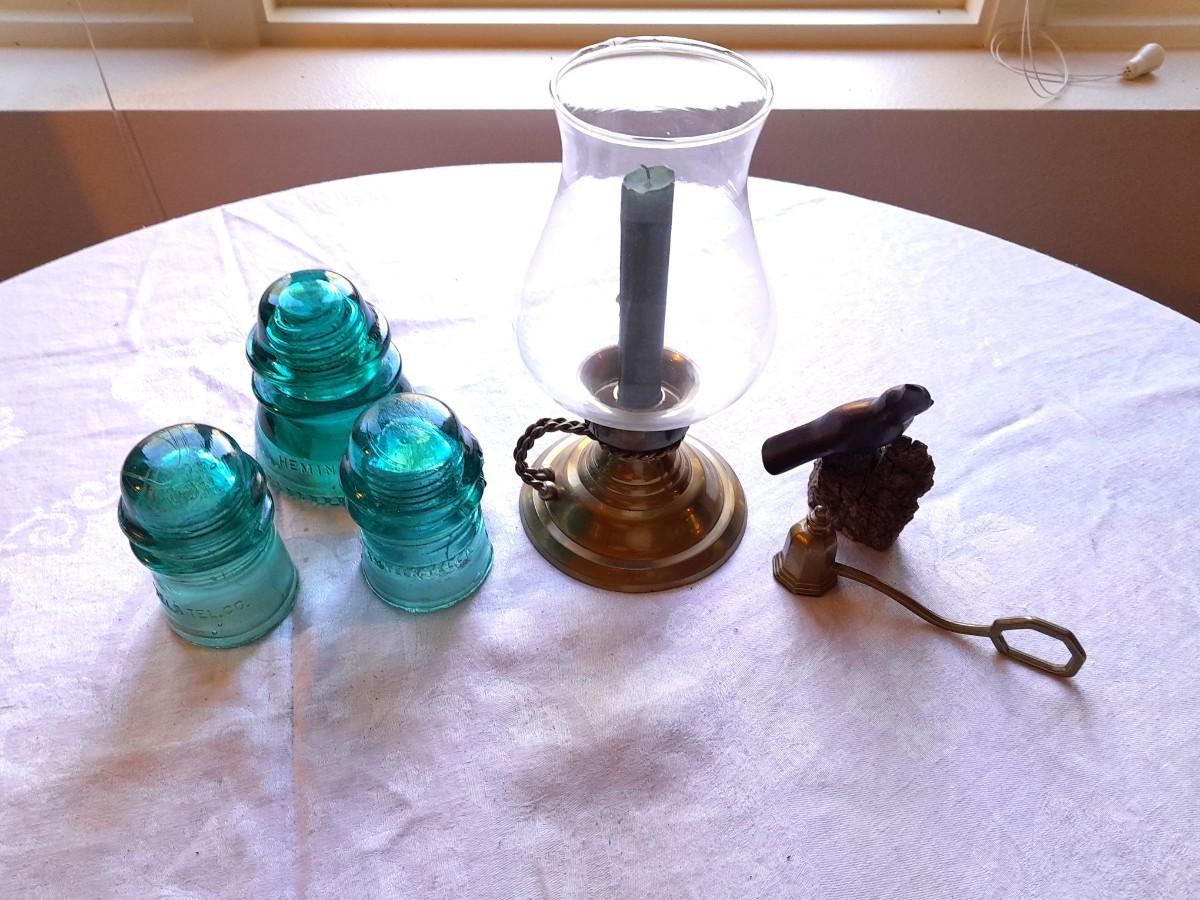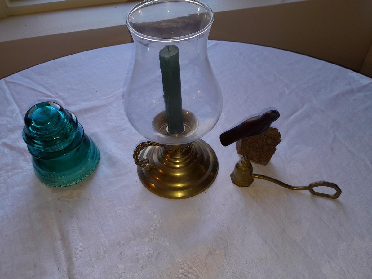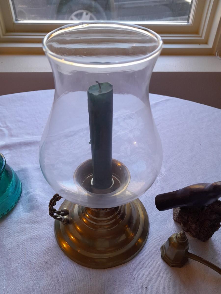 BRASS CANDLE SCONCE WITH GLASS CHIMNEY, COLORED GLASS INSULATORS