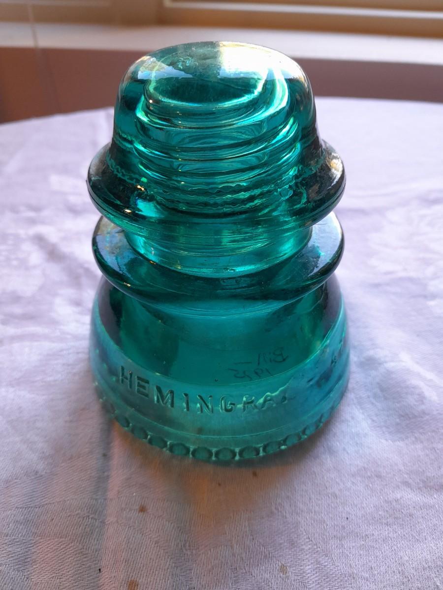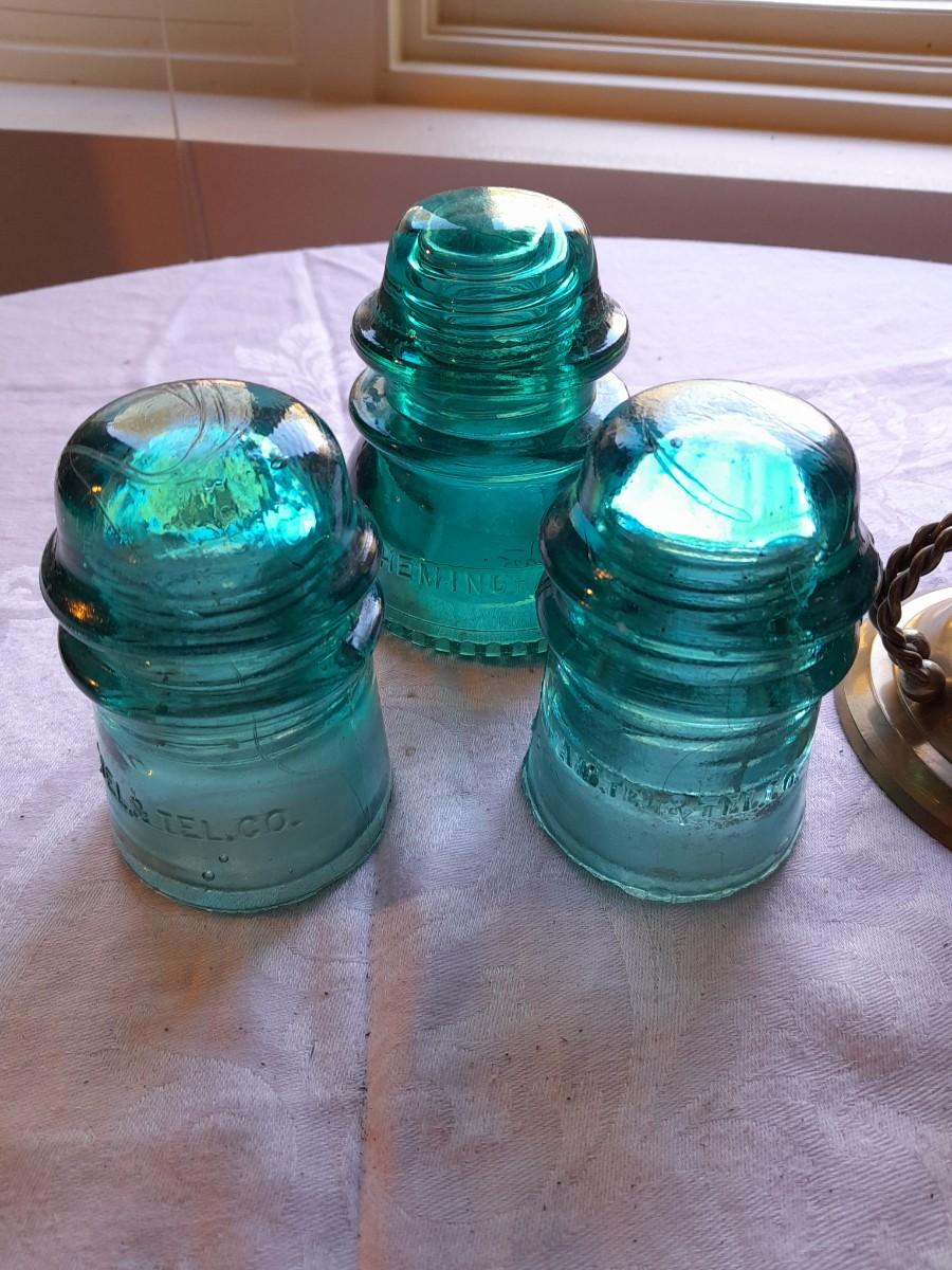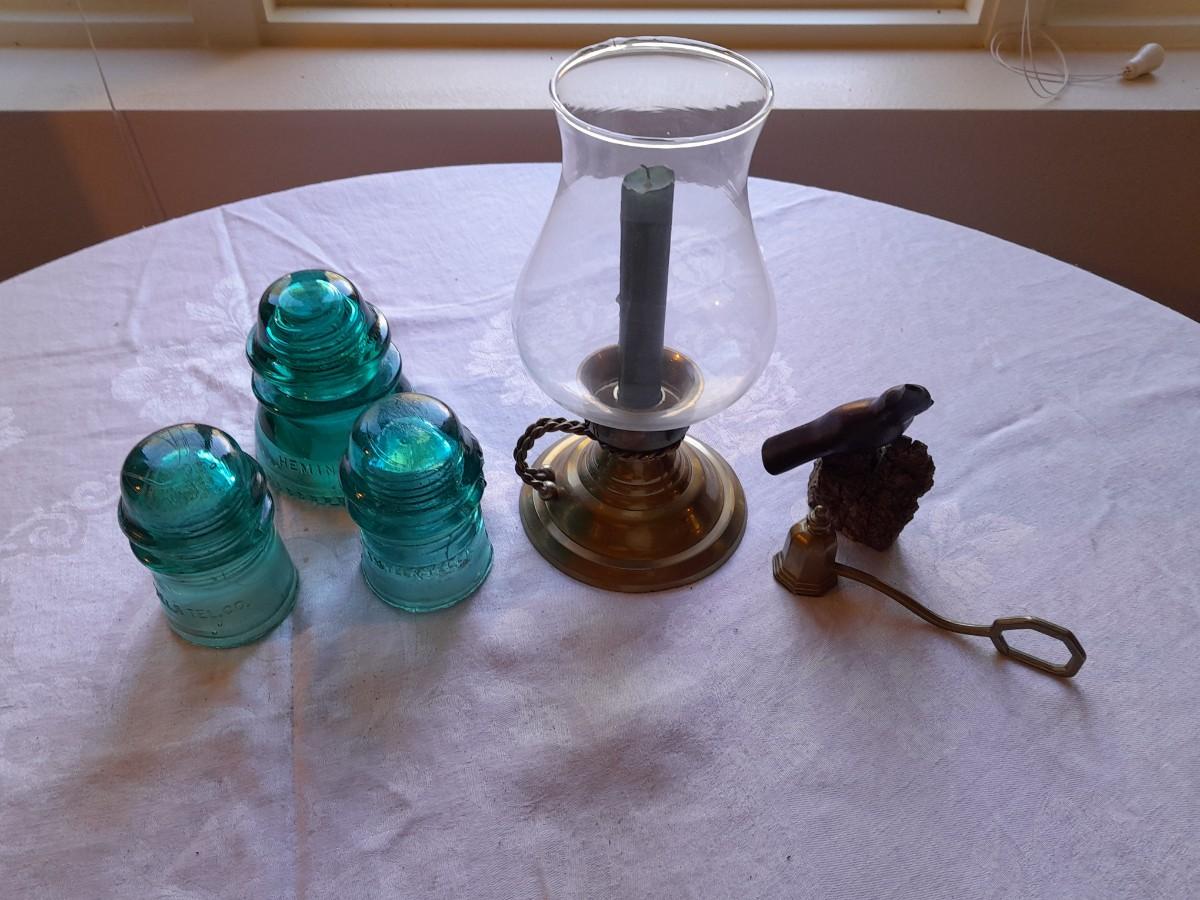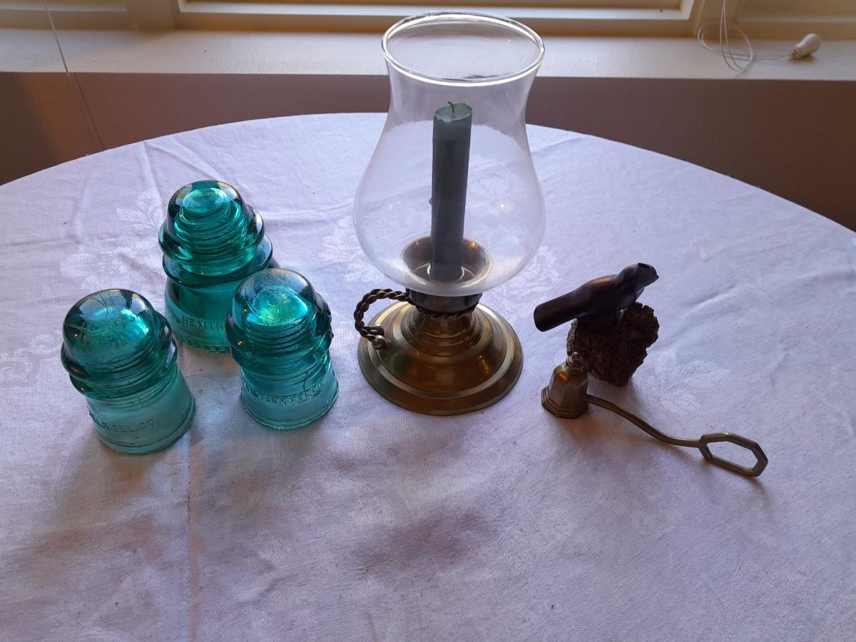 BRASS CANDLE SCONCE WITH GLASS CHIMNEY, COLORED GLASS INSULATORS