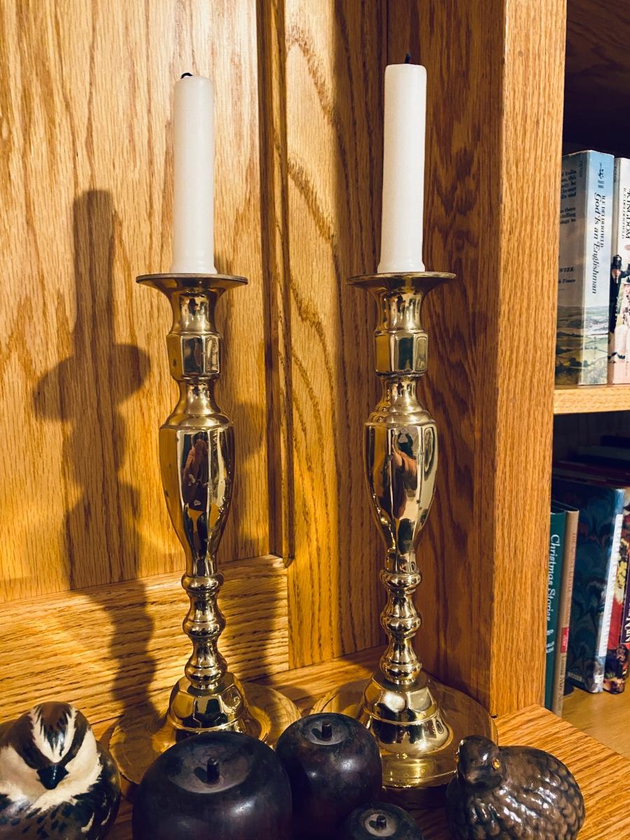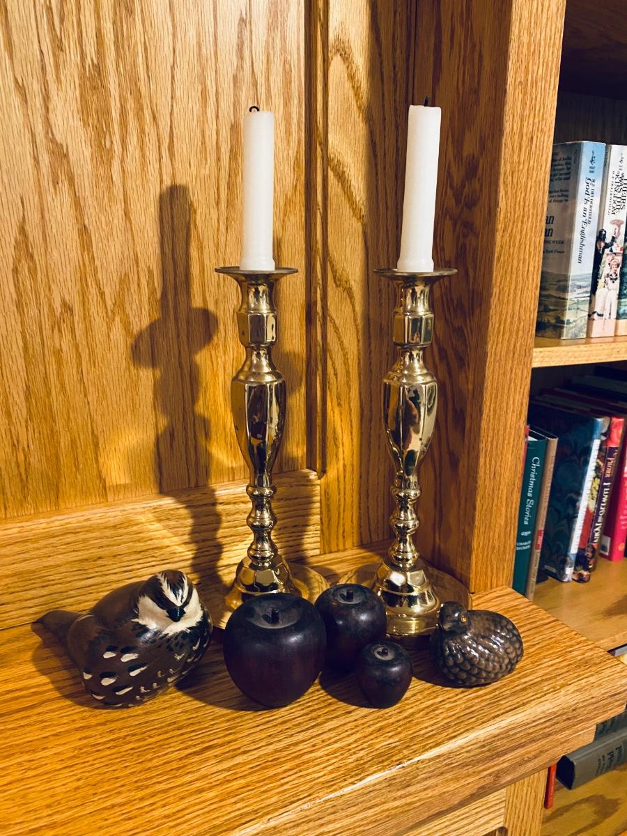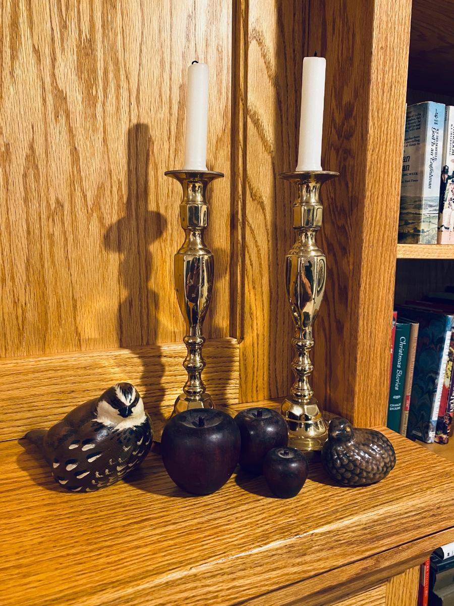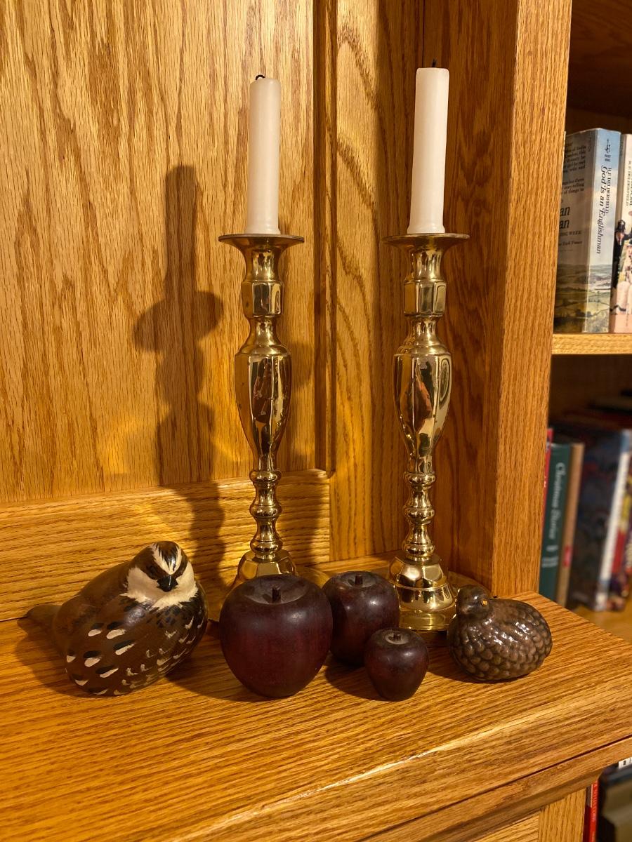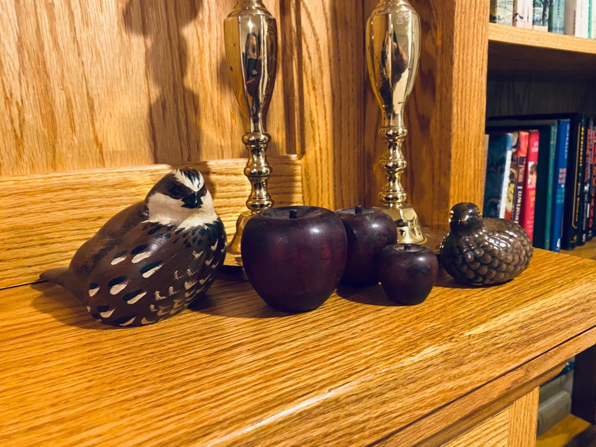 BRASS CANDLESTICK HOLDERS, WOODEN APPLES AND 2 QUAILS