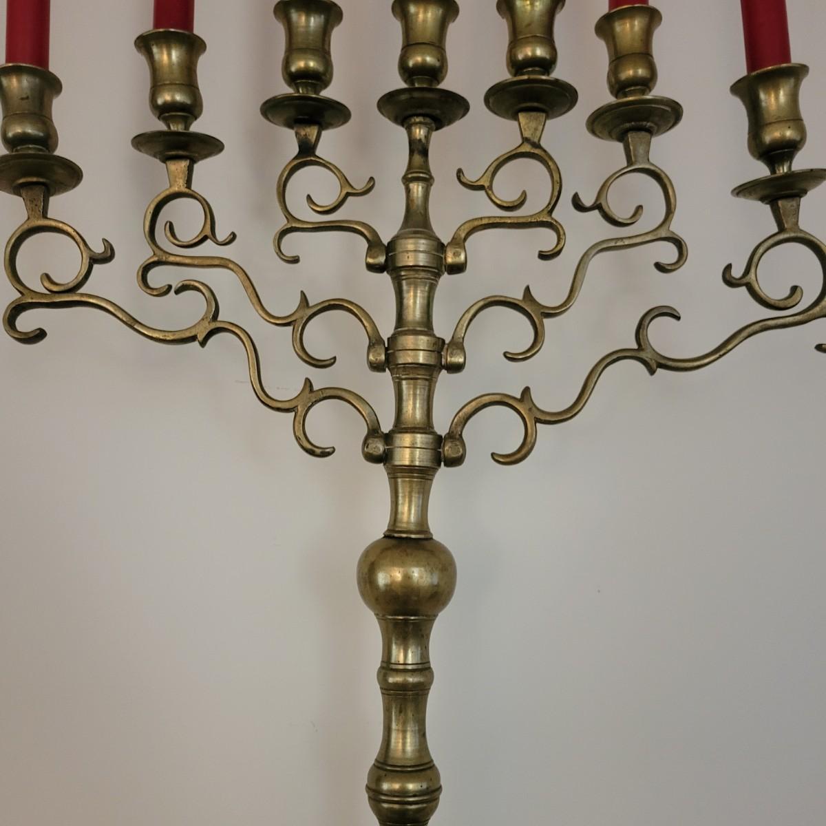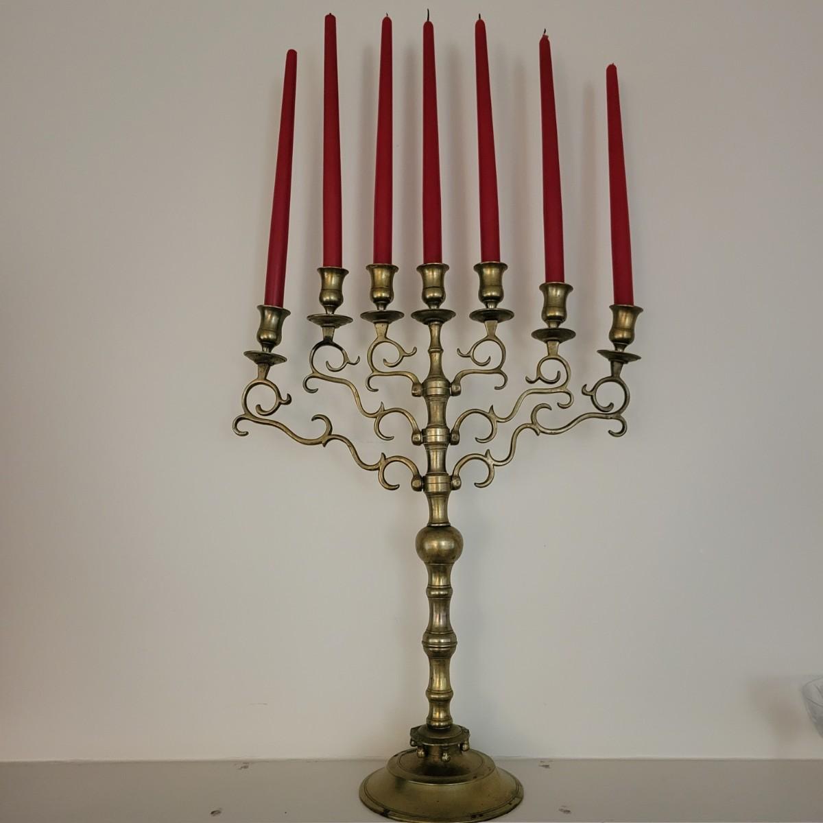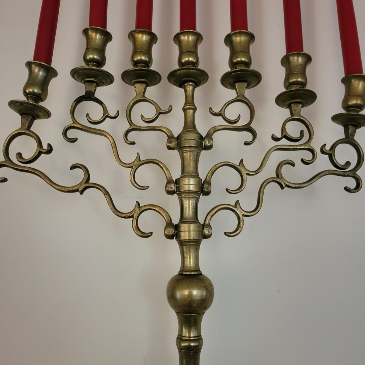 A brass candelabra in good condition with some minor tarnish on its base. This piece features seven candle holders and ornate arms supporting them. Each arm also rotates. Measures approximately 17" x 7" x 21.5. Shipping available