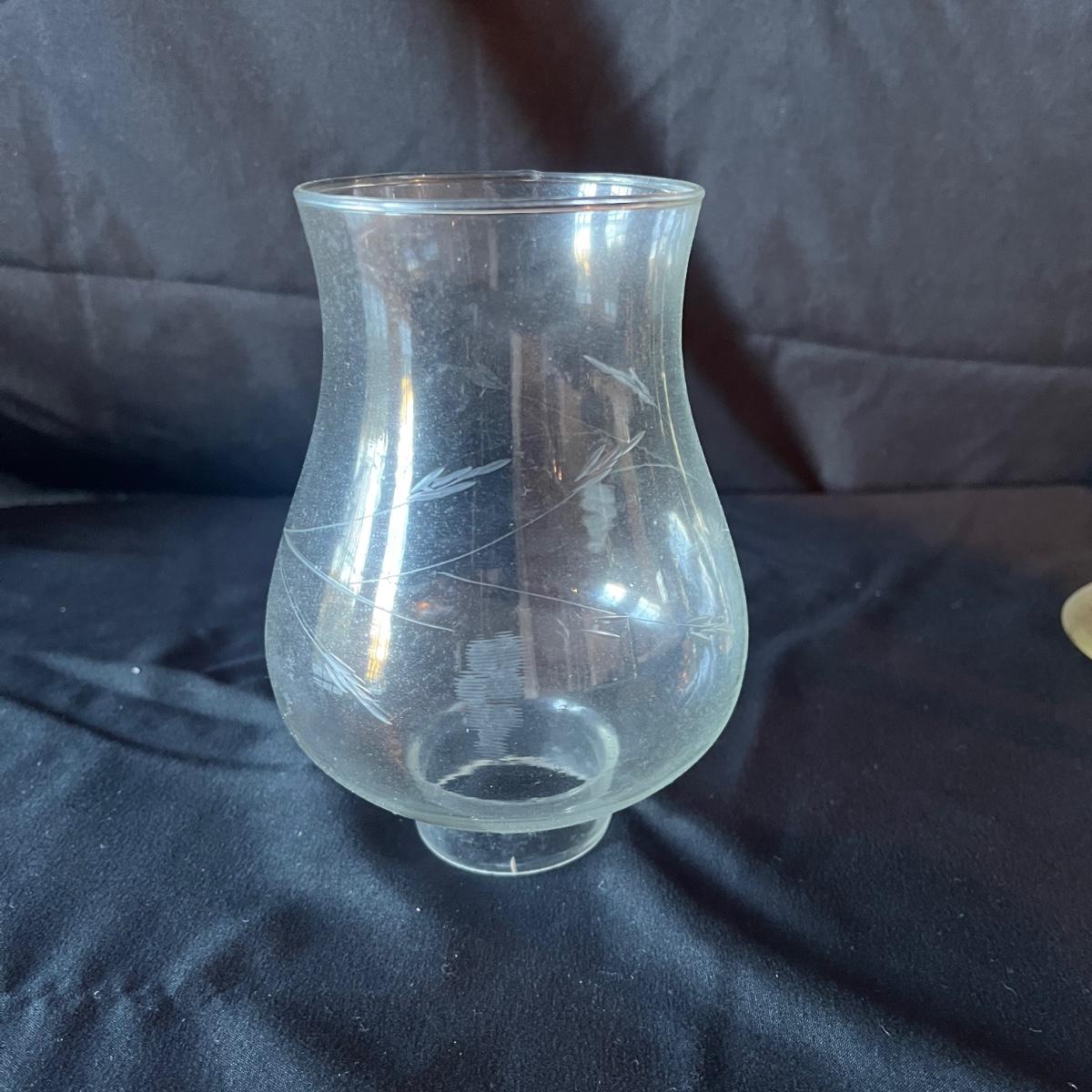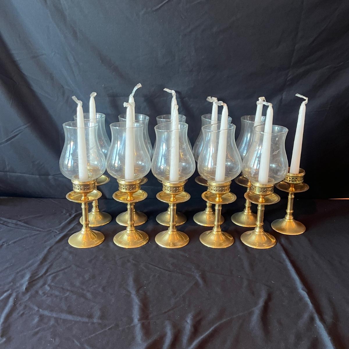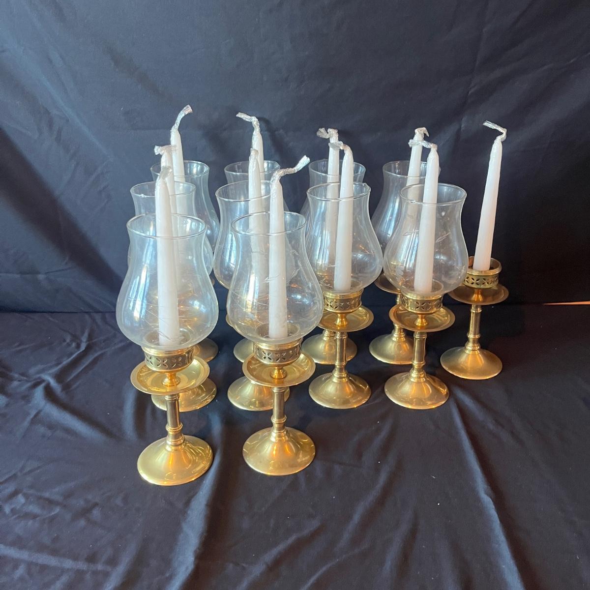 Lot includes 11 brass candleholders with 10 etched glass hurricane pieces. Also includes 12 candles. Candleholders with glass measure 4”D x 10.5”H.