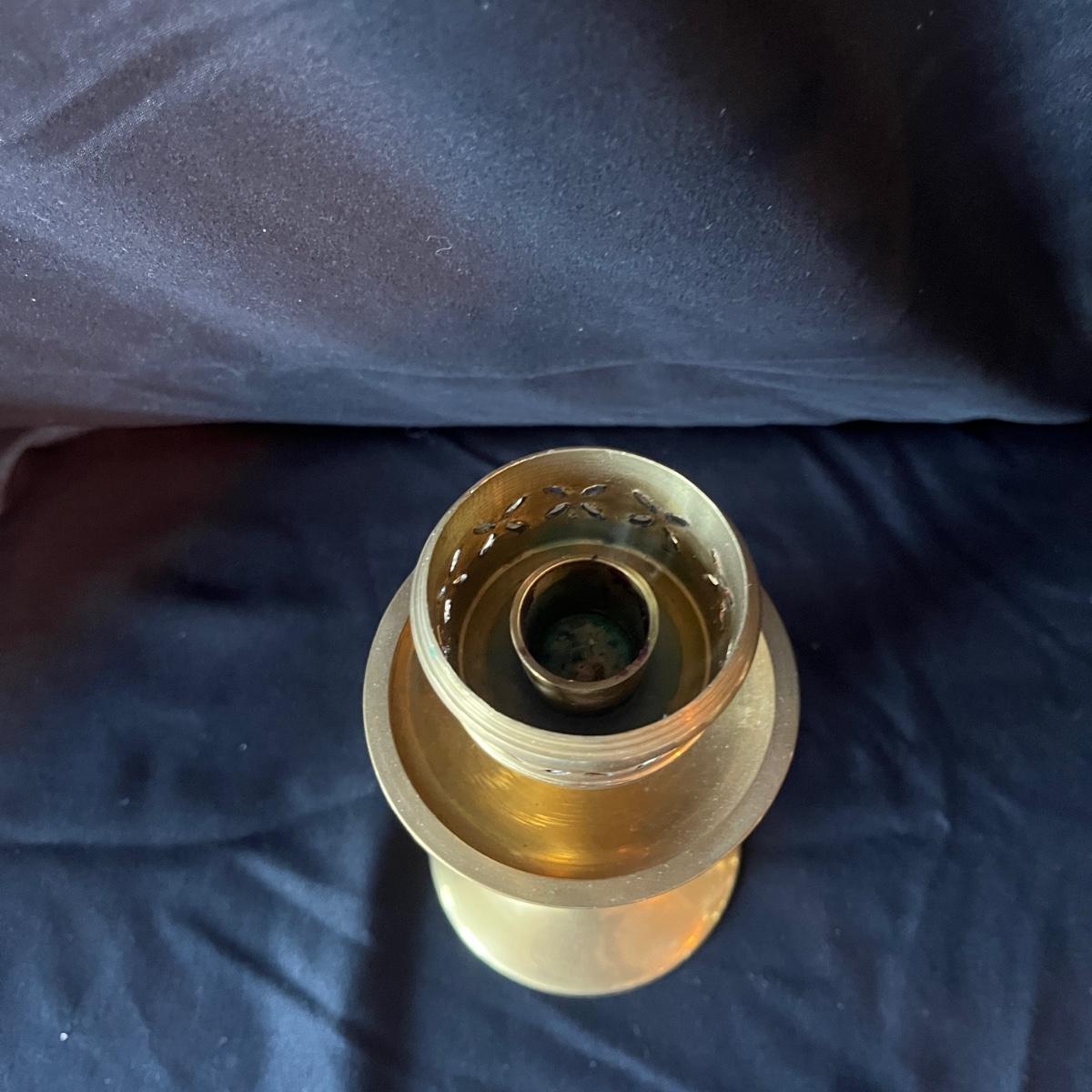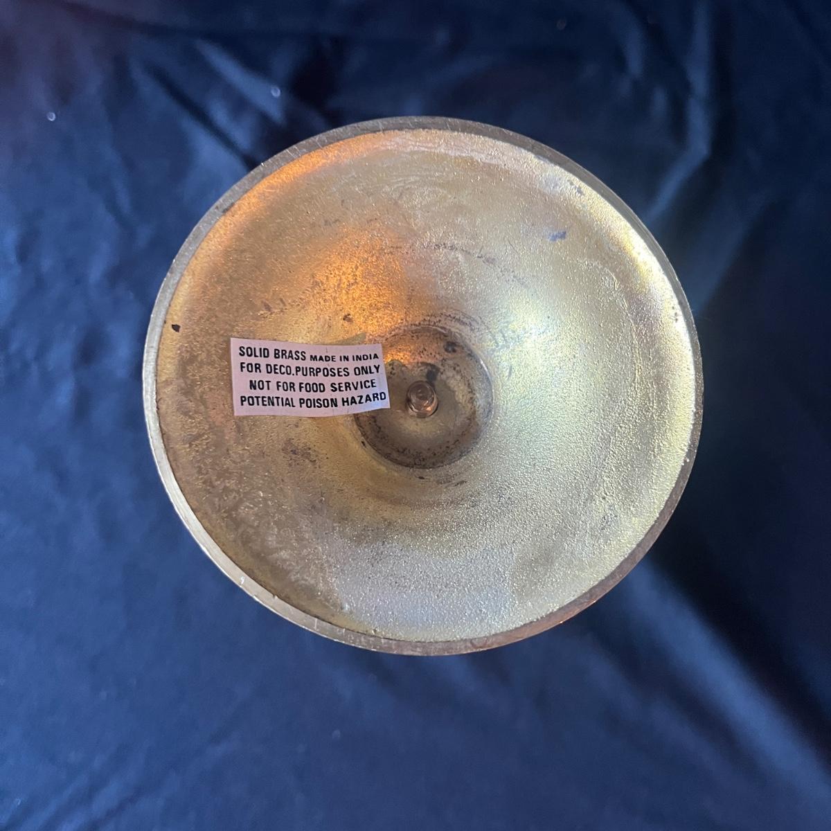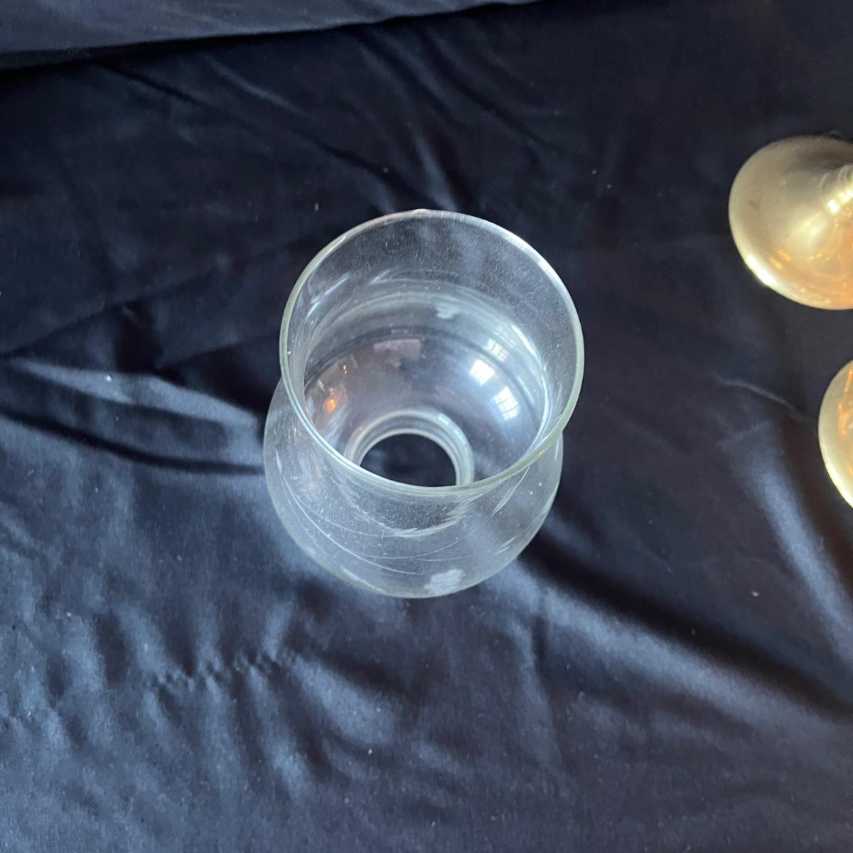 Lot includes 11 brass candleholders with 10 etched glass hurricane pieces. Also includes 12 candles. Candleholders with glass measure 4”D x 10.5”H.