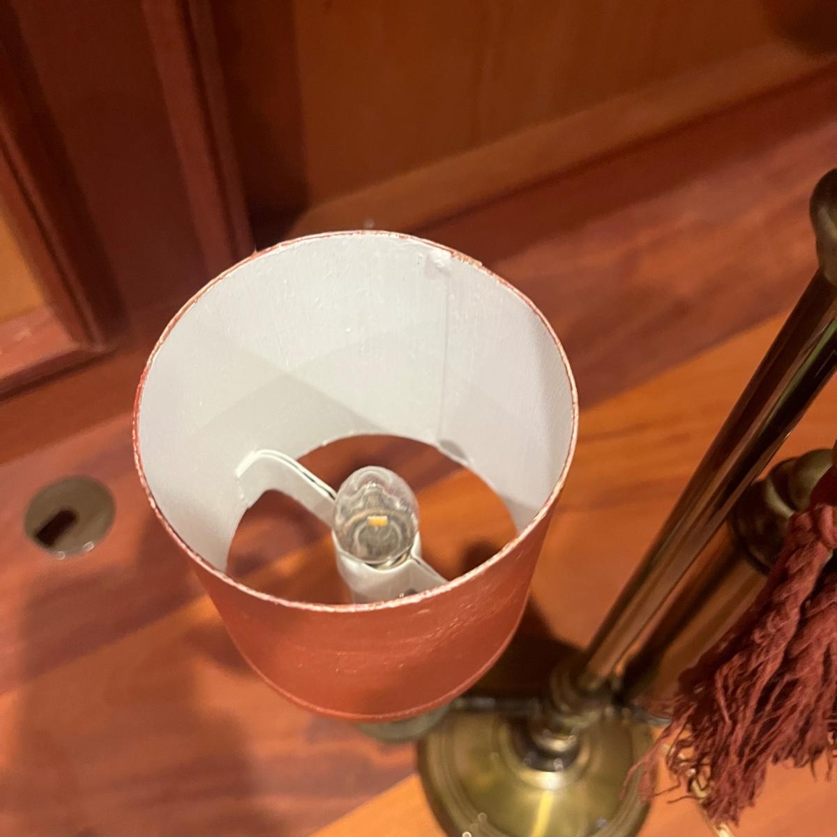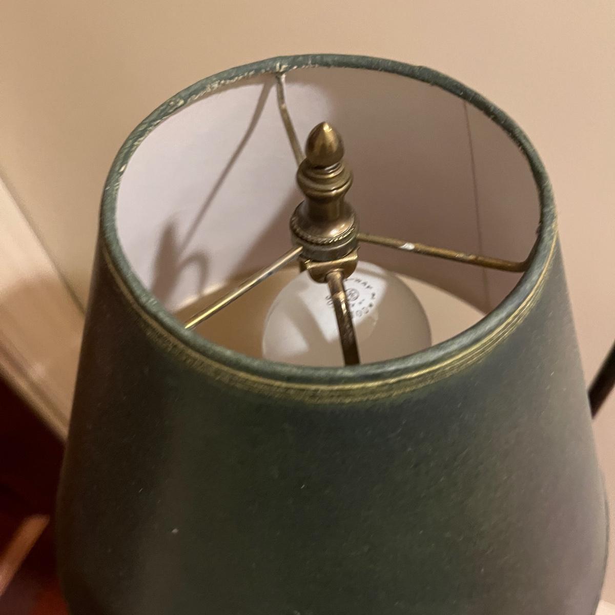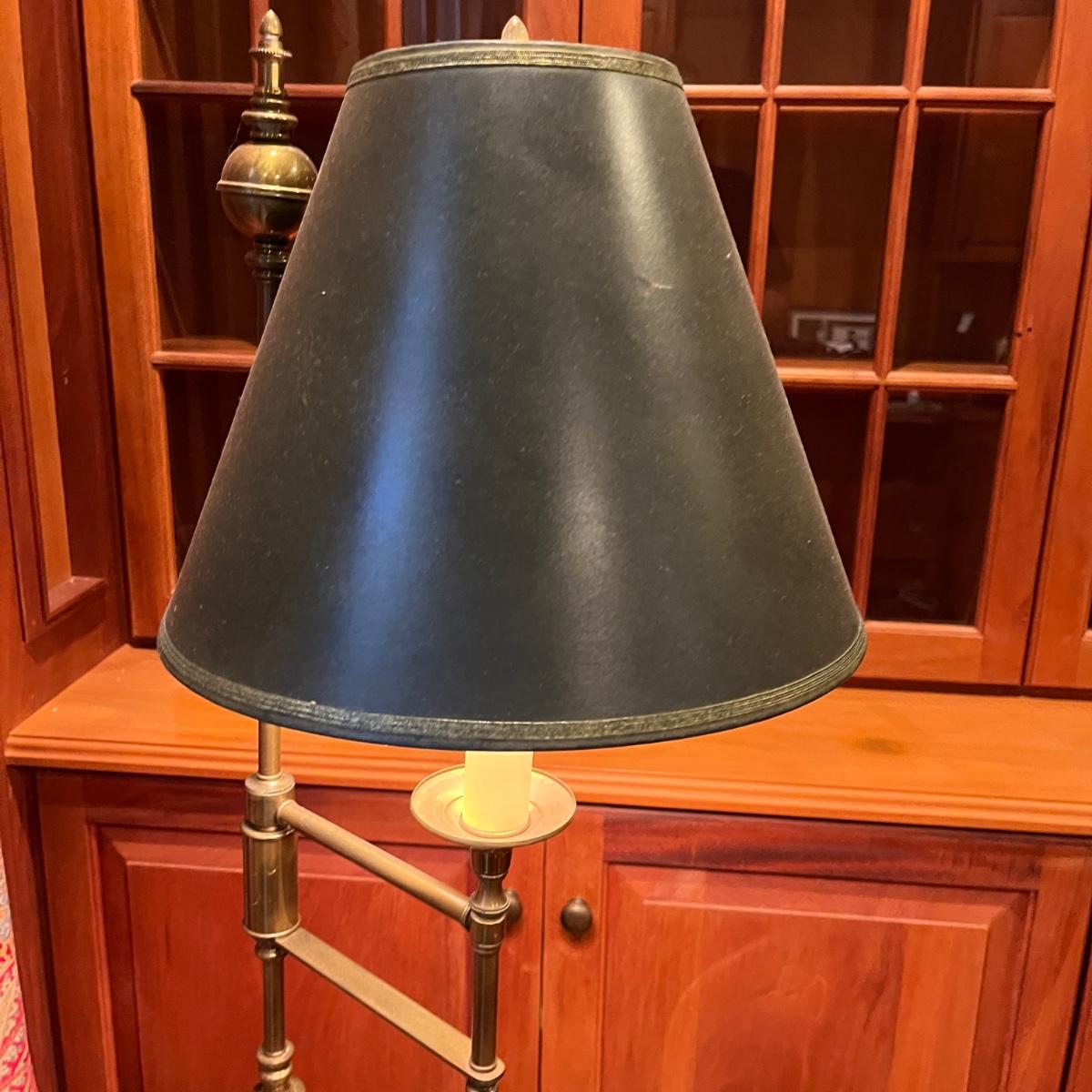 This set of lamps includes a brass candlestick table lamp that measures 6.5” x 5” x 18”H. with inline switch and a brass and metal candlestick floor lamp that measures 13” x 10” x 58”H with on off switch. Both lamps powered on when plugged in.