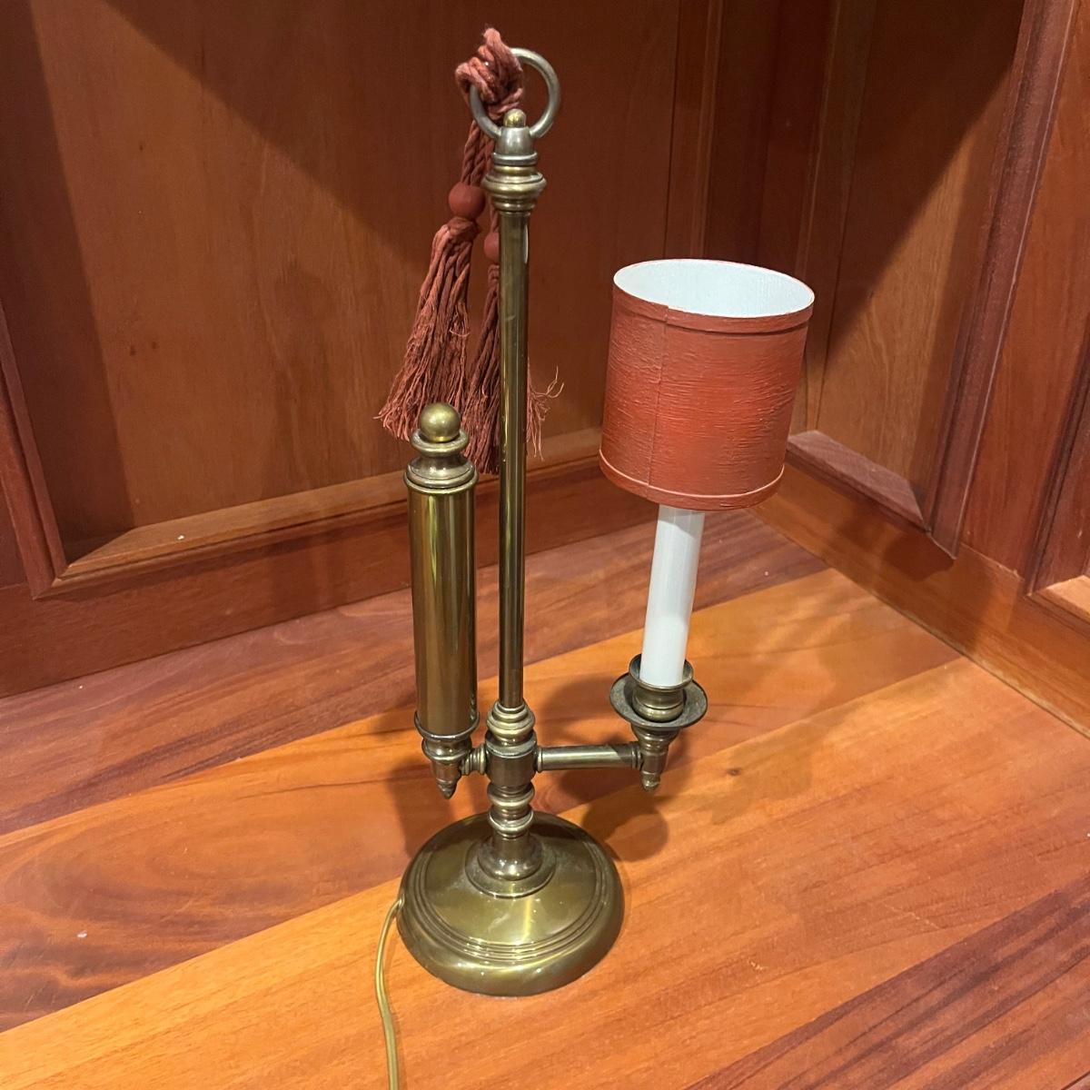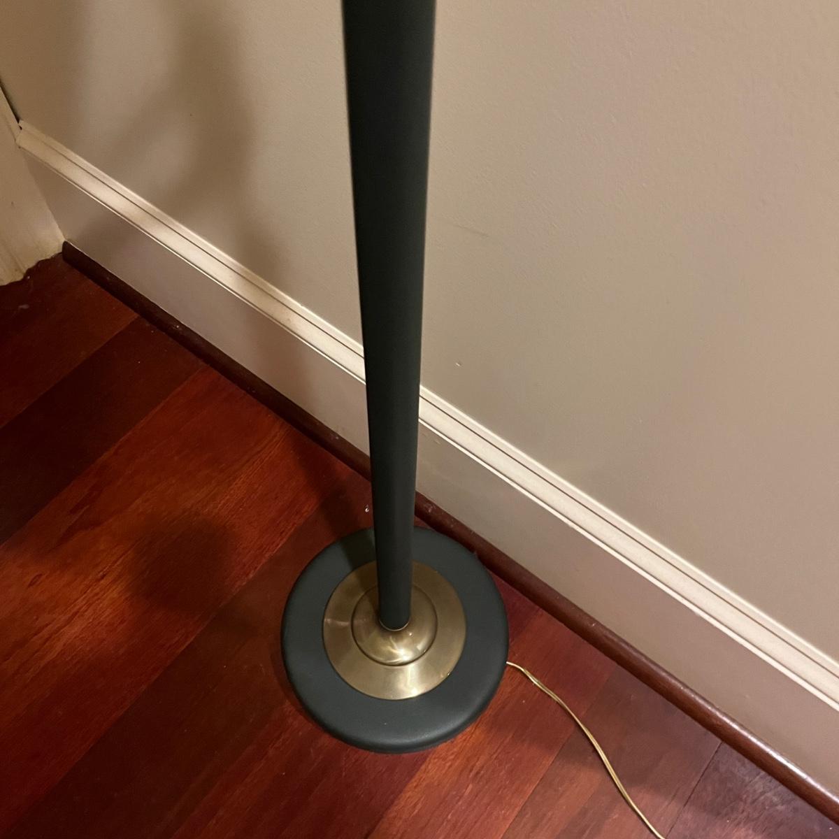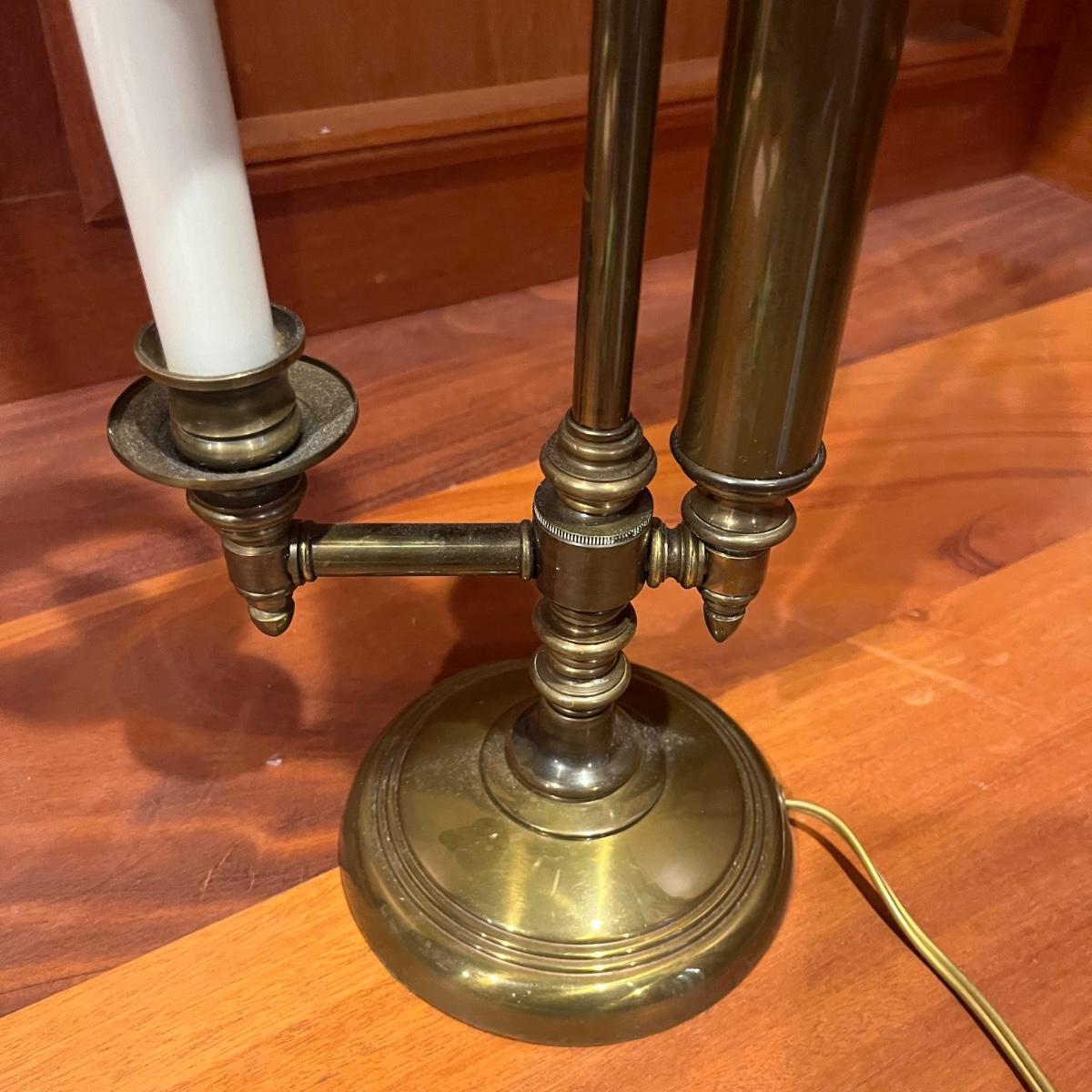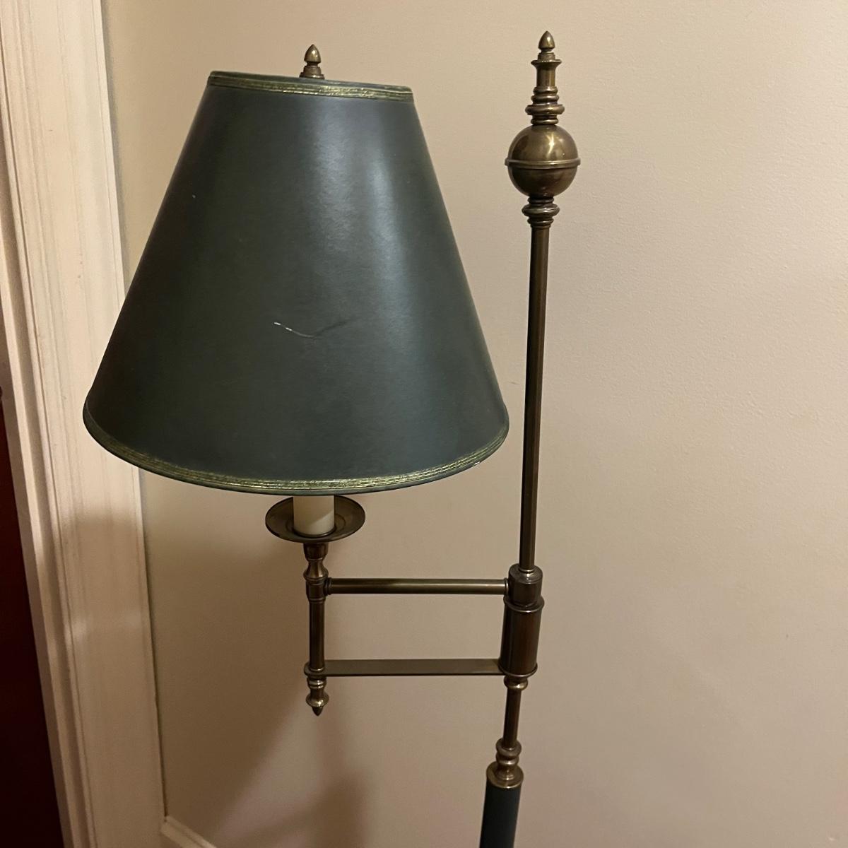This set of lamps includes a brass candlestick table lamp that measures 6.5” x 5” x 18”H. with inline switch and a brass and metal candlestick floor lamp that measures 13” x 10” x 58”H with on off switch. Both lamps powered on when plugged in.