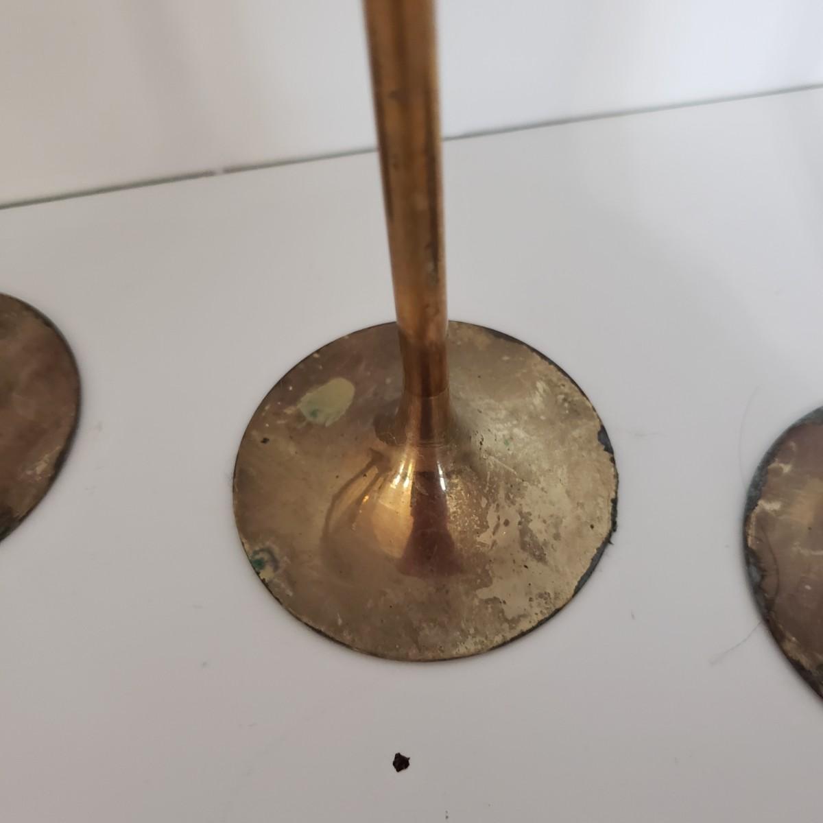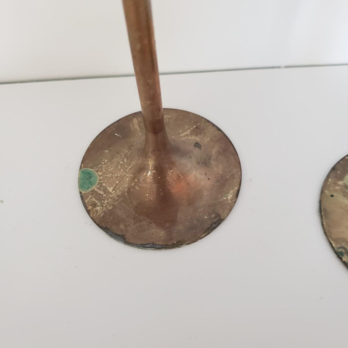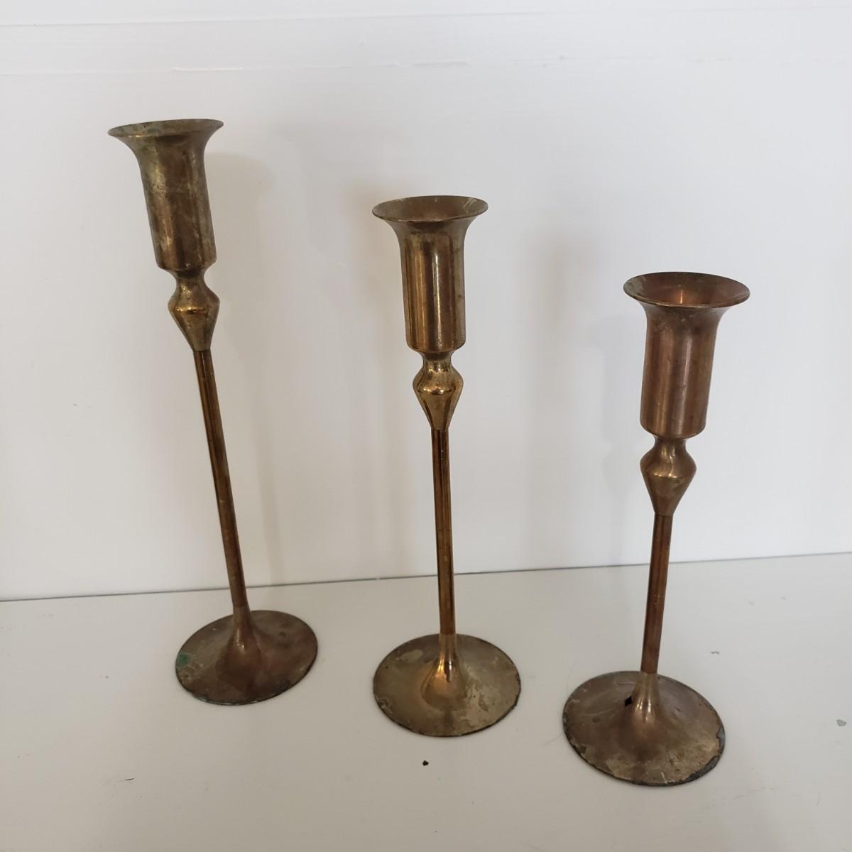 Two large, matching brass candlesticks measuring approximately 5" x 5" x 14"H. The three tiered candlesticks measure 9.5" H to 7.5" H. The smallest one has a small hole in the base, see picture. The small bucket is made of copper. The handle is broken and needs soldering. The brass snuffer measures 2" x 11".