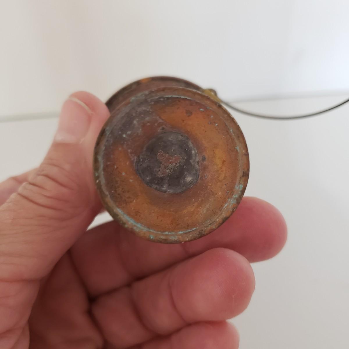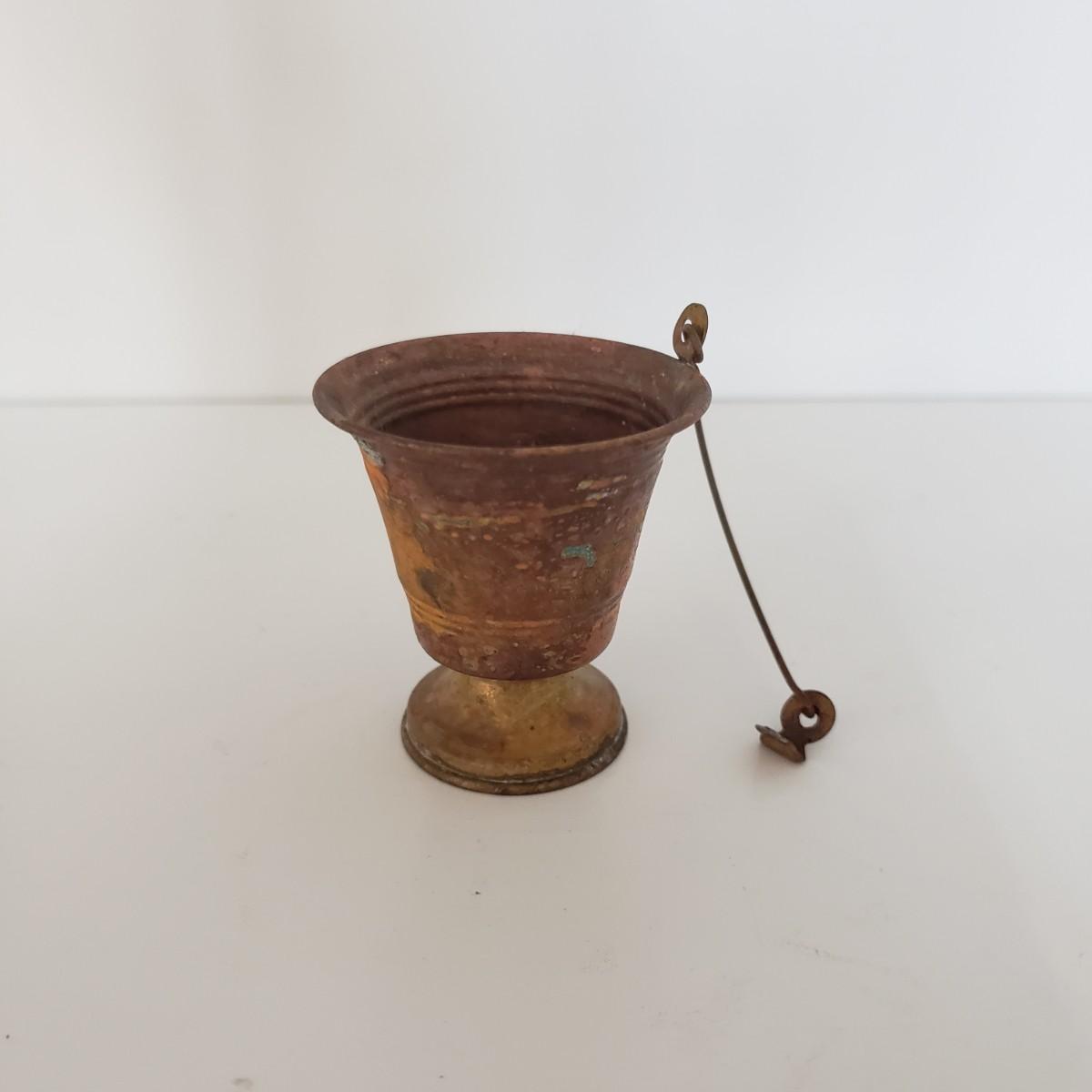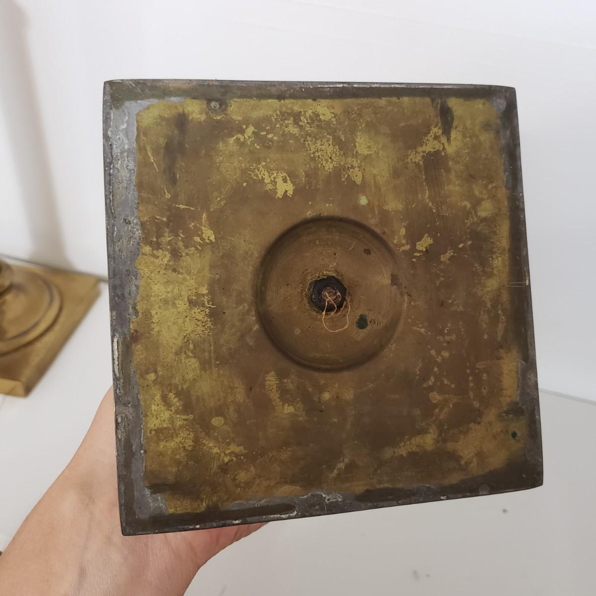 Two large, matching brass candlesticks measuring approximately 5" x 5" x 14"H. The three tiered candlesticks measure 9.5" H to 7.5" H. The smallest one has a small hole in the base, see picture. The small bucket is made of copper. The handle is broken and needs soldering. The brass snuffer measures 2" x 11".