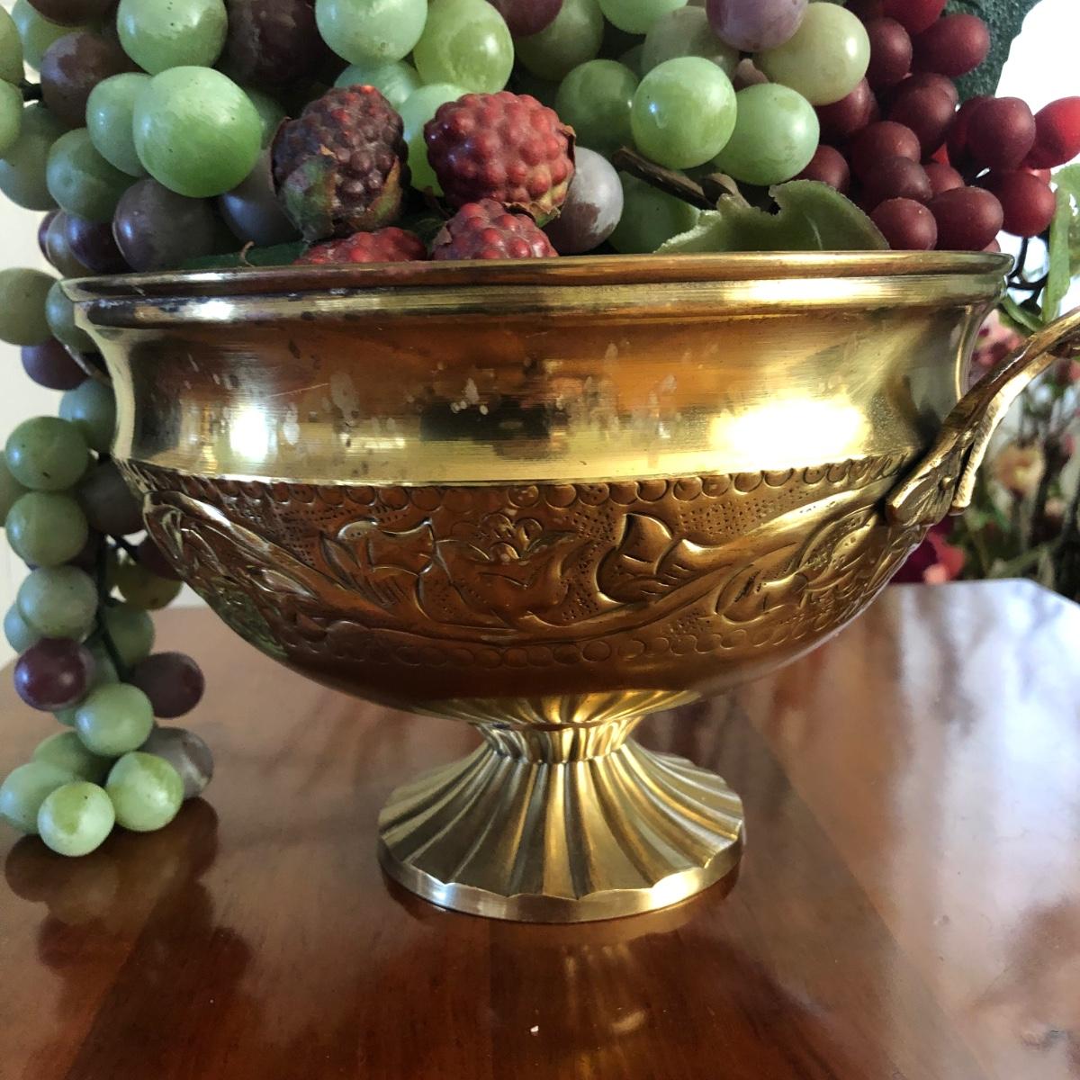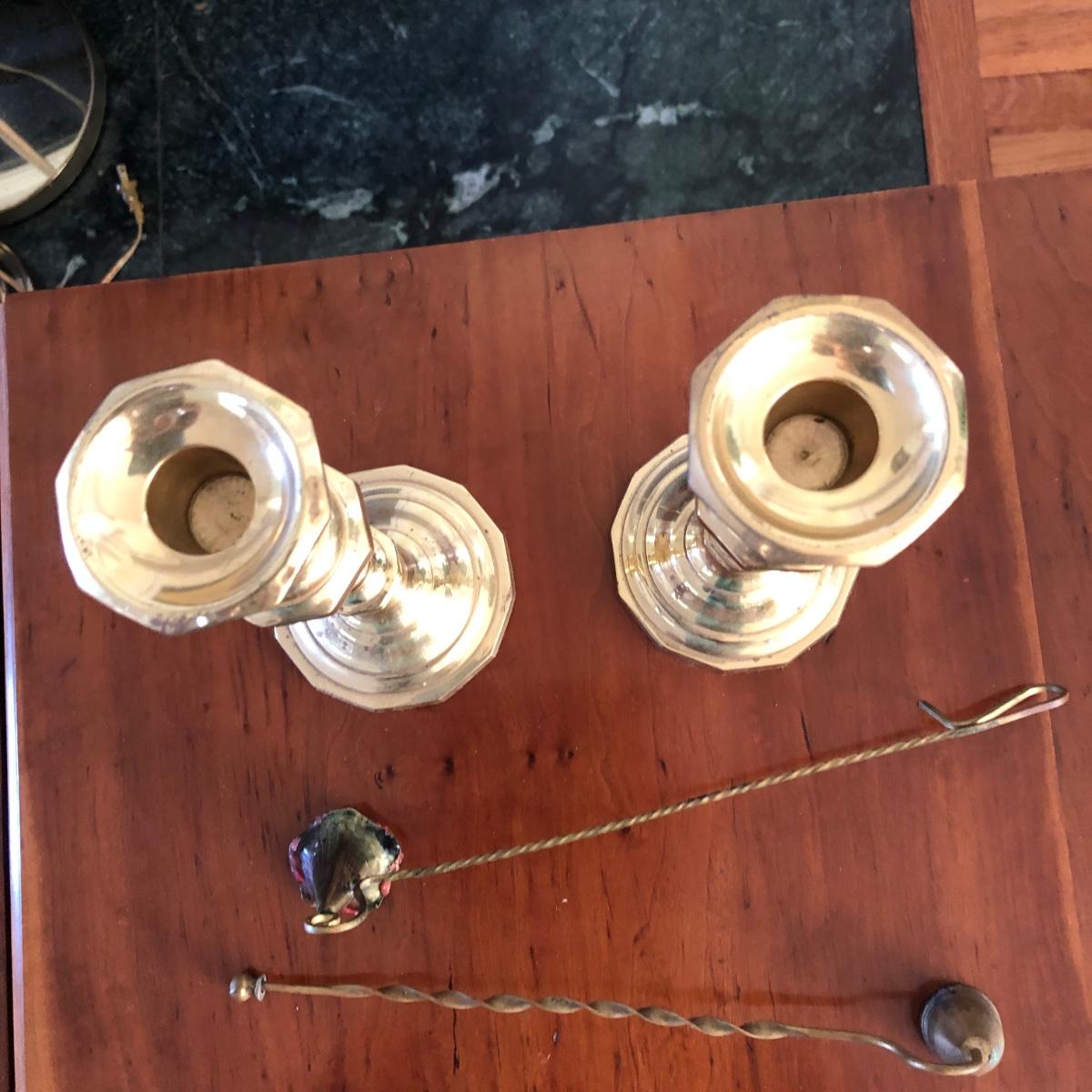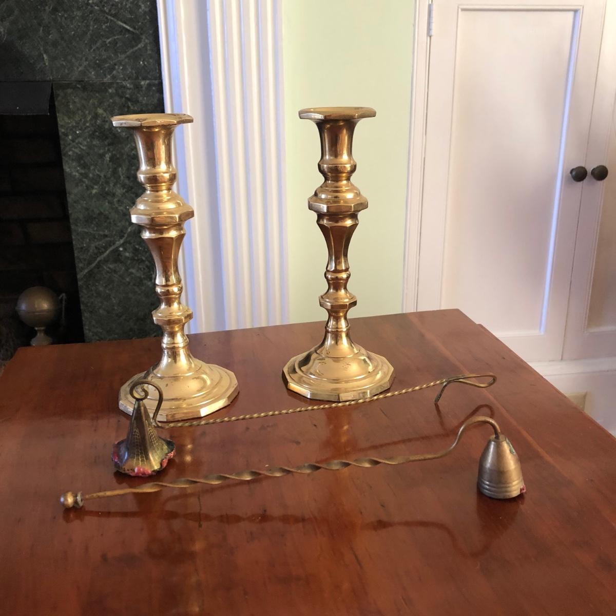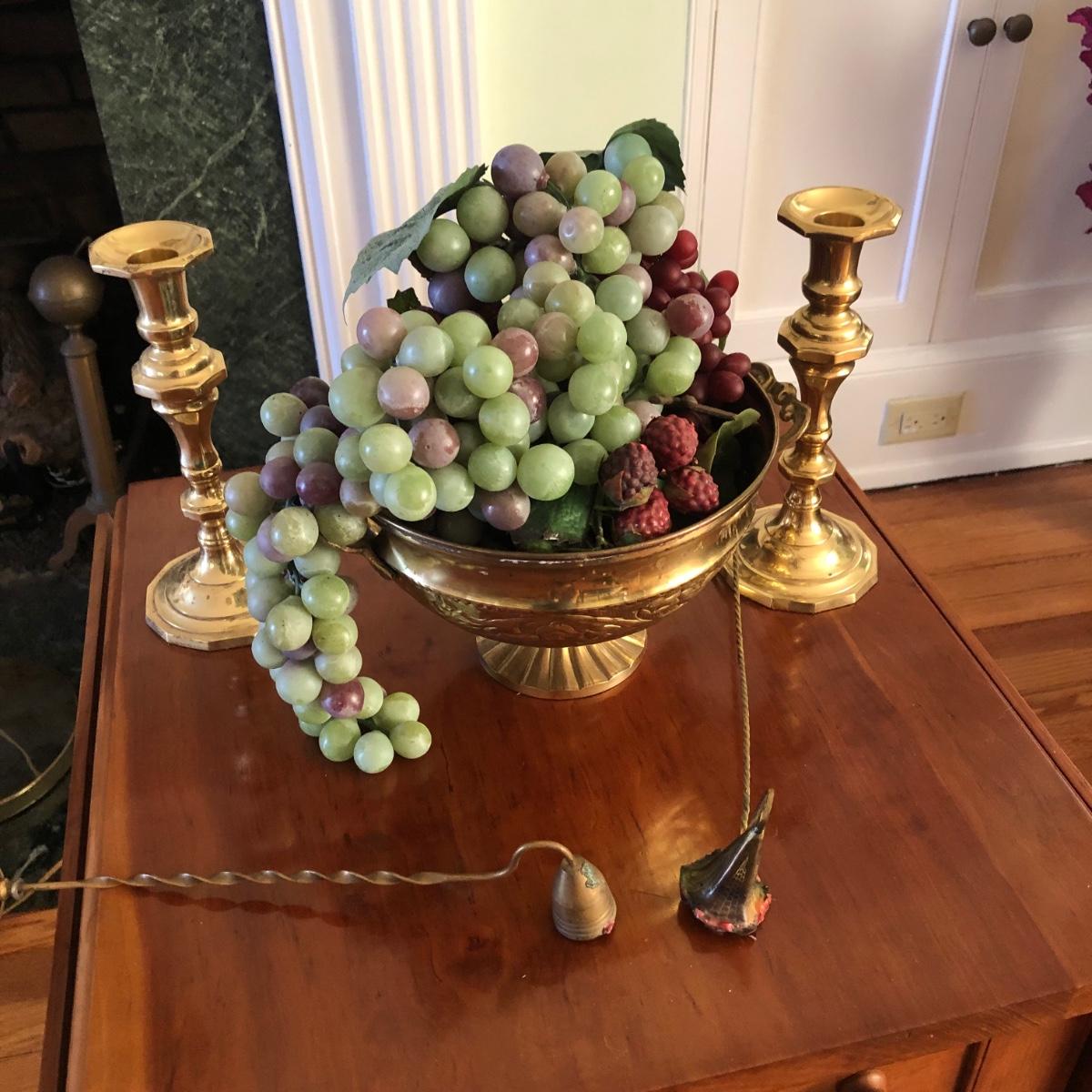 This lot contains two brass candlesticks, two brass snuffers and a brass bowl with faux fruit. The candlesticks are 3.5” in diameter and are over 8” tall. The brass bowl is 8” in diameter and 5.5” tall (without fruit. Shipping Available.