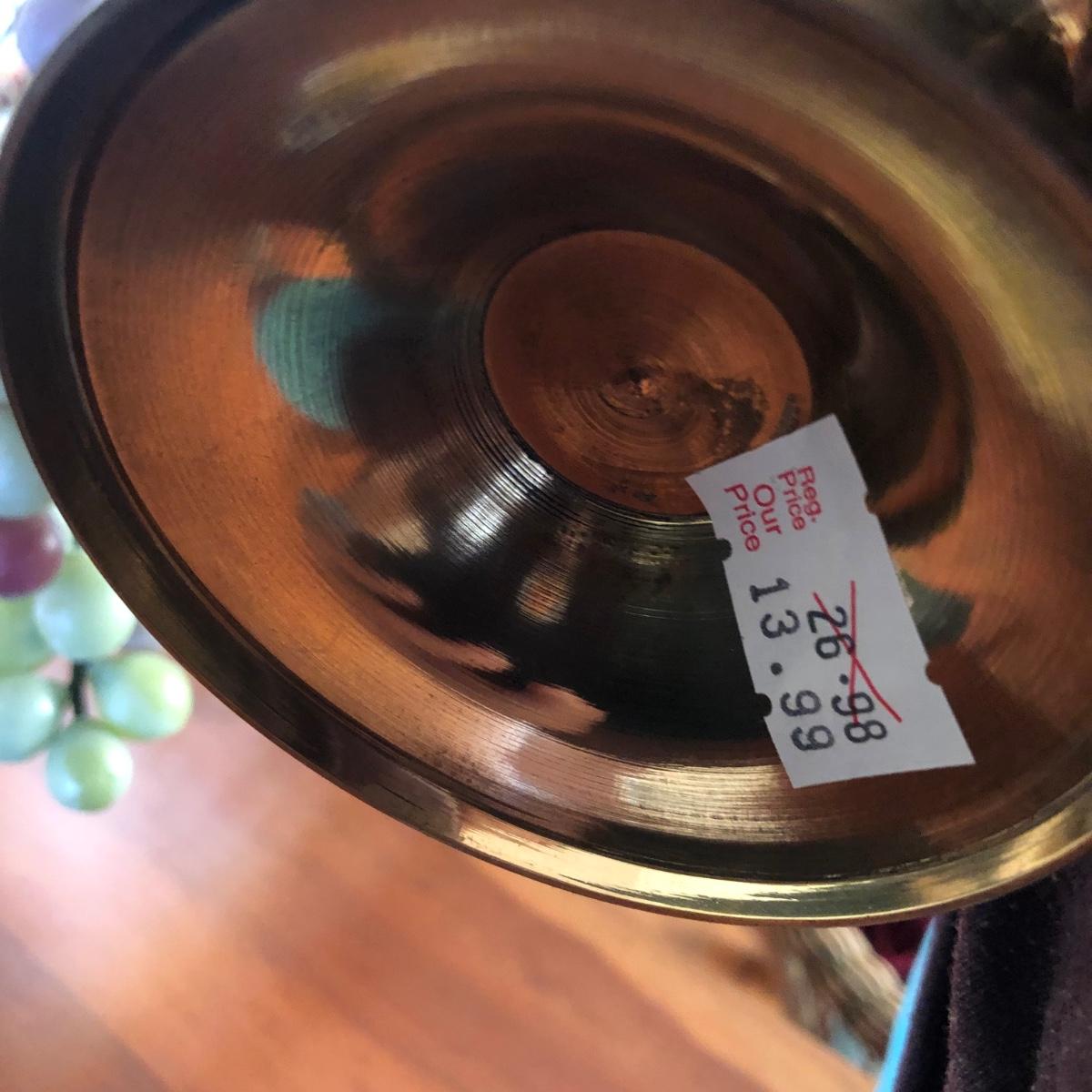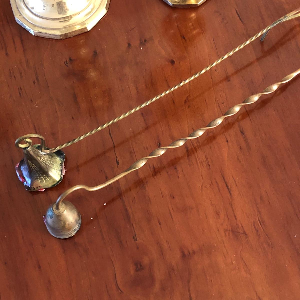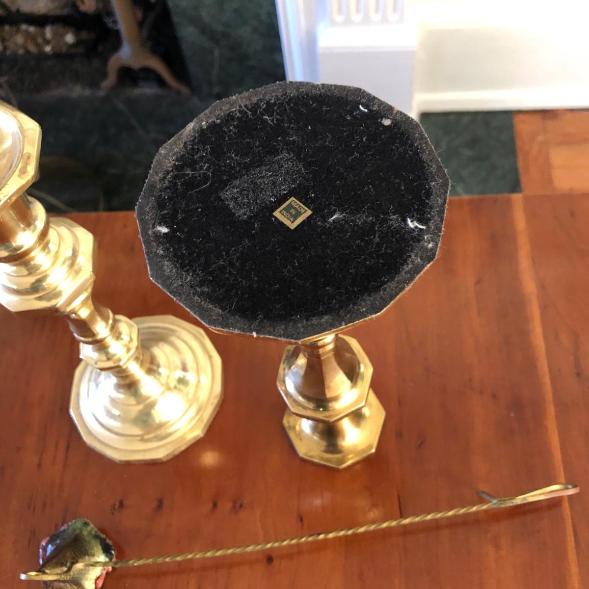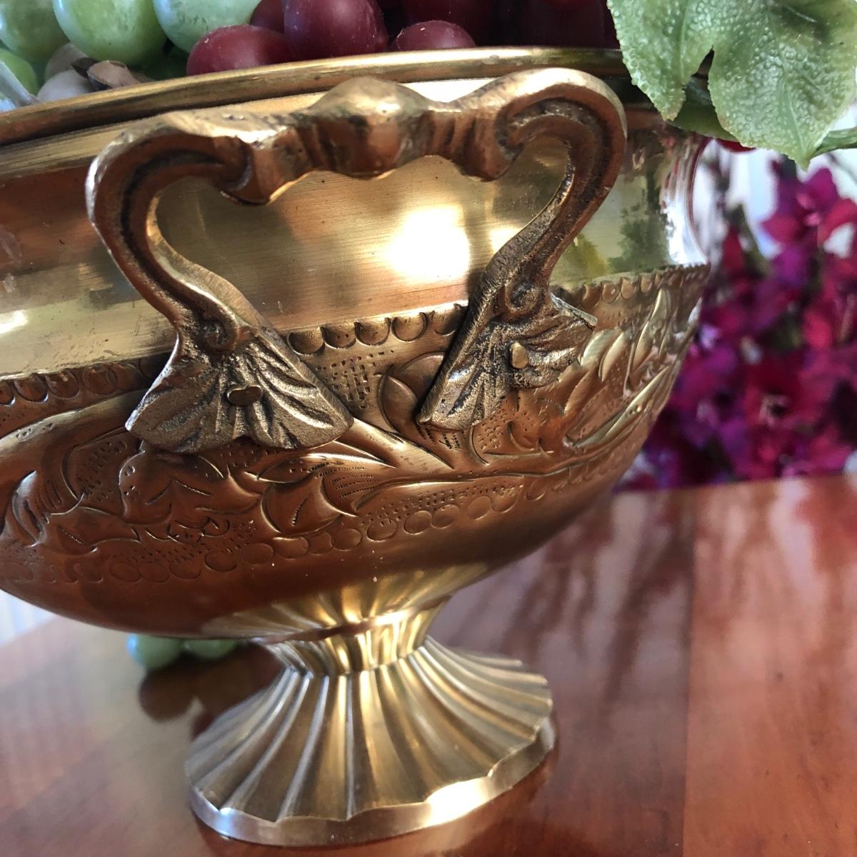 This lot contains two brass candlesticks, two brass snuffers and a brass bowl with faux fruit. The candlesticks are 3.5” in diameter and are over 8” tall. The brass bowl is 8” in diameter and 5.5” tall (without fruit. Shipping Available.