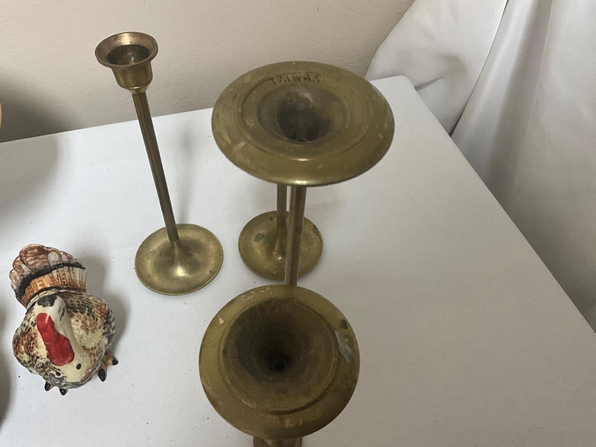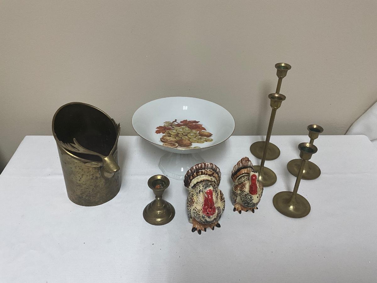 Brass Candlesticks, Japanese Turkey Salt and Pepper Shakers, German Platter