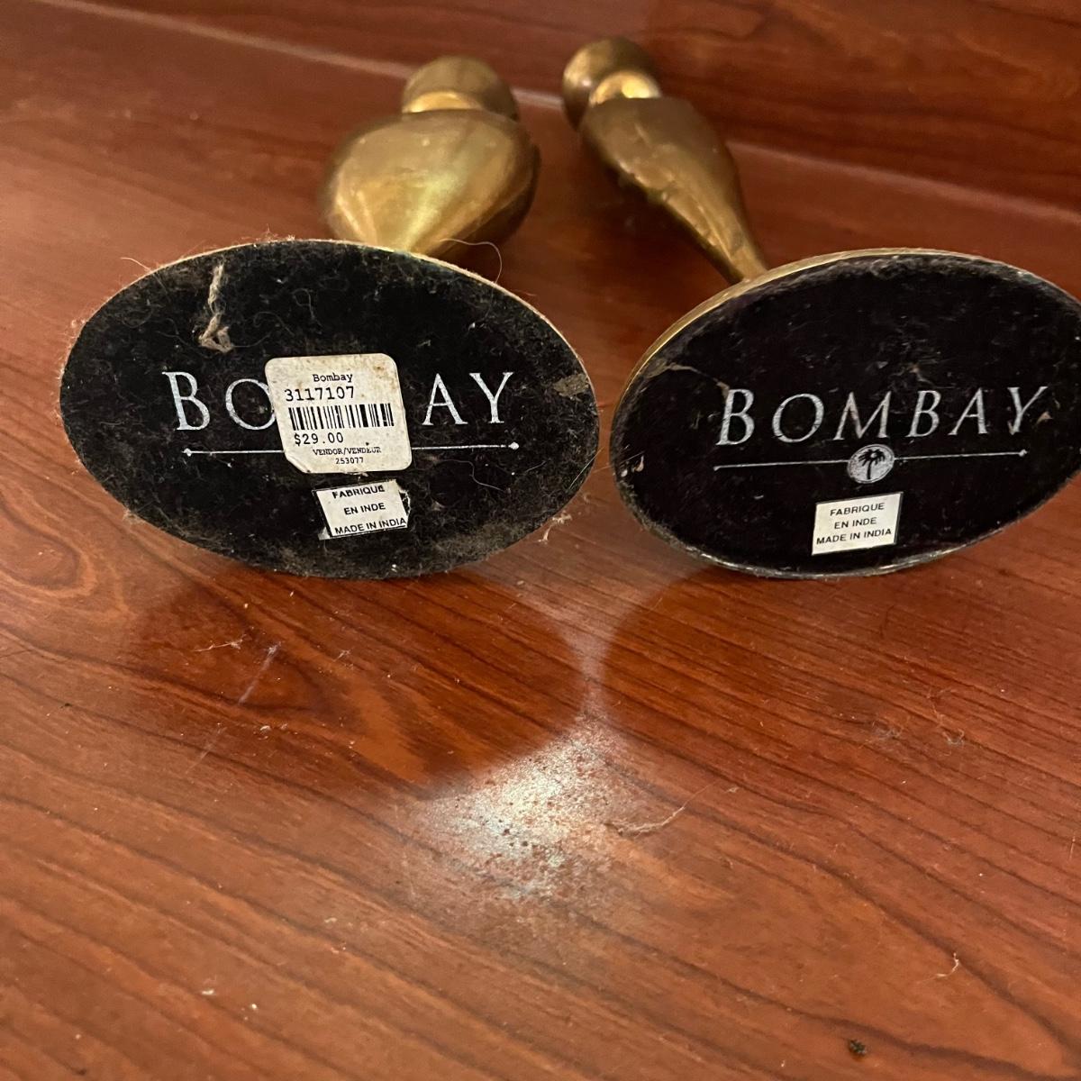 Lot includes a five candle brass candelabra , a pair of brass candlesticks with glass gables and two Bombay brass candlesticks. Candelabra measures 12.5” x 12.5” x 17”.