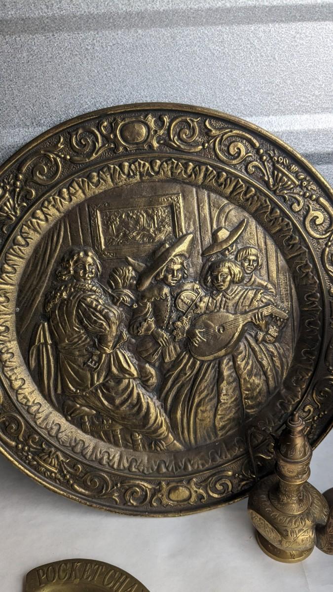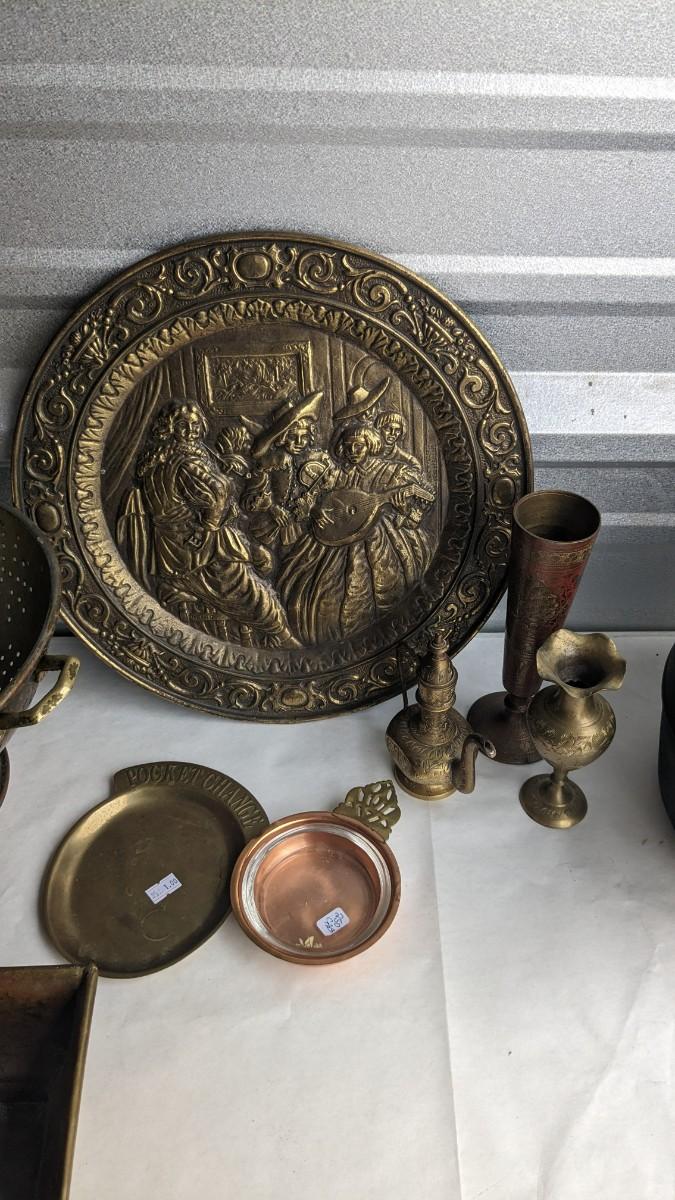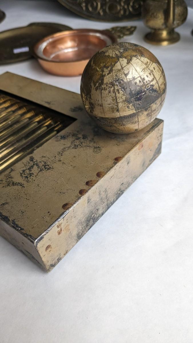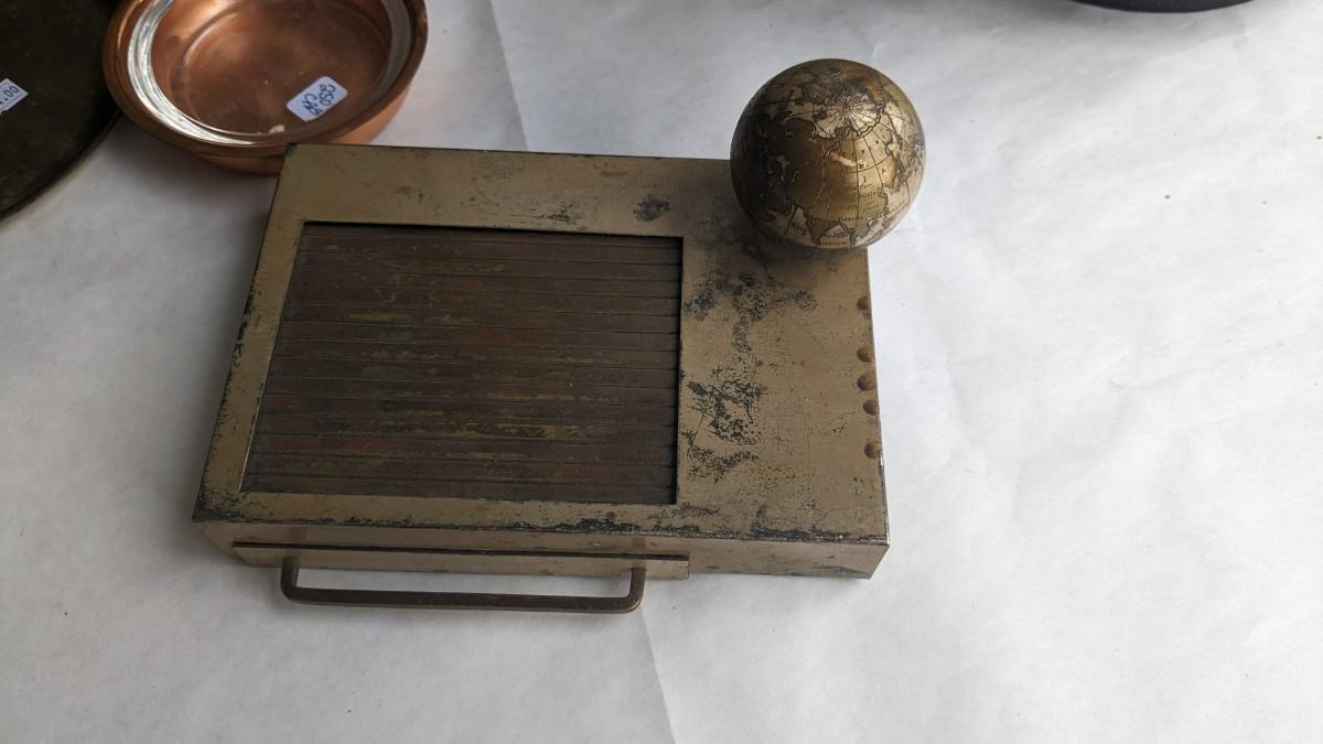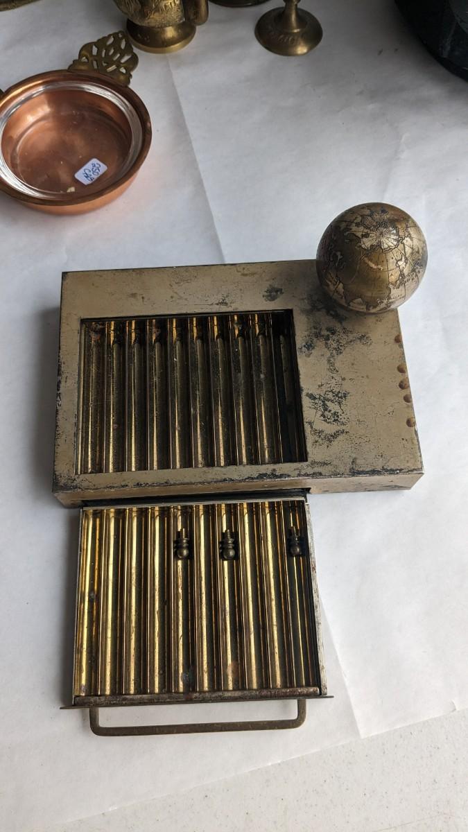 cast composite items, etched copper, and embossed and engraved brass. Also includes very neat vintage music box/cigarette holder that still works. No shipping. 2616