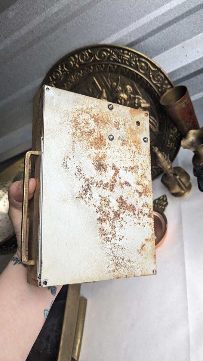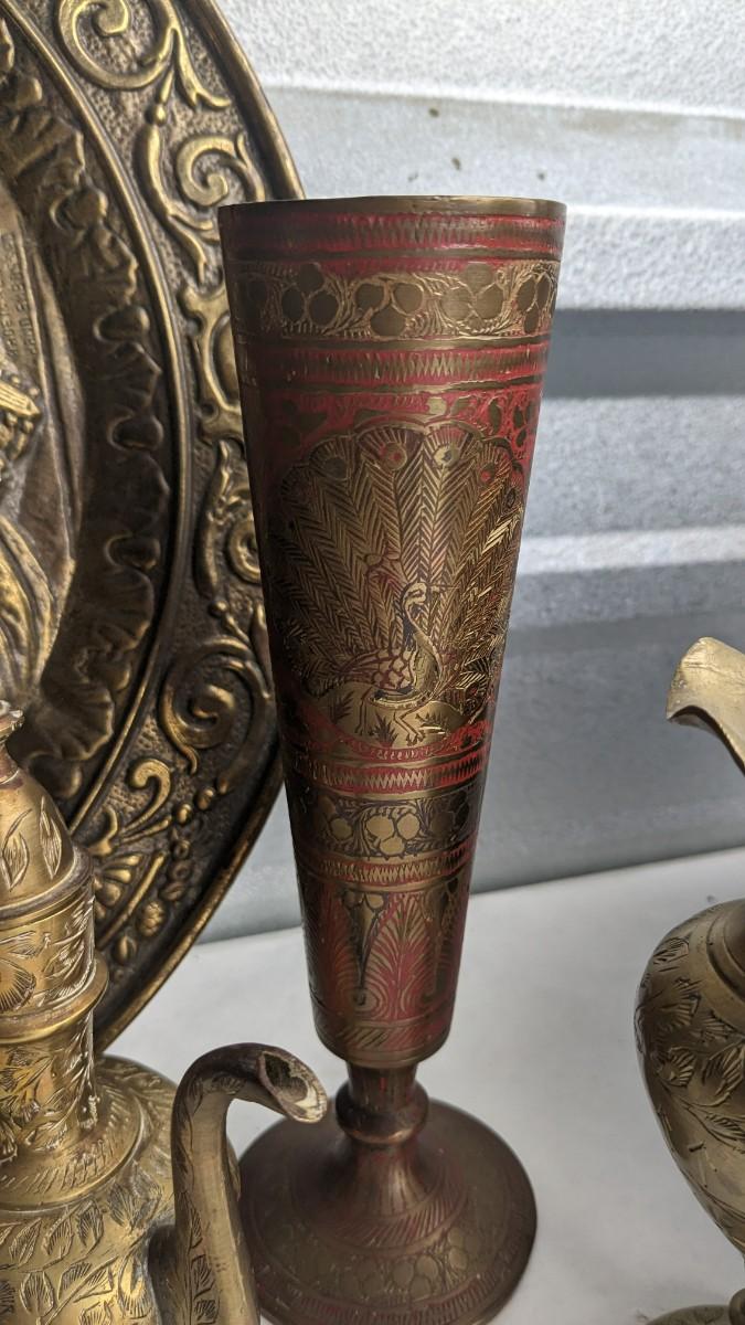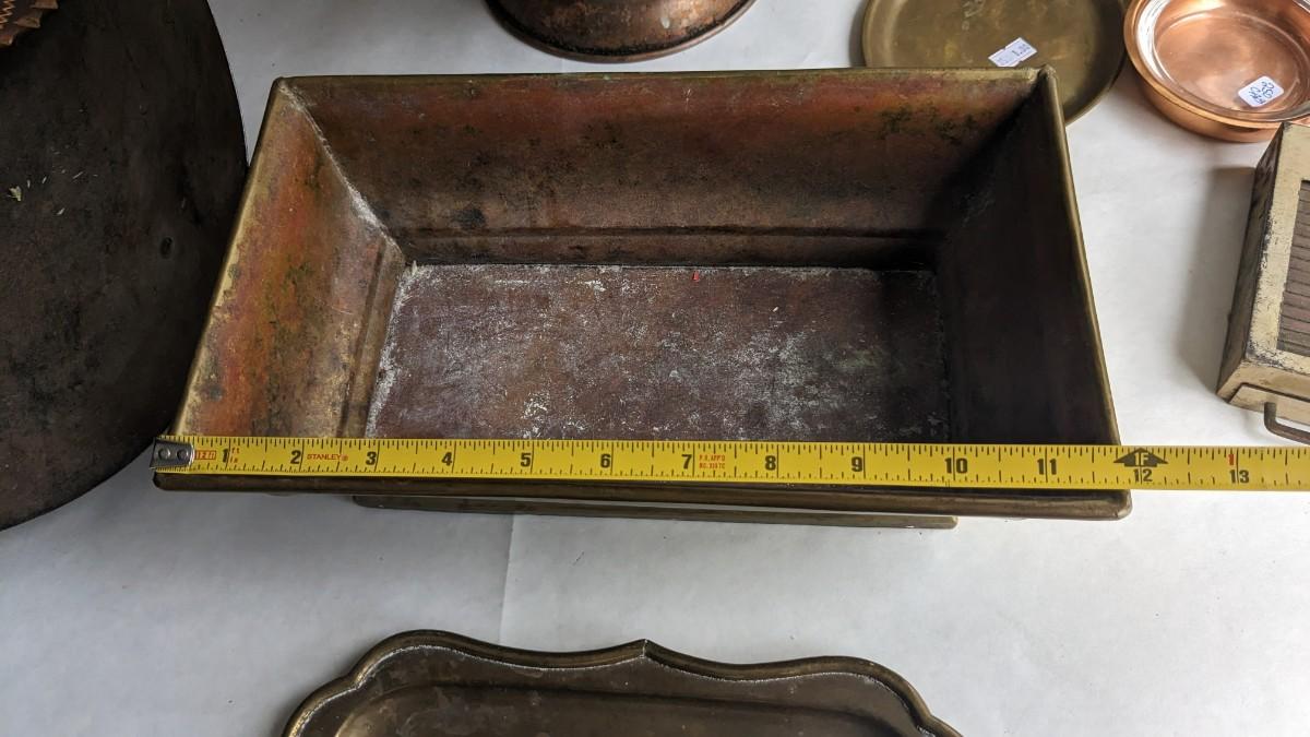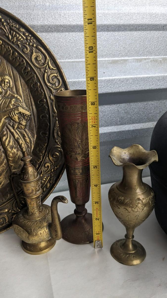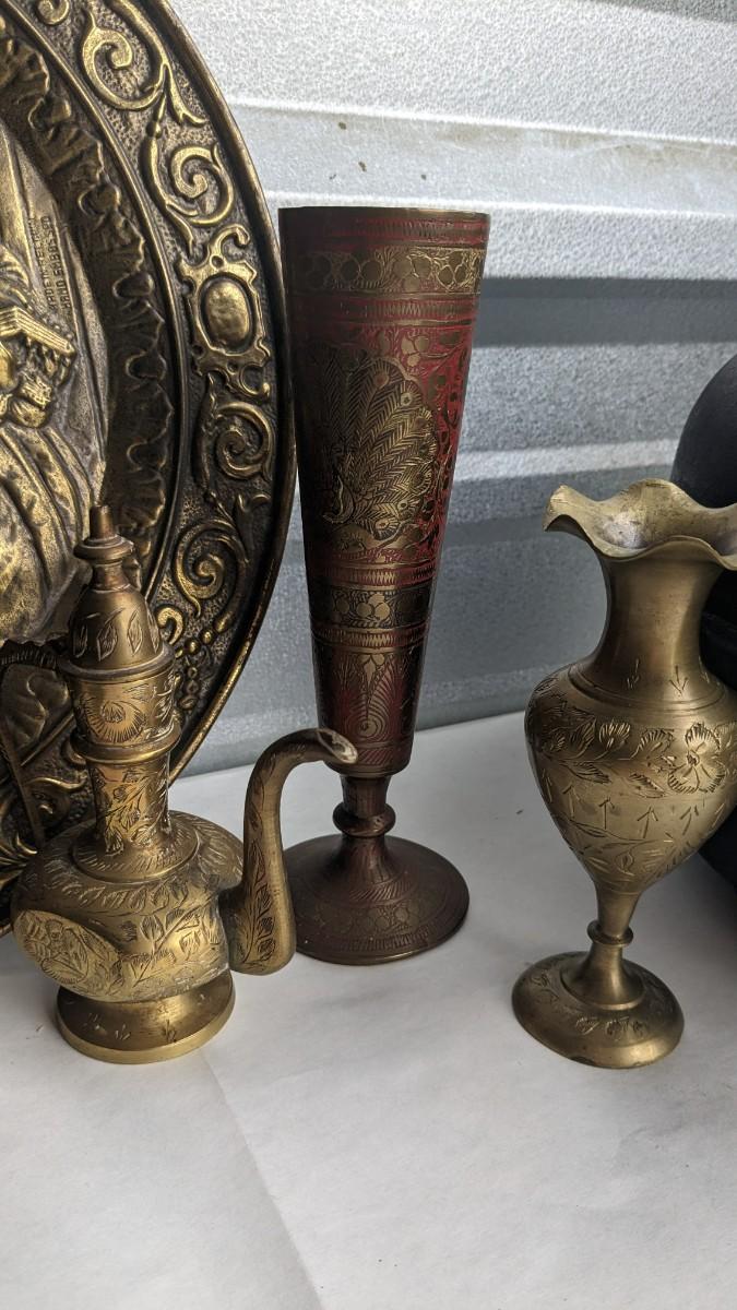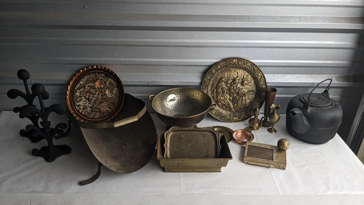cast composite items, etched copper, and embossed and engraved brass. Also includes very neat vintage music box/cigarette holder that still works. No shipping. 2616