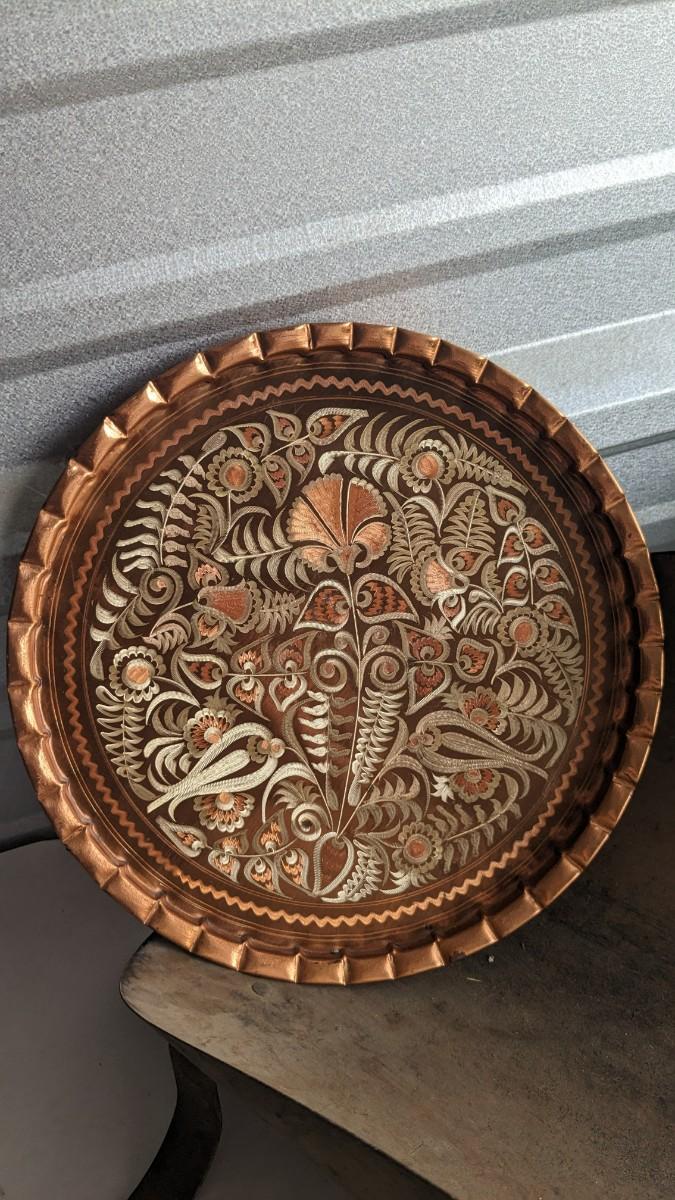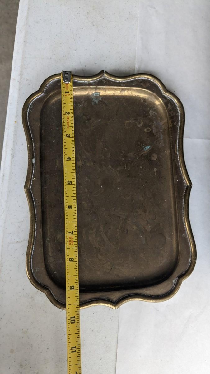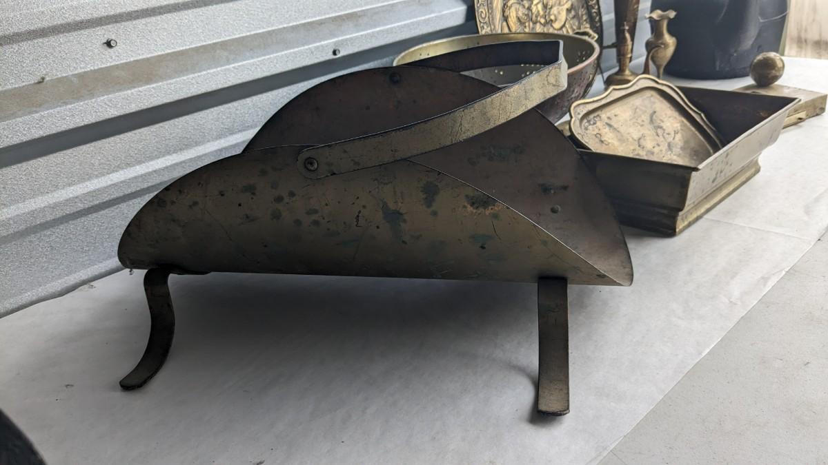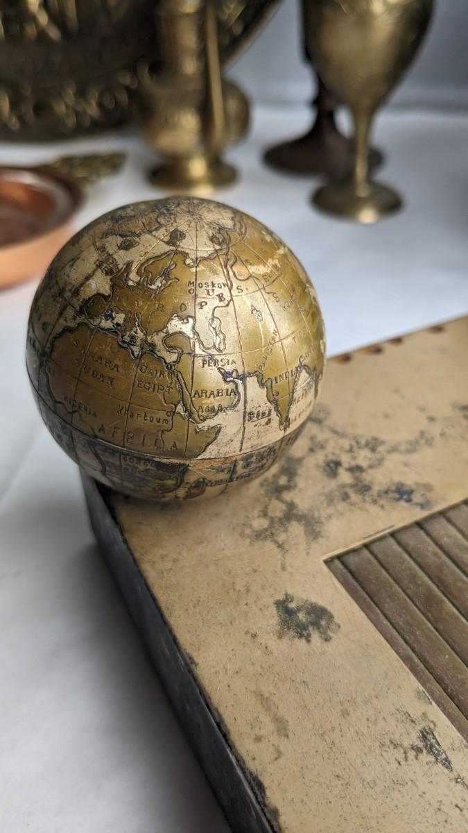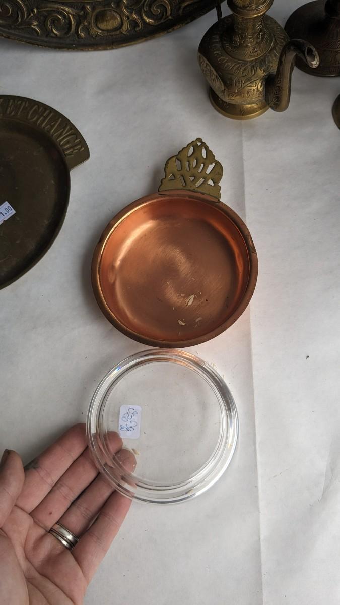 cast composite items, etched copper, and embossed and engraved brass. Also includes very neat vintage music box/cigarette holder that still works. No shipping. 2616