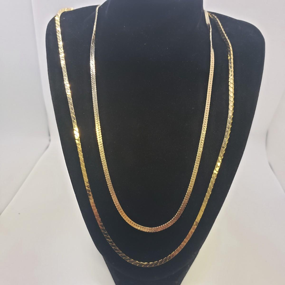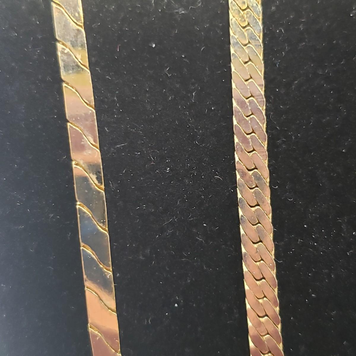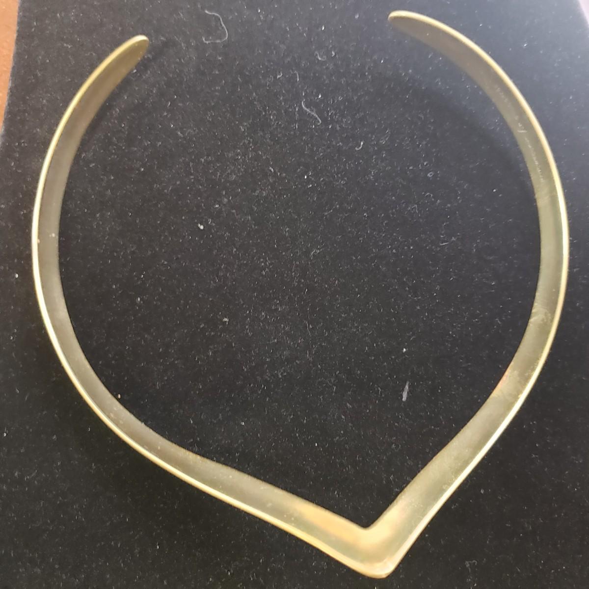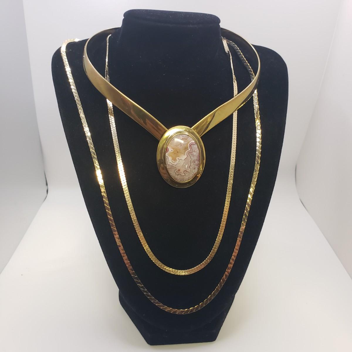 This three piece necklace lot has a choker style necklace with removable stone pendant. The pendant is handwrought in New Mexico and made out of brass. The longest gold necklace is 22". The smaller necklace is stamped "Korea."