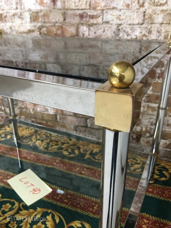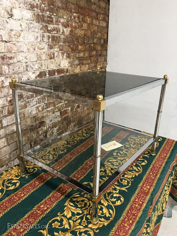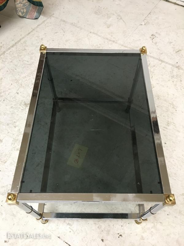 Table measures 29" by 21" and is 22" tall. Smoked glass top, clear glass bottom shelf.