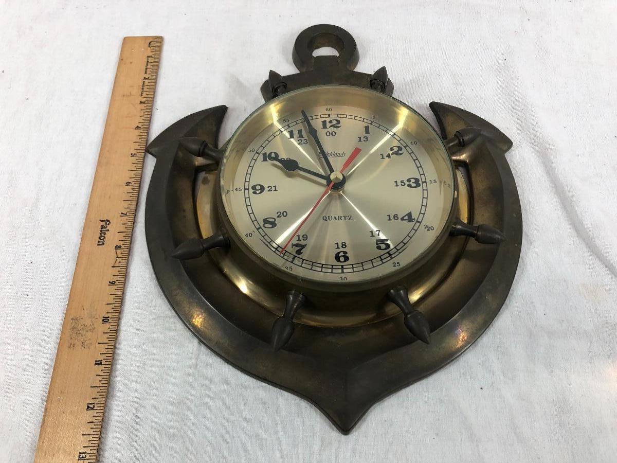 Brass quartz wall clock, made by Highlands. Clock is inside a ship’s wheel and anchor. Beveled glass dial, sweep second hand. Battery powered. Approx. 13” tall x 12” wide.
