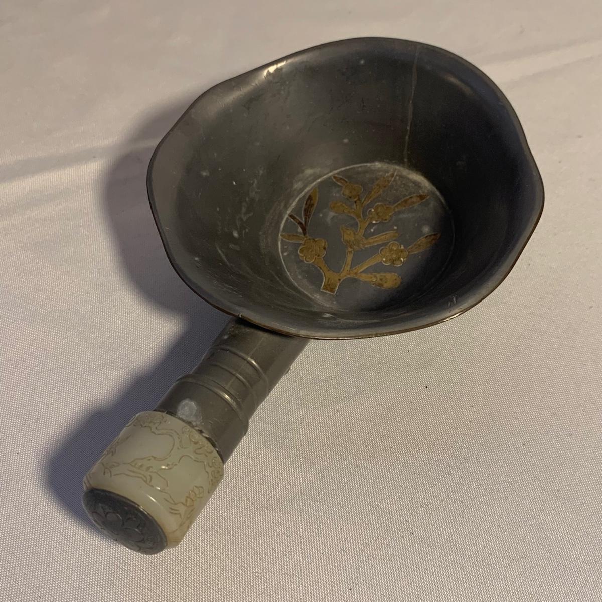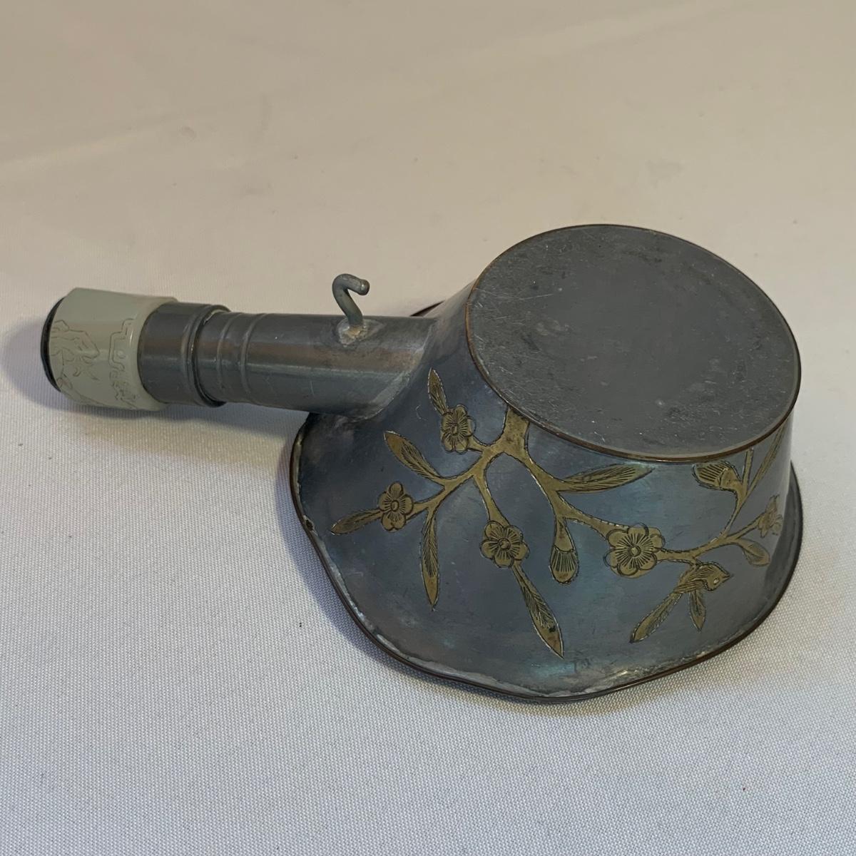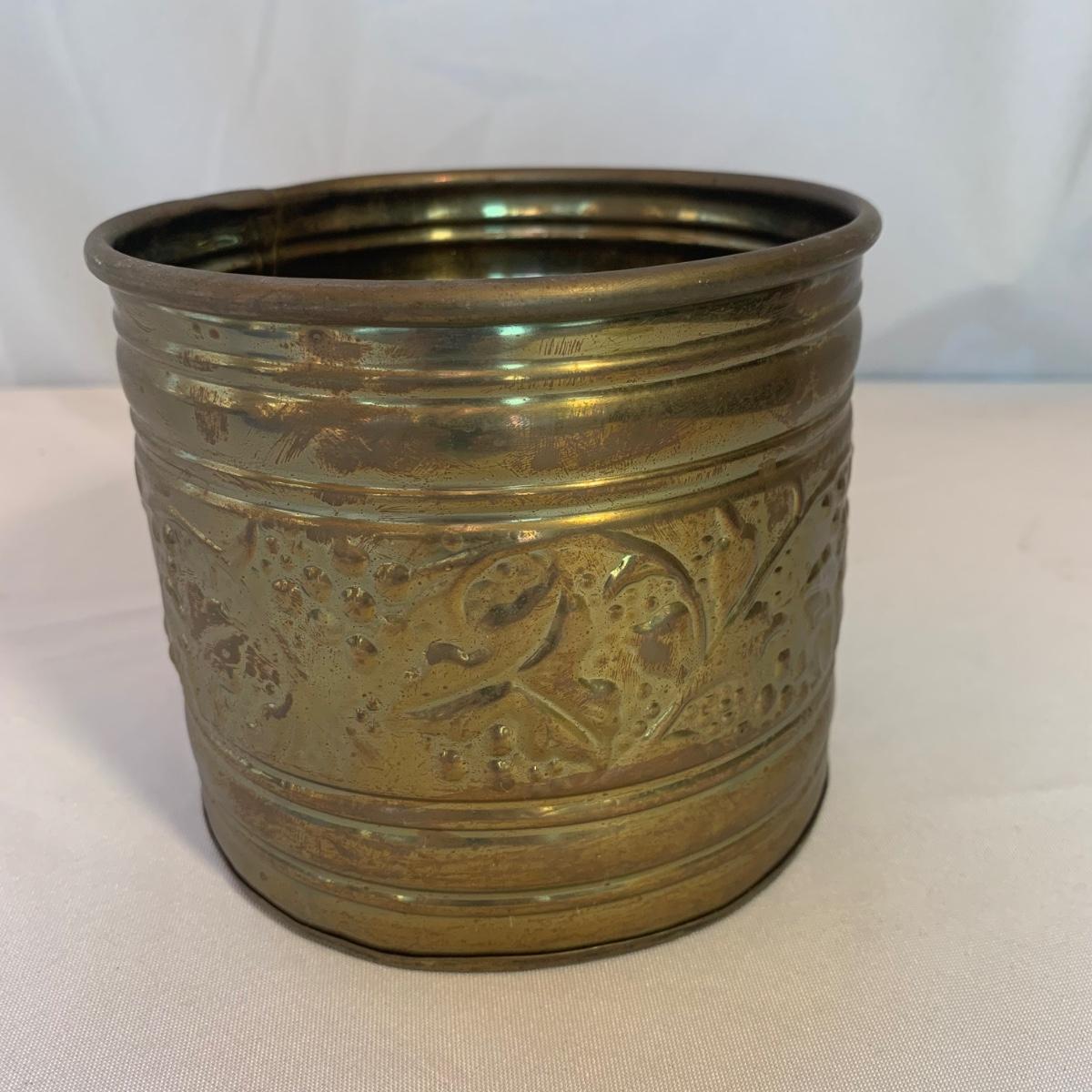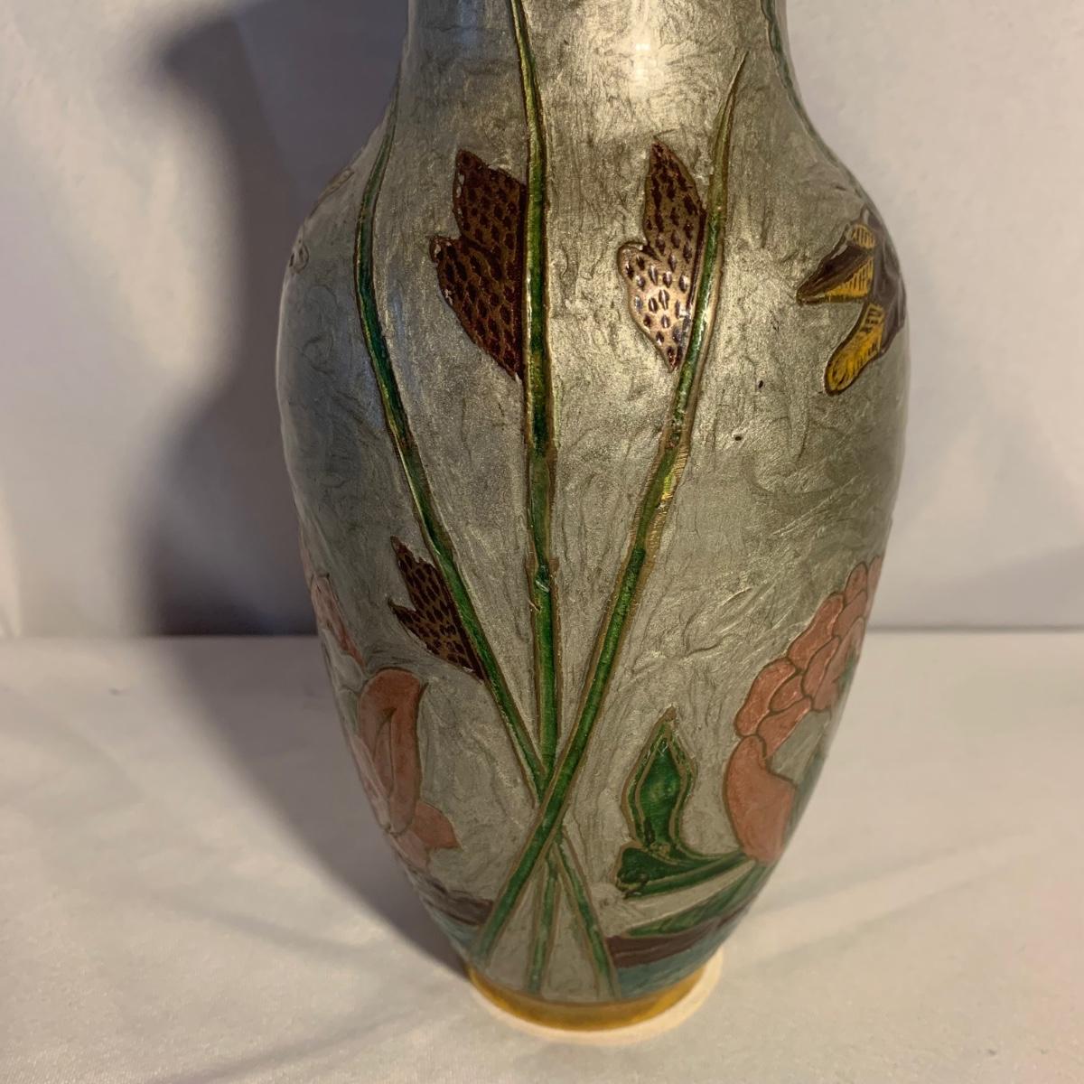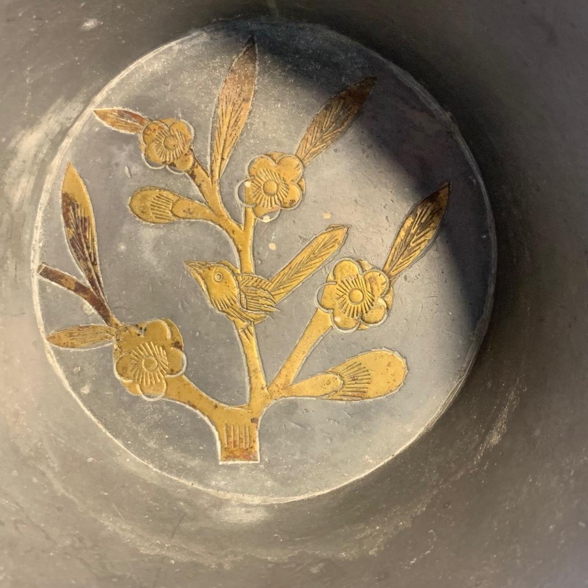 Gorgeous brass vase with enameled cloisonné style design featuring lotus flowers and dragonflies. Top measures 3.5”D and vase is 10”H. Two small brass buckets and three small pewter or pewter-like dishes are included as well.