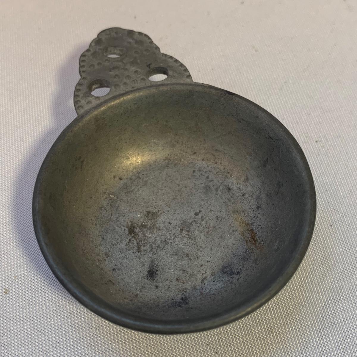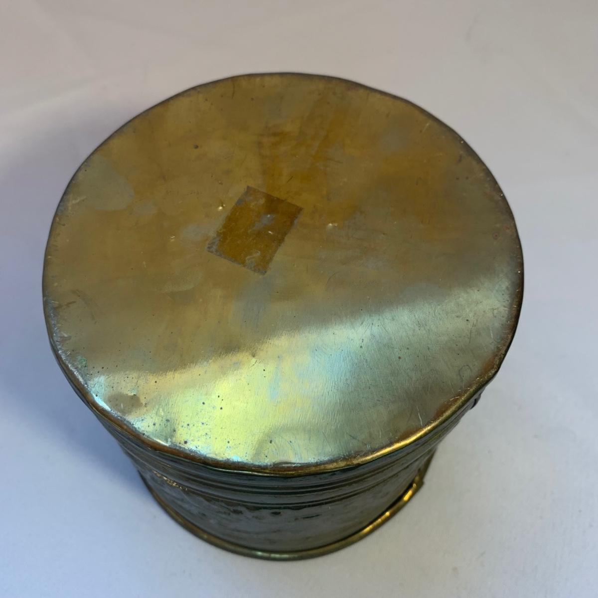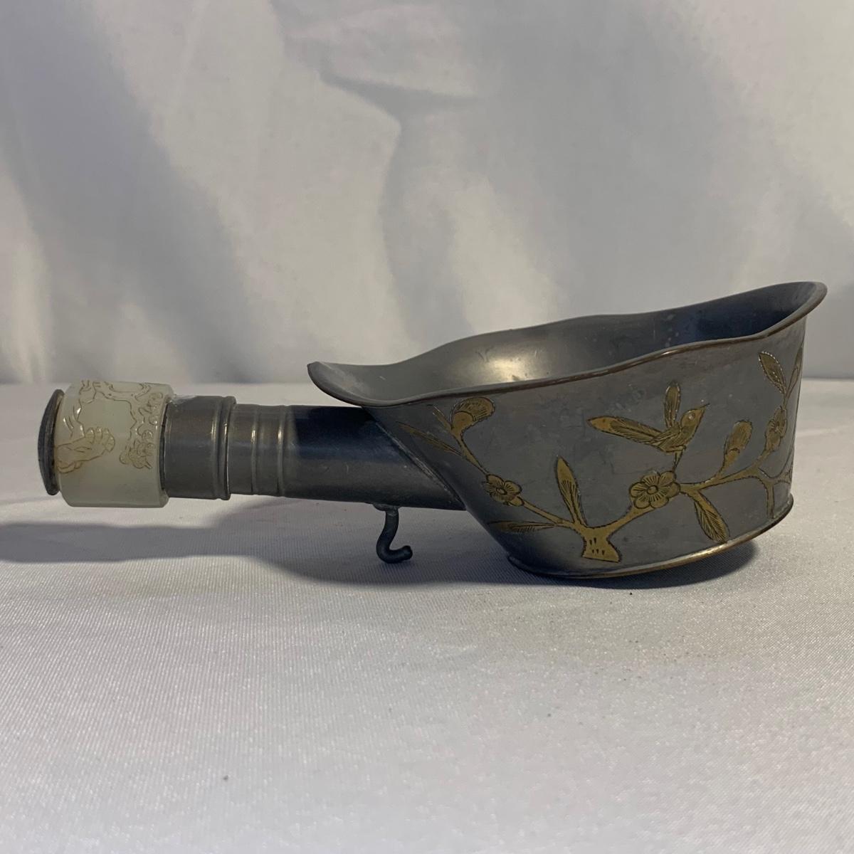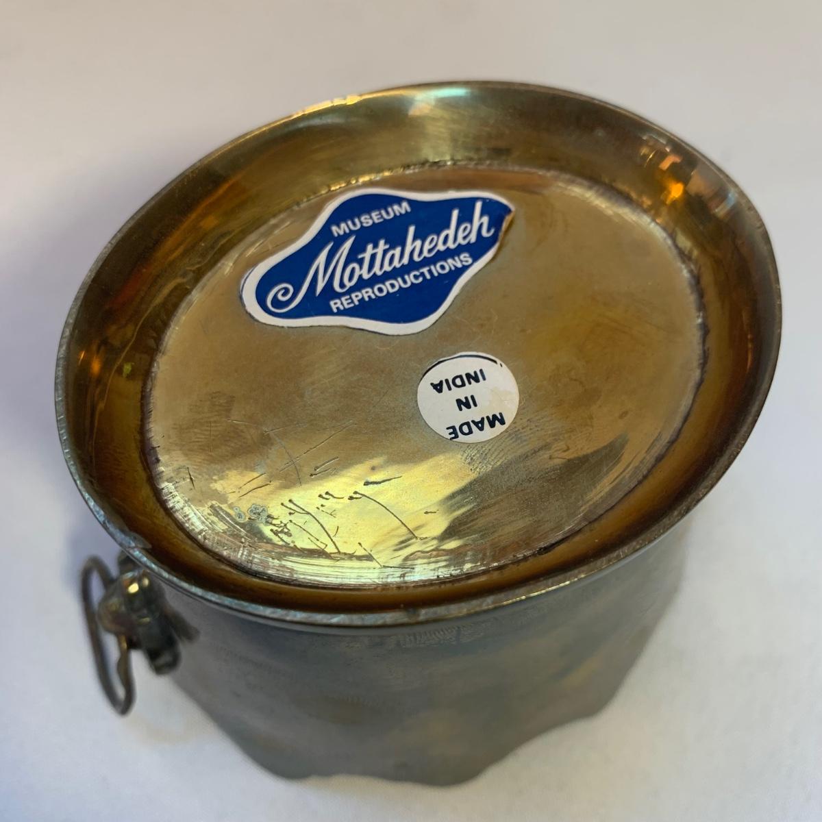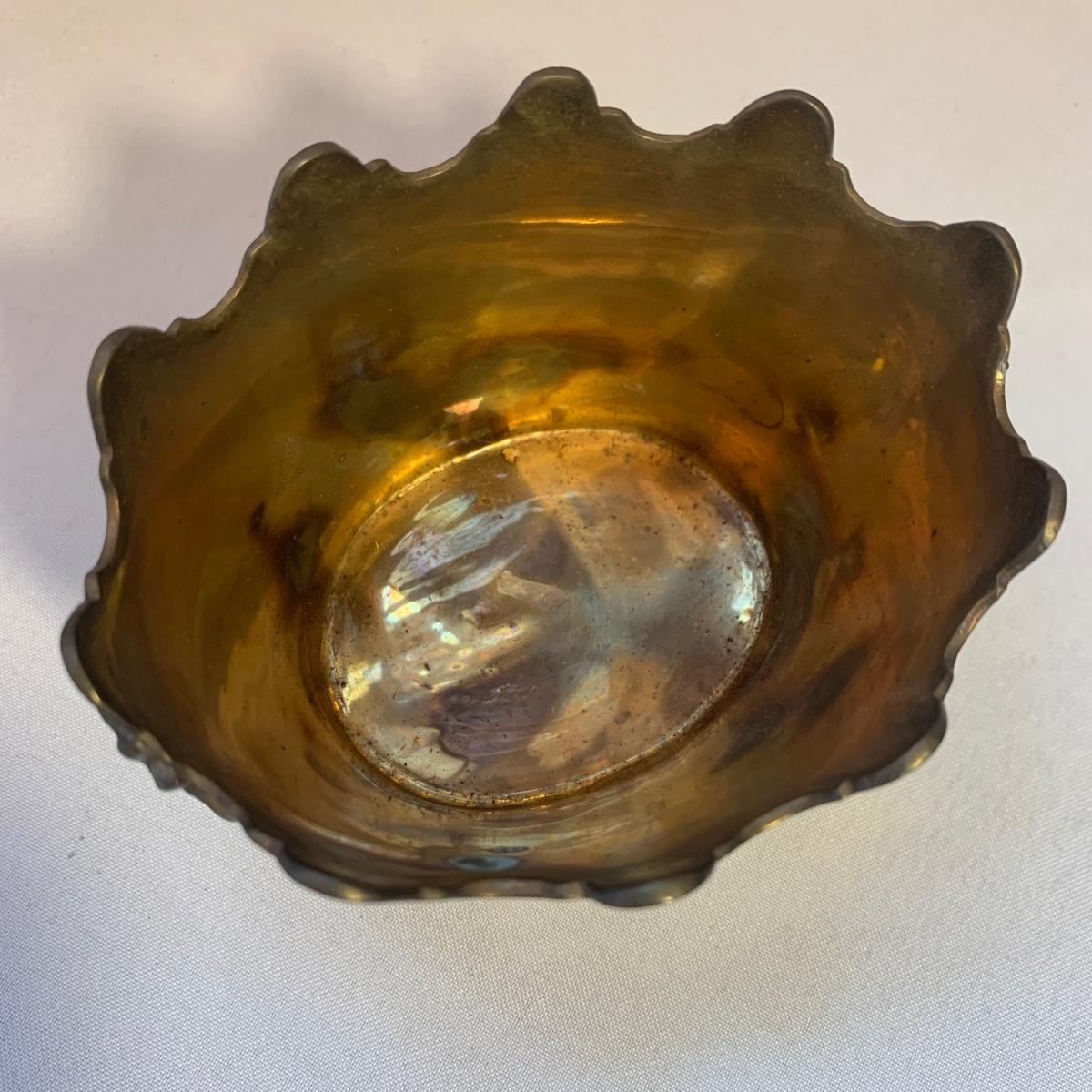 Gorgeous brass vase with enameled cloisonné style design featuring lotus flowers and dragonflies. Top measures 3.5”D and vase is 10”H. Two small brass buckets and three small pewter or pewter-like dishes are included as well.