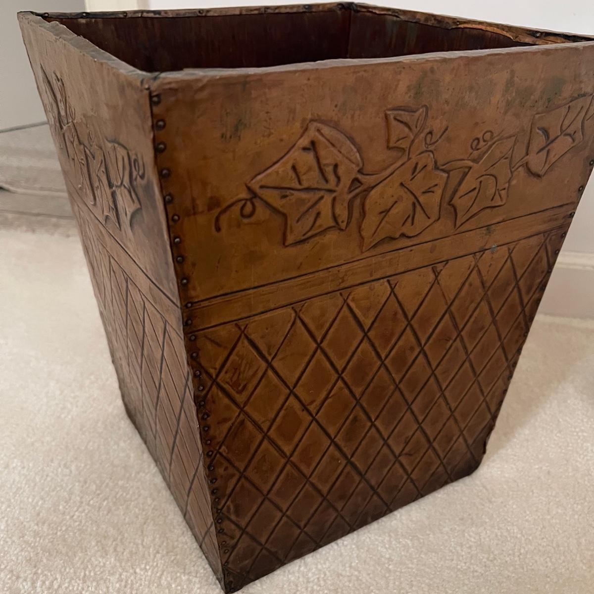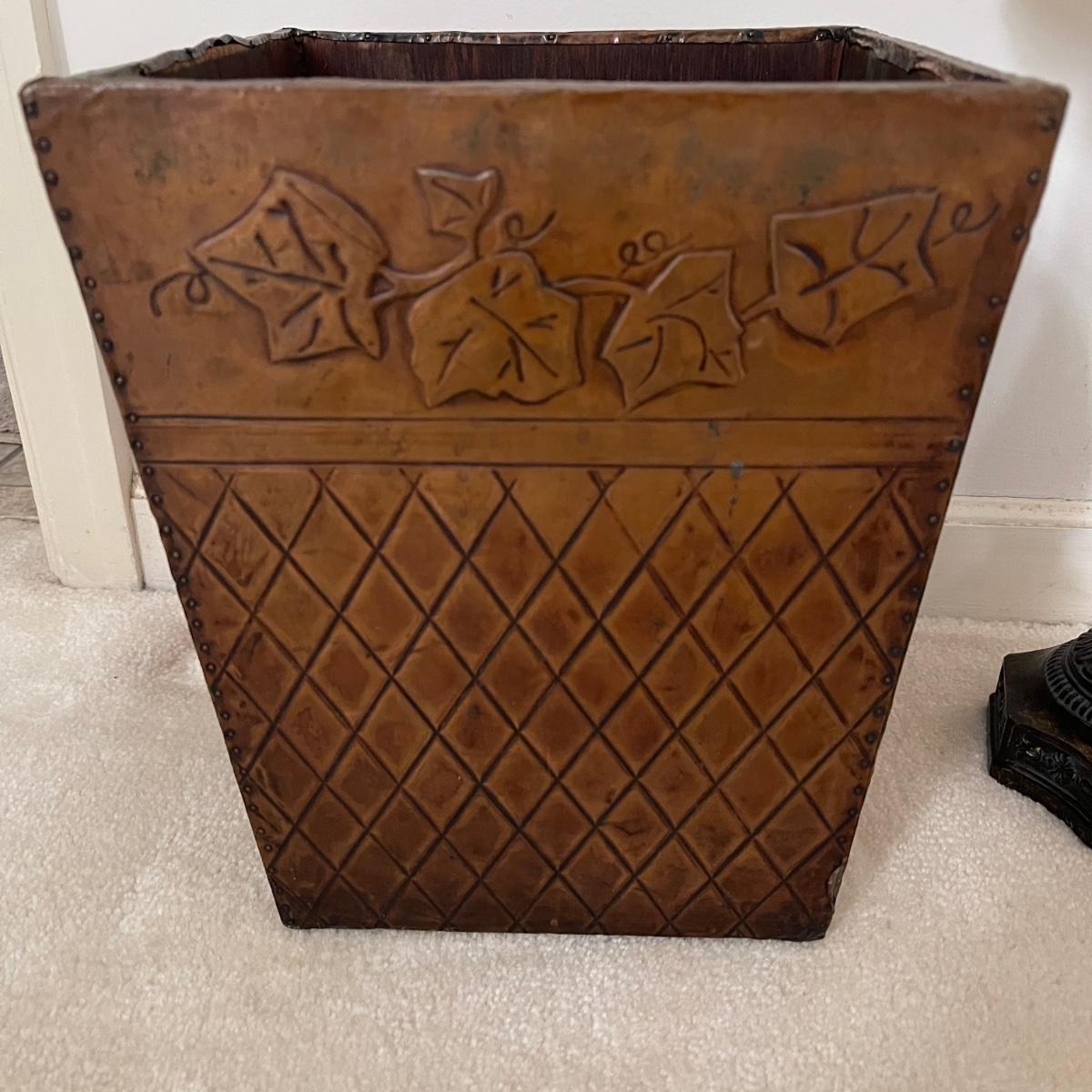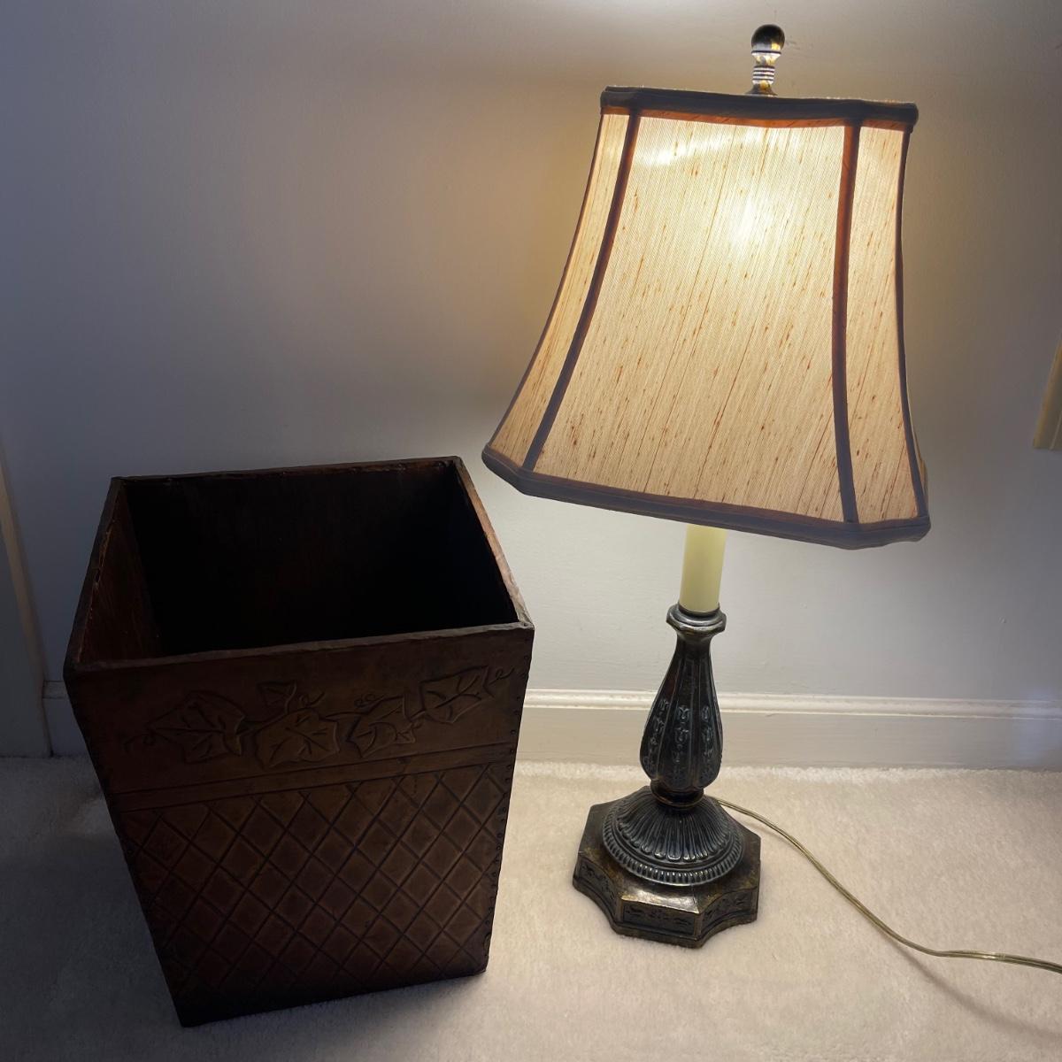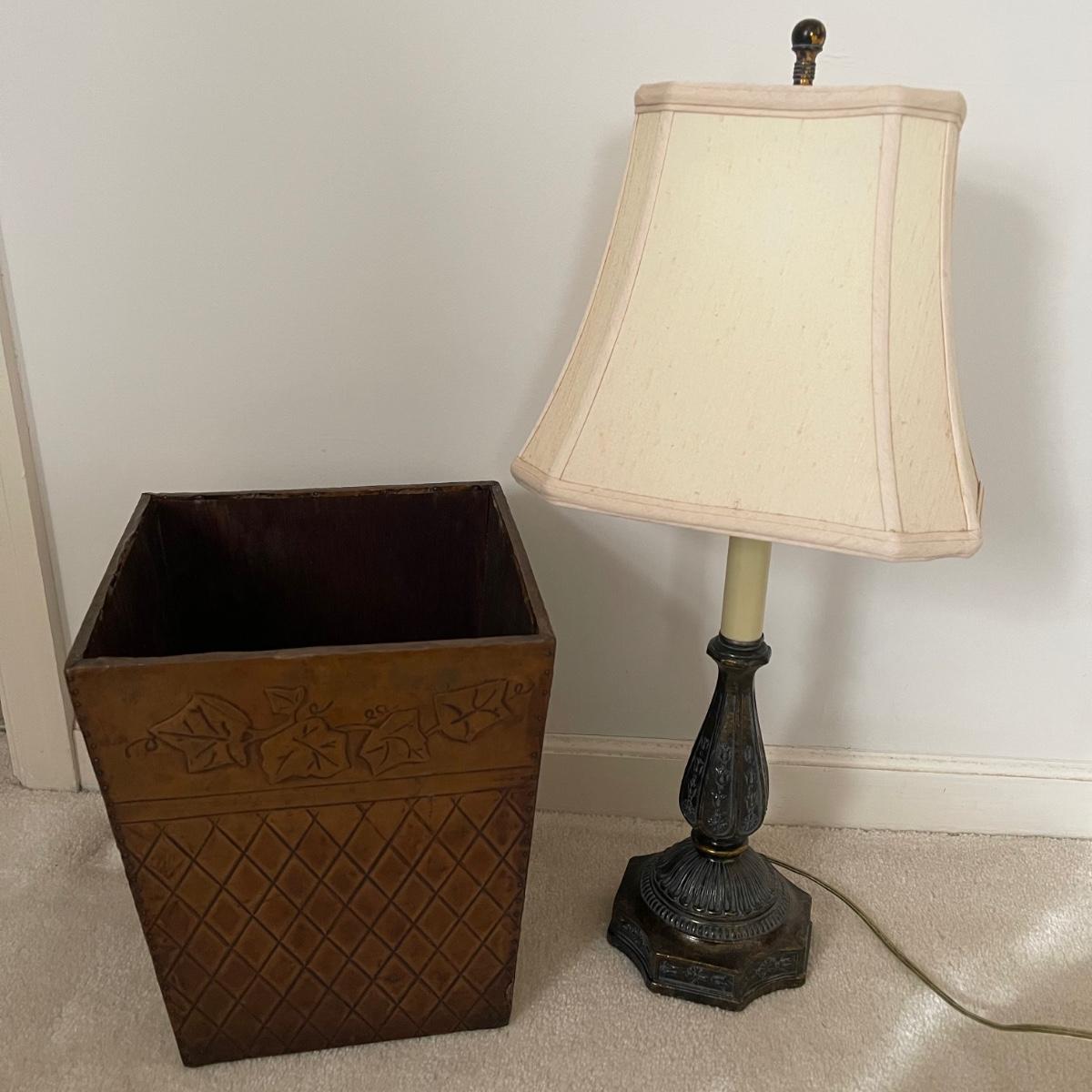 The lamp in this lot is 22.5 inches tall and is in working condition. The lampshade is a cream color and has some damage on the interior. The base of the lamp is made of metal and is a tad heavier than expected. Colors around the lamp base vary and include dark brown, gold, and brass. The wastebasket is wooden and square. The decoration on the outside is attached tin paneling with leaf imagery and a cross hatch pattern.