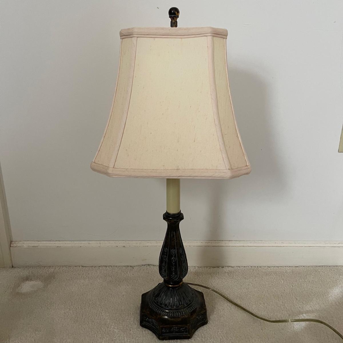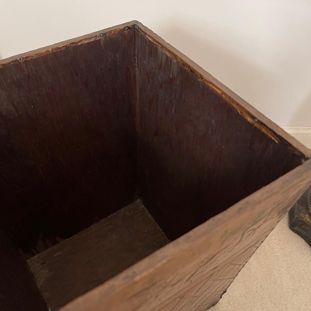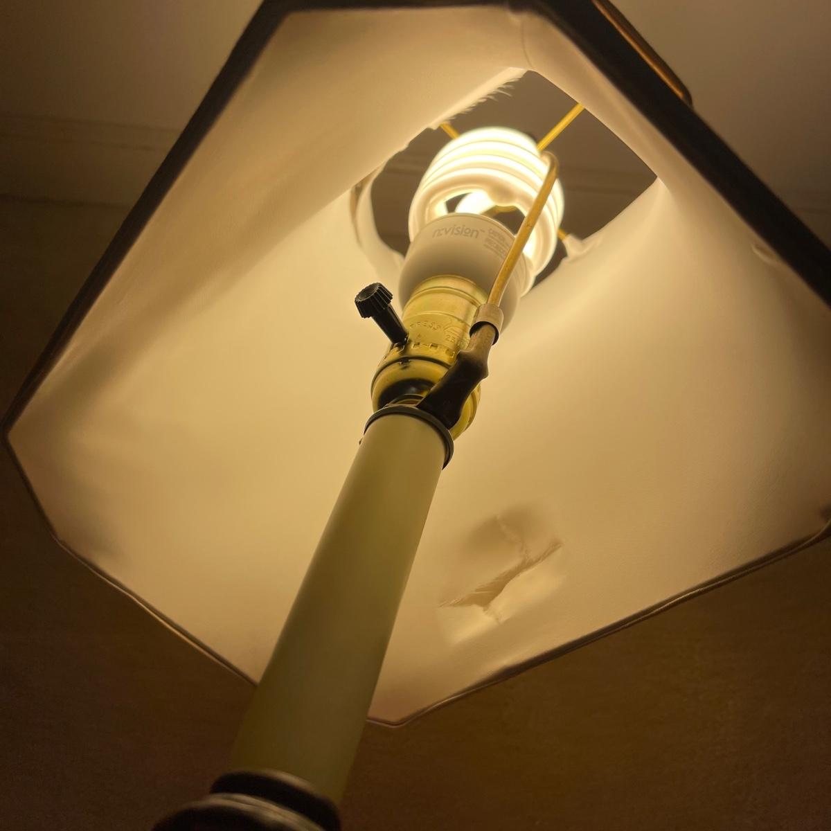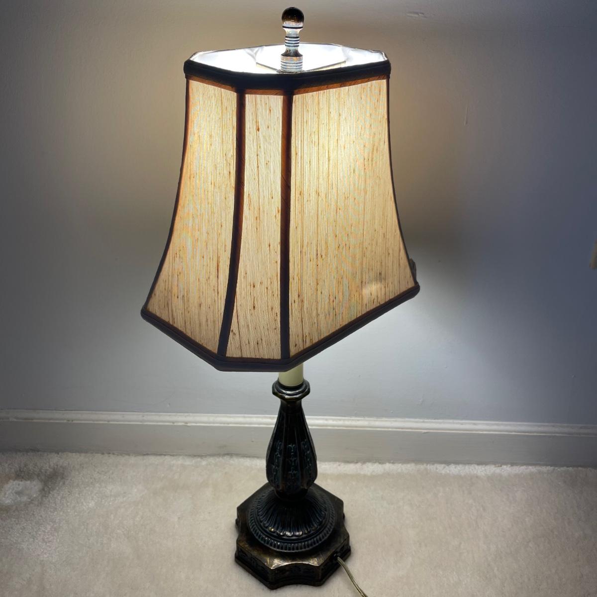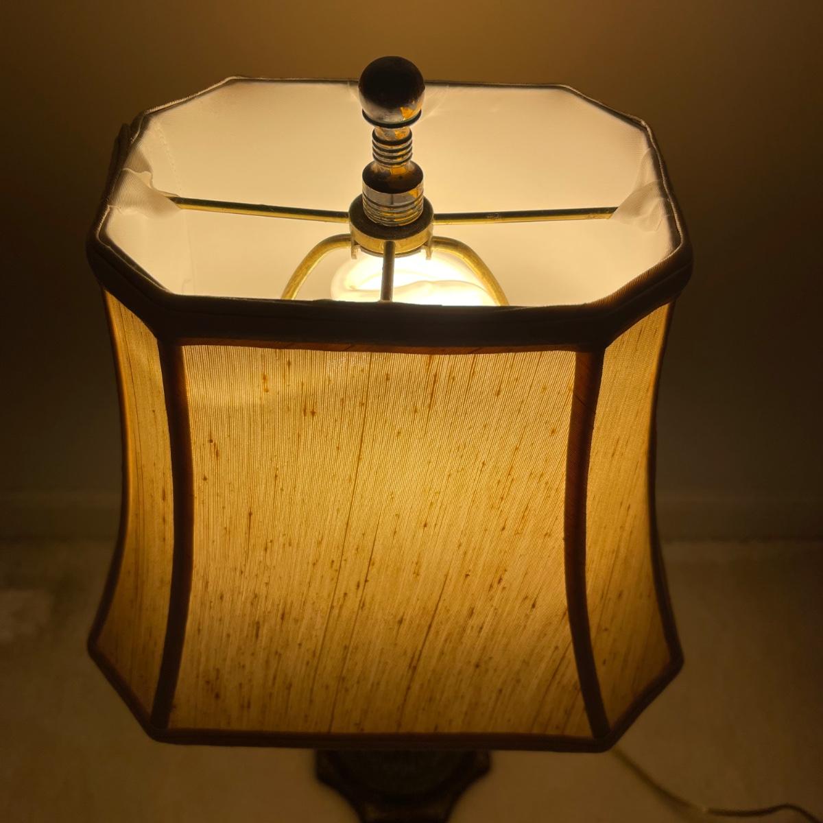 The lamp in this lot is 22.5 inches tall and is in working condition. The lampshade is a cream color and has some damage on the interior. The base of the lamp is made of metal and is a tad heavier than expected. Colors around the lamp base vary and include dark brown, gold, and brass. The wastebasket is wooden and square. The decoration on the outside is attached tin paneling with leaf imagery and a cross hatch pattern.