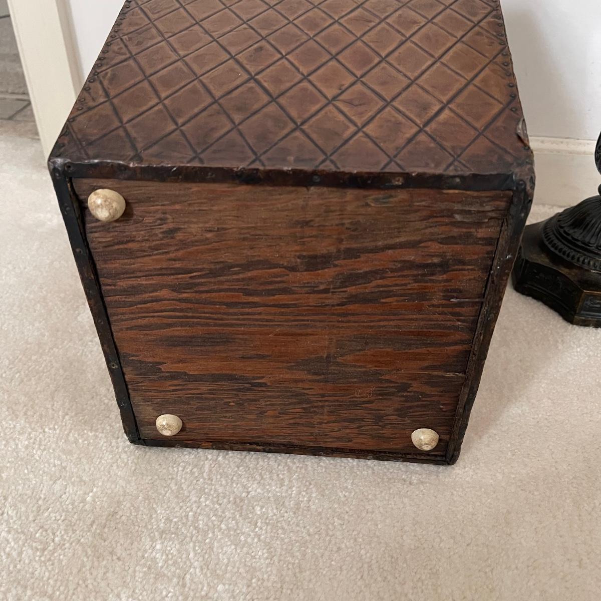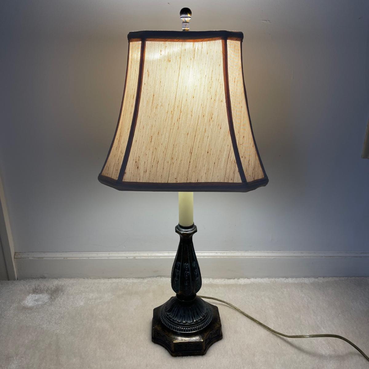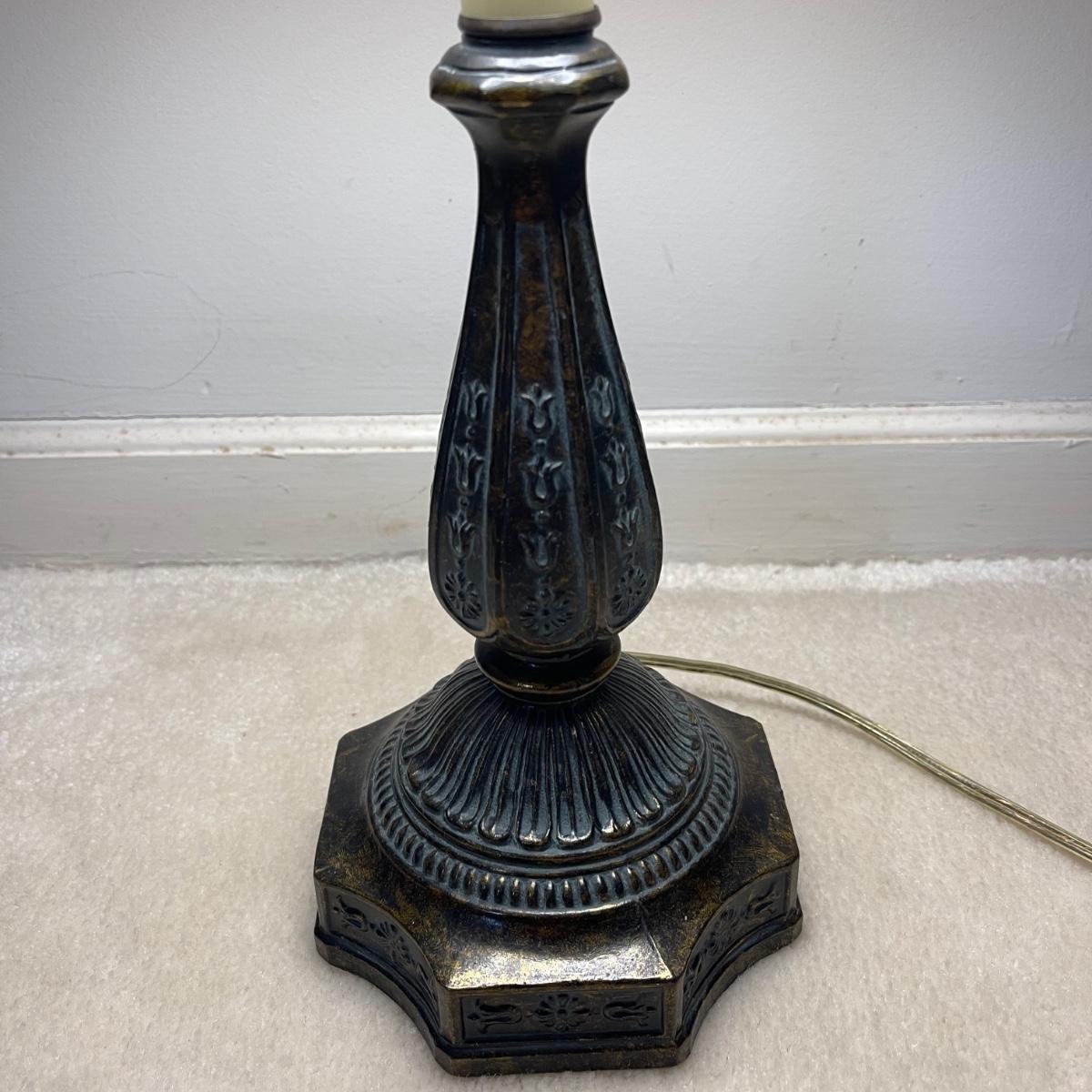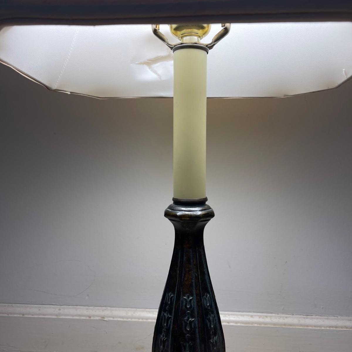 The lamp in this lot is 22.5 inches tall and is in working condition. The lampshade is a cream color and has some damage on the interior. The base of the lamp is made of metal and is a tad heavier than expected. Colors around the lamp base vary and include dark brown, gold, and brass. The wastebasket is wooden and square. The decoration on the outside is attached tin paneling with leaf imagery and a cross hatch pattern.