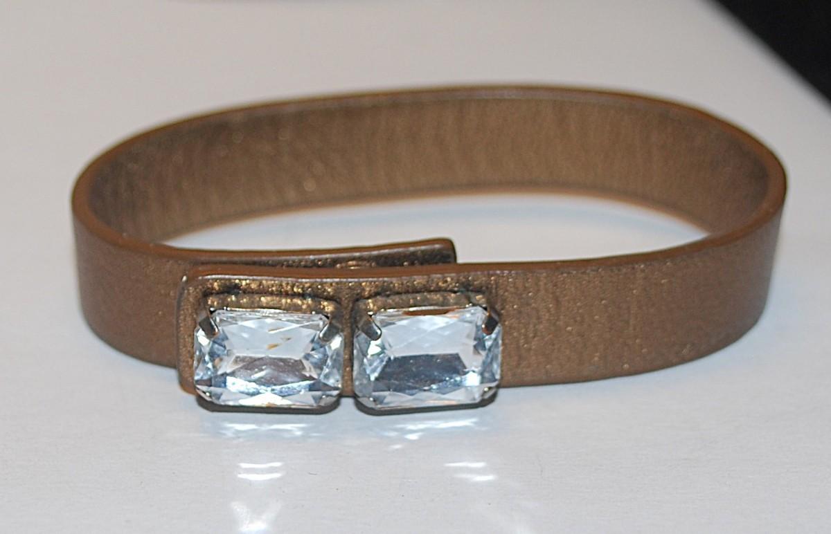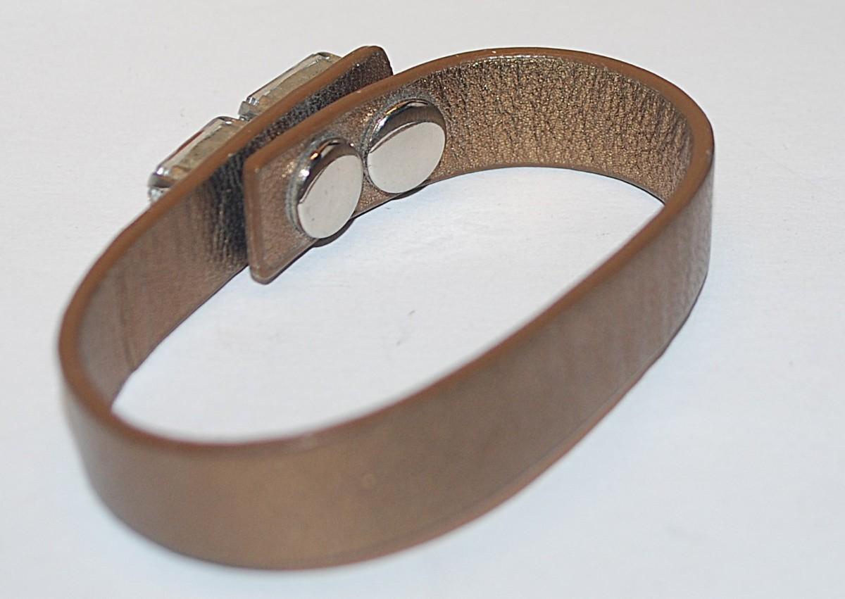 Brass Colored Leather-Like Strap BRACELET (2¼" Opening) with 2 Large Clear Rectangle Stone Accents and Button Snap Closure