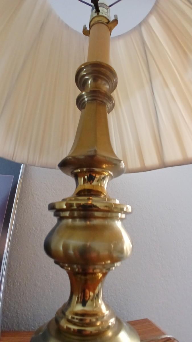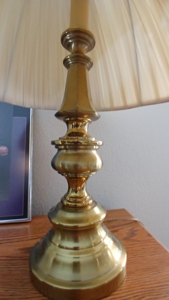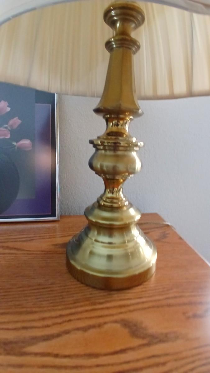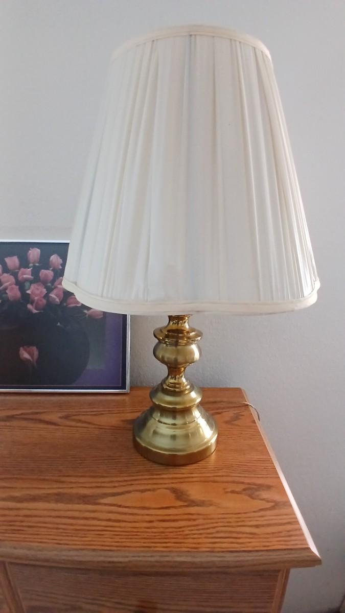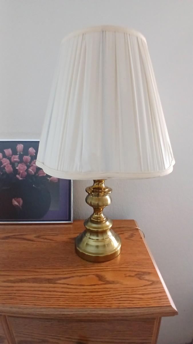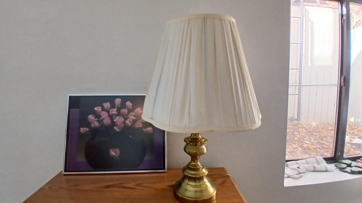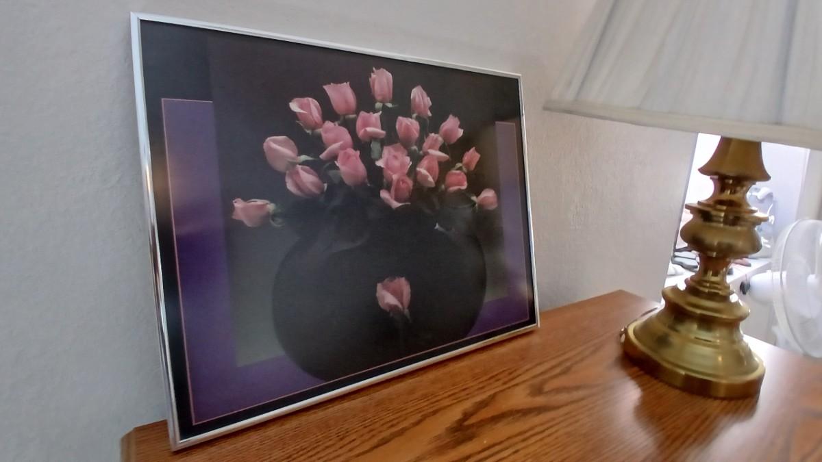 Brass colored table lamp with framed artwork of pink roses