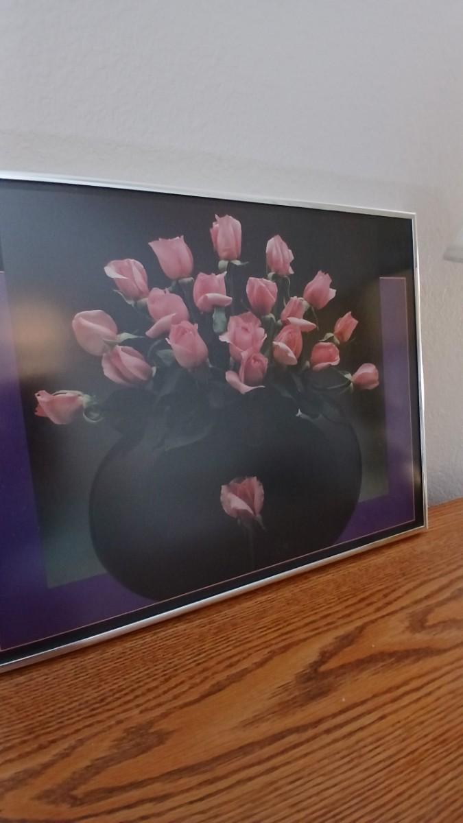 Brass colored table lamp 22" with framed artwork of pink roses 18" x 14.5"