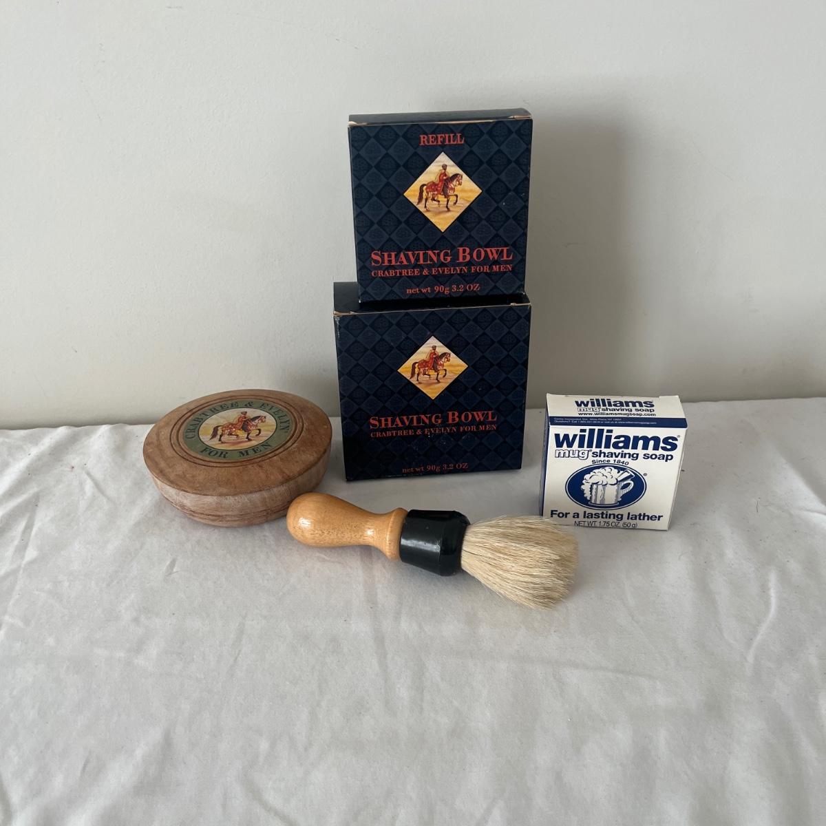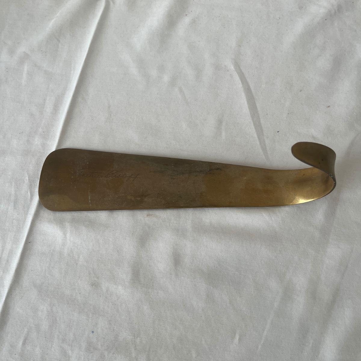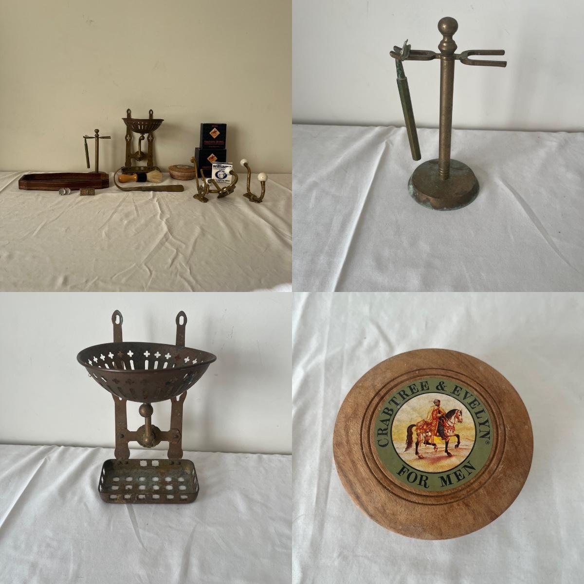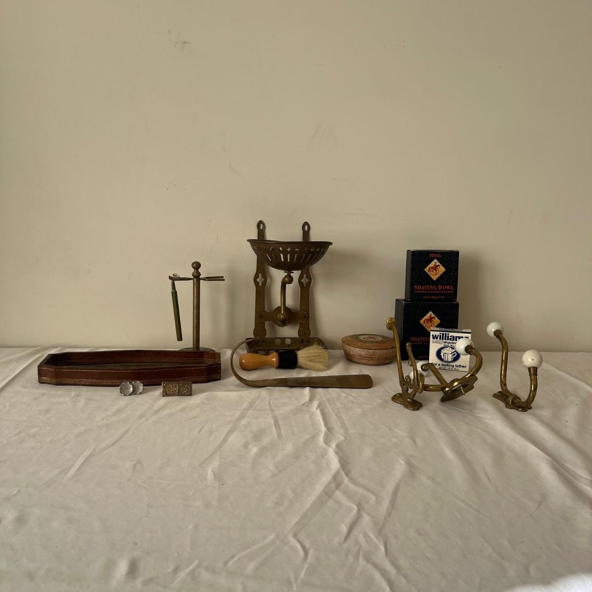 Lot includes a copper wall mount soap dish, brass razor handle and holder, brass Arthur Rubloff shoe horn, three brass wall mount coat hooks, leather tray, Crabtree & Evelyn shaving soap, bristle brush and a silver colored pair of cufflinks and a gold colored pair of cufflinks. Copper soap dish measures 5.5” x 6.5” x 9.5”H.