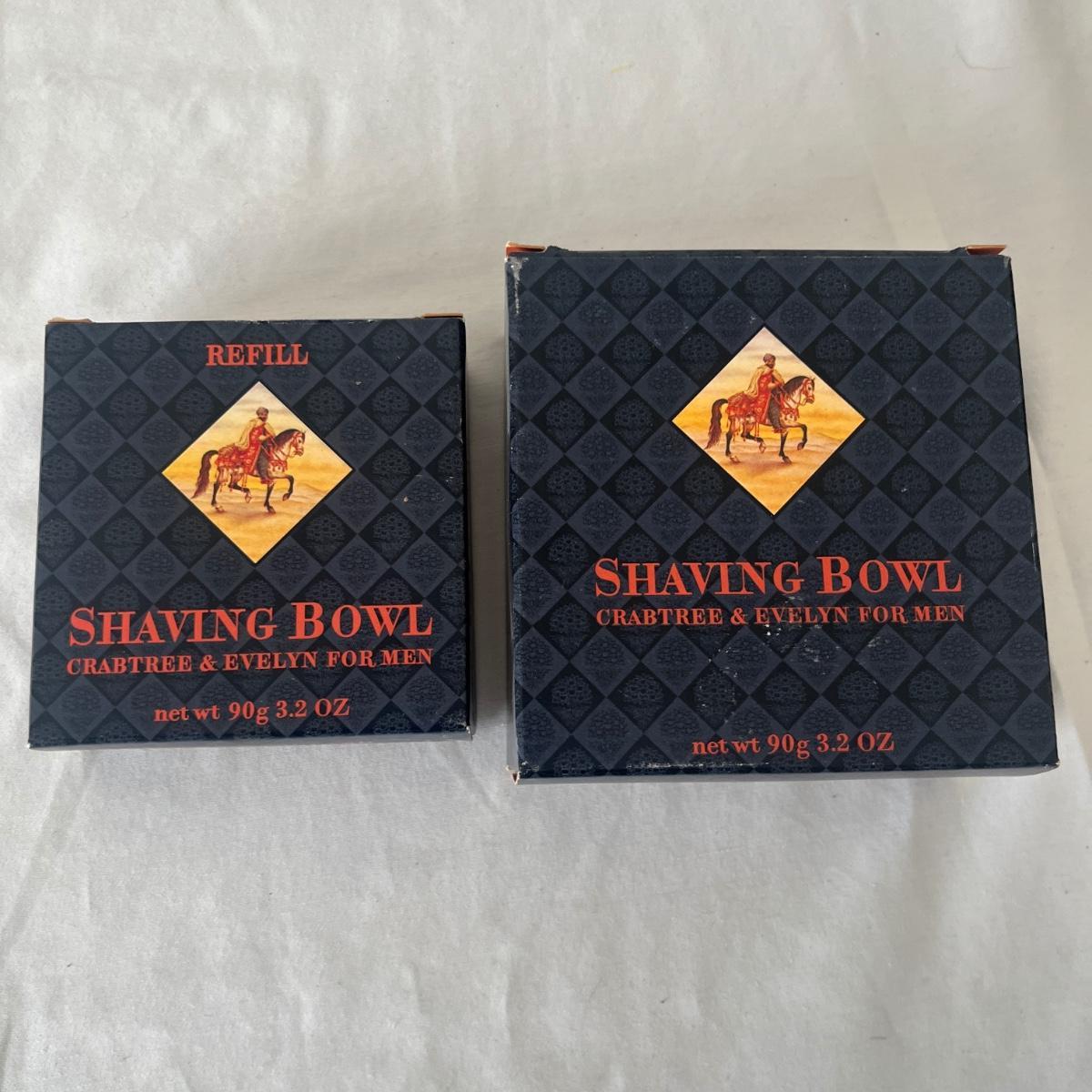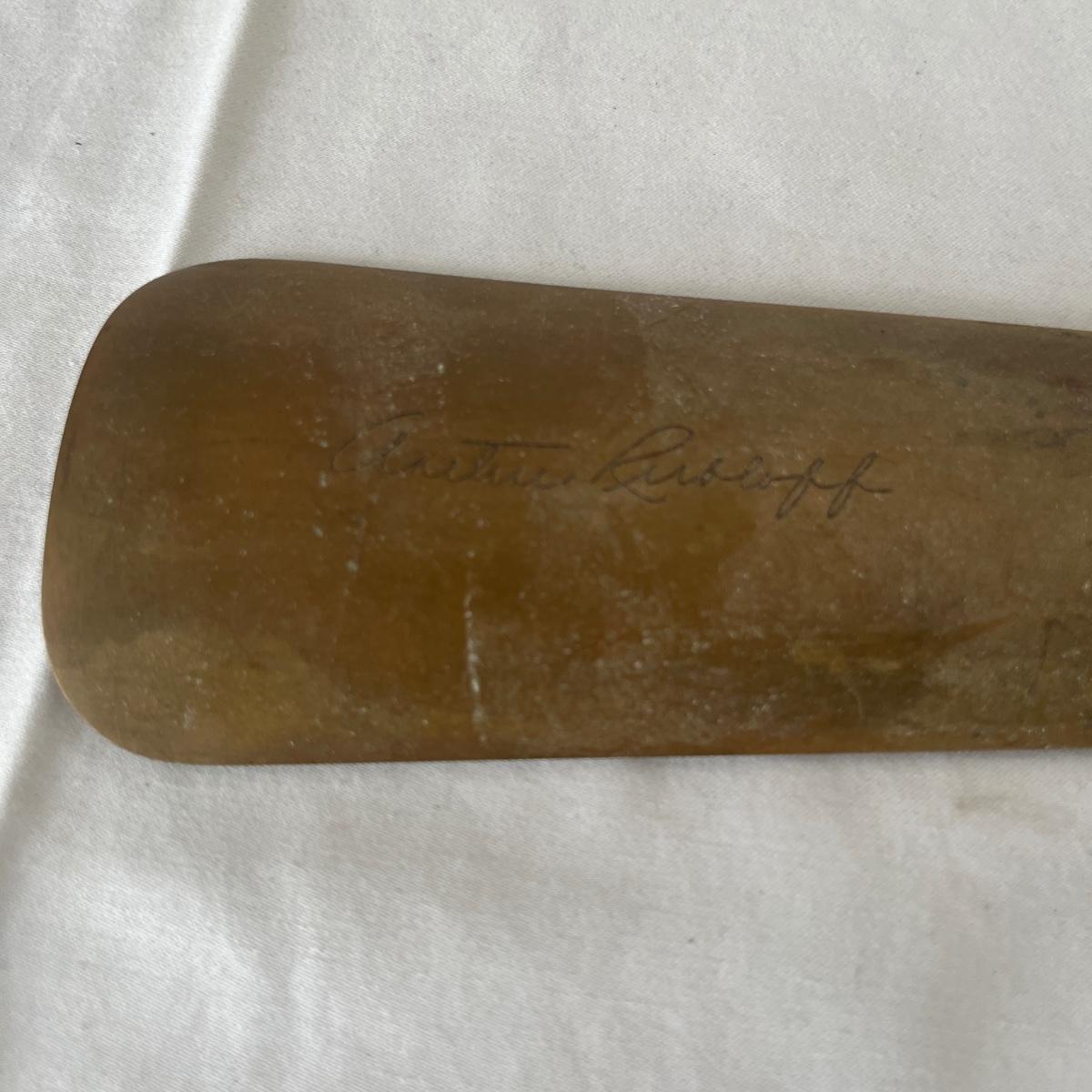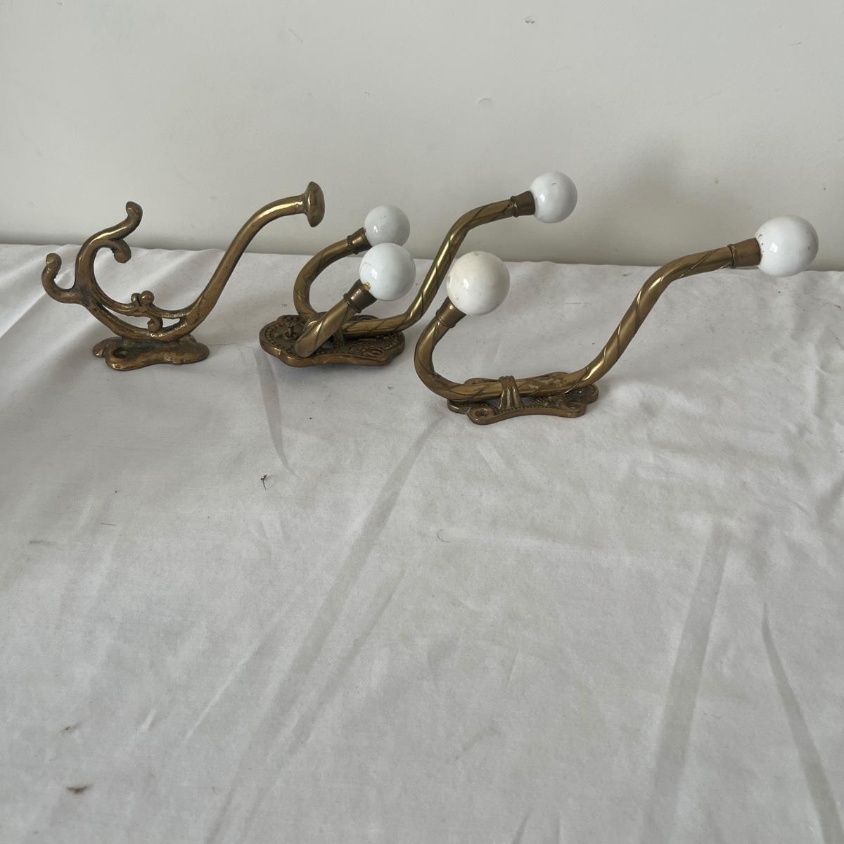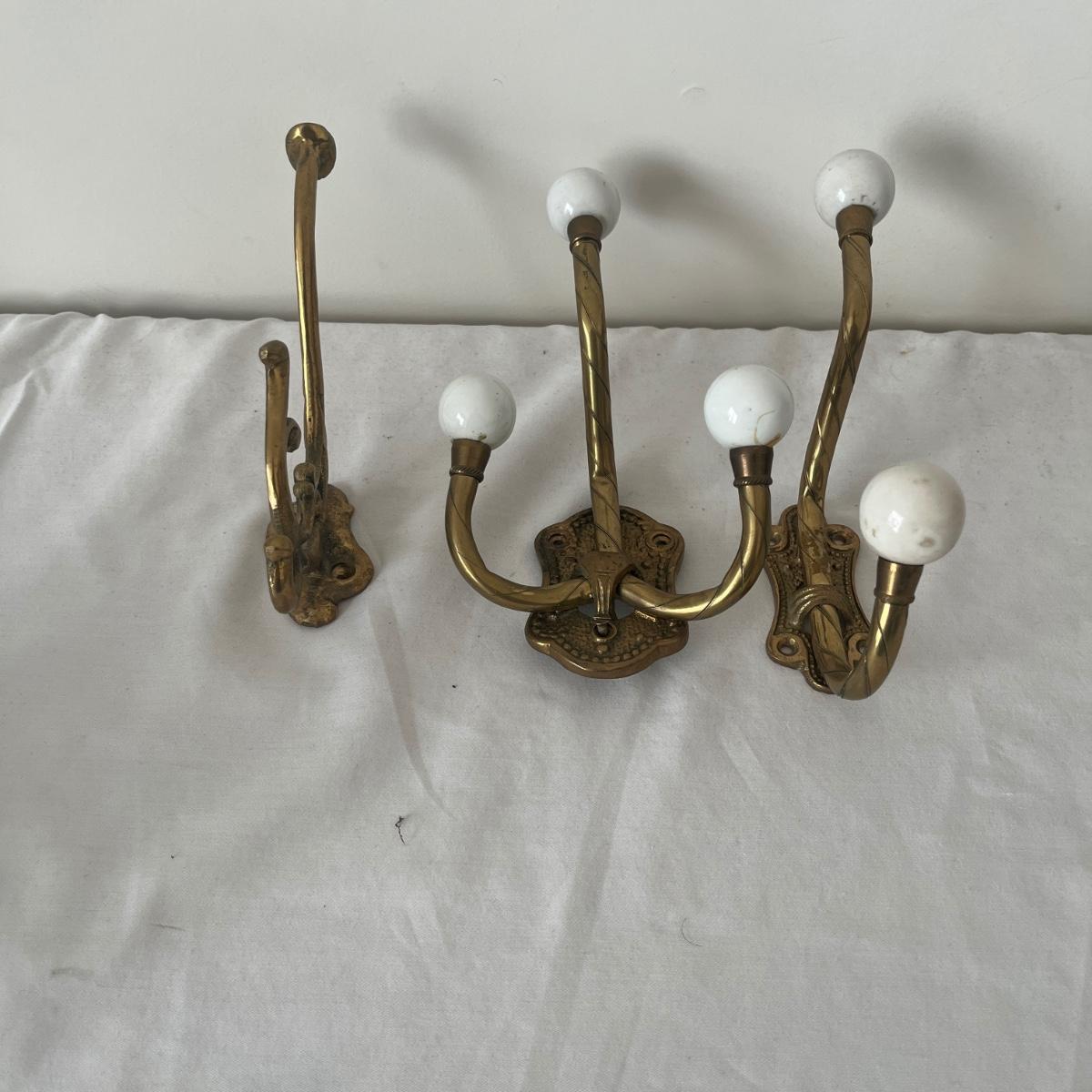 Lot includes a copper wall mount soap dish, brass razor handle and holder, brass Arthur Rubloff shoe horn, three brass wall mount coat hooks, leather tray, Crabtree & Evelyn shaving soap, bristle brush and a silver colored pair of cufflinks and a gold colored pair of cufflinks. Copper soap dish measures 5.5” x 6.5” x 9.5”H.