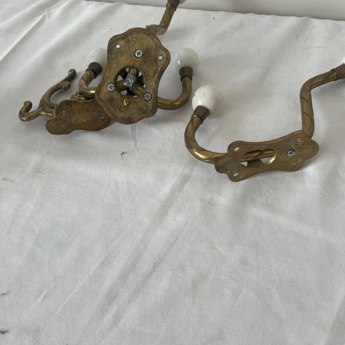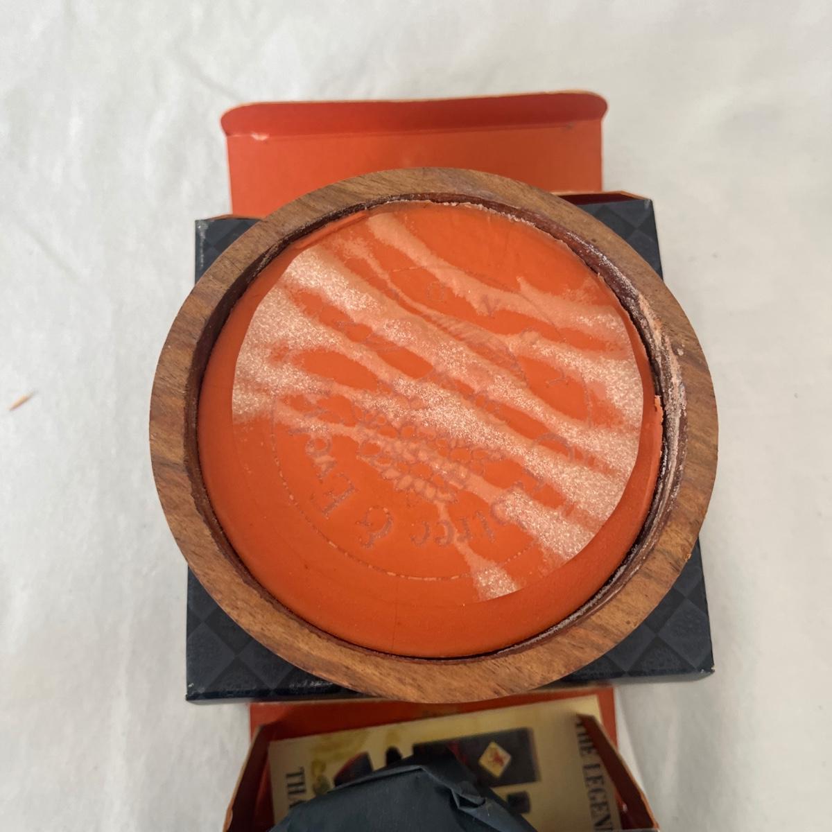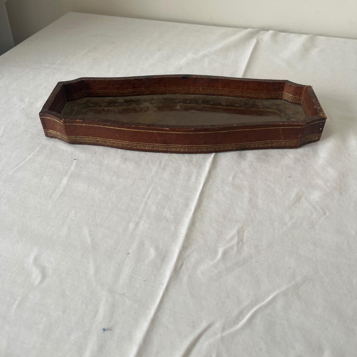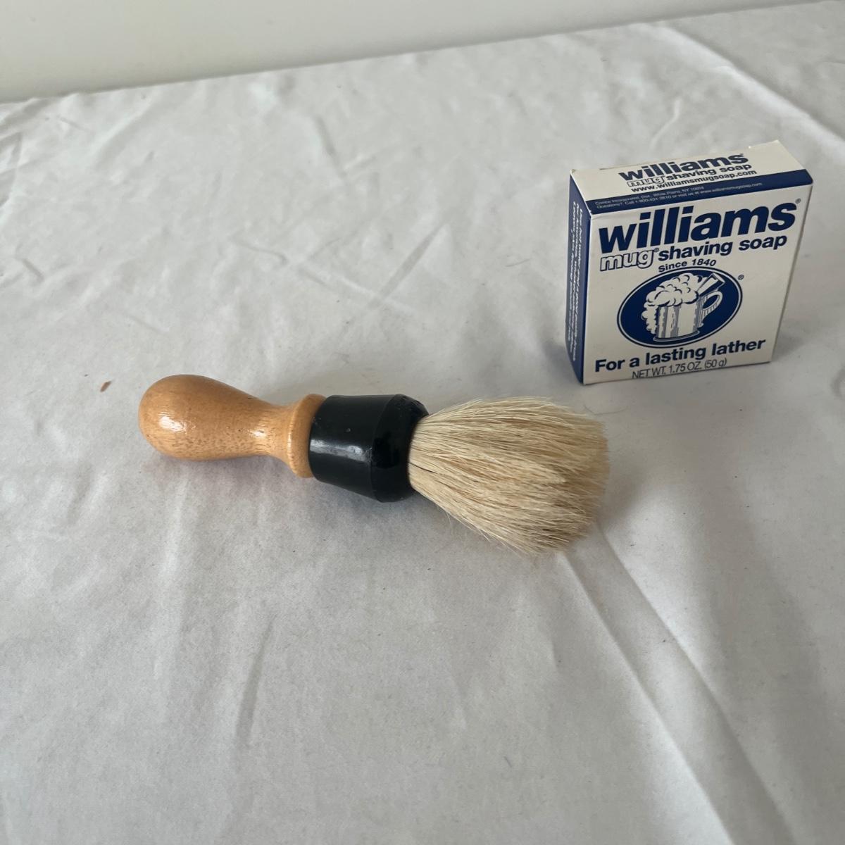 Lot includes a copper wall mount soap dish, brass razor handle and holder, brass Arthur Rubloff shoe horn, three brass wall mount coat hooks, leather tray, Crabtree & Evelyn shaving soap, bristle brush and a silver colored pair of cufflinks and a gold colored pair of cufflinks. Copper soap dish measures 5.5” x 6.5” x 9.5”H.