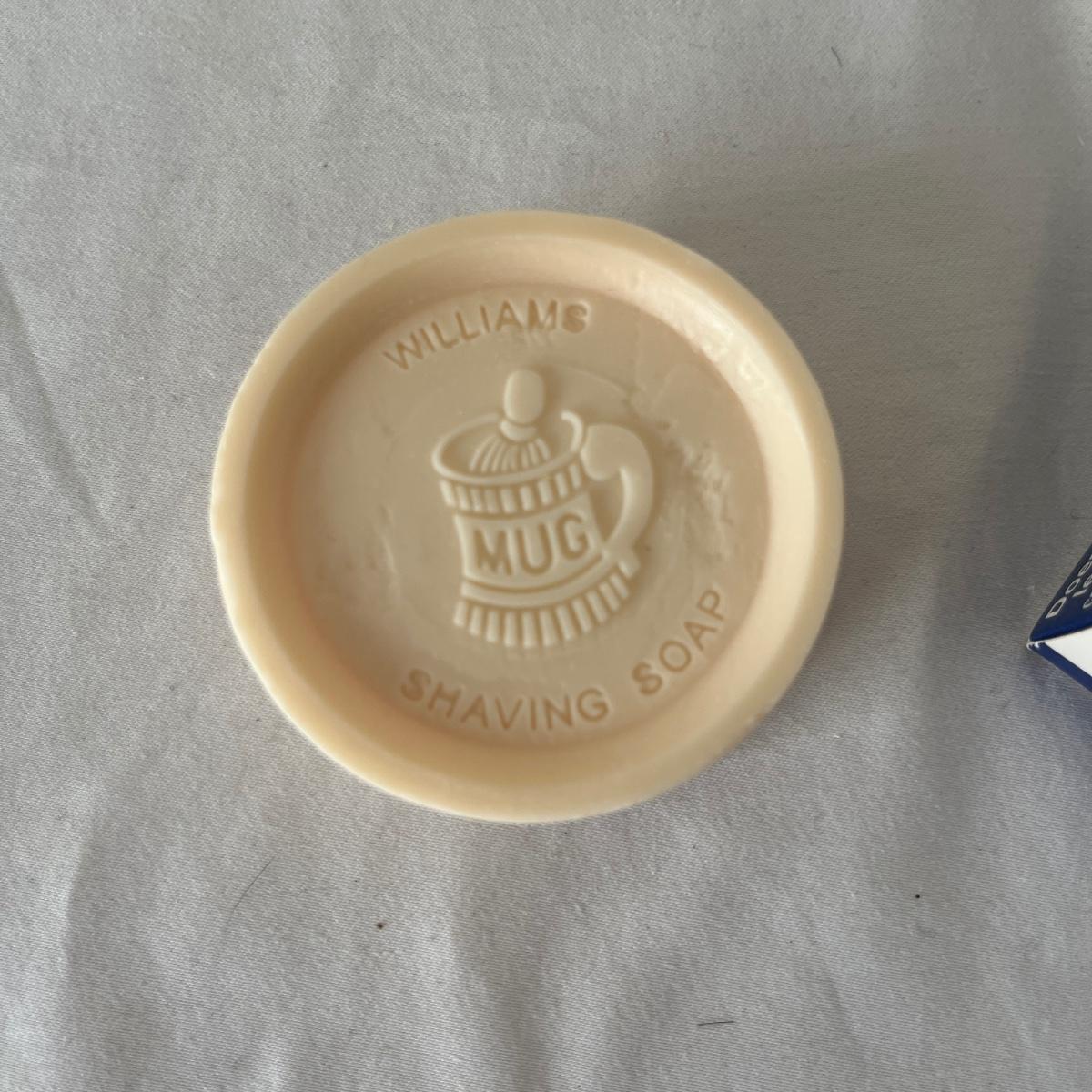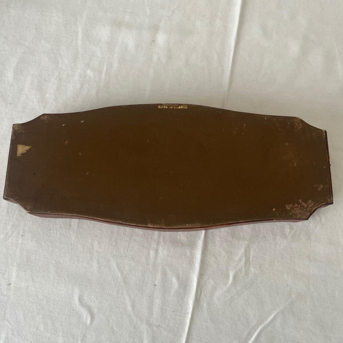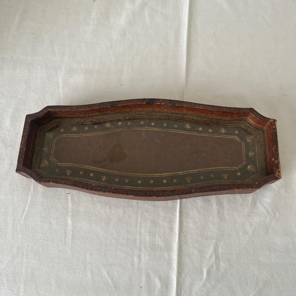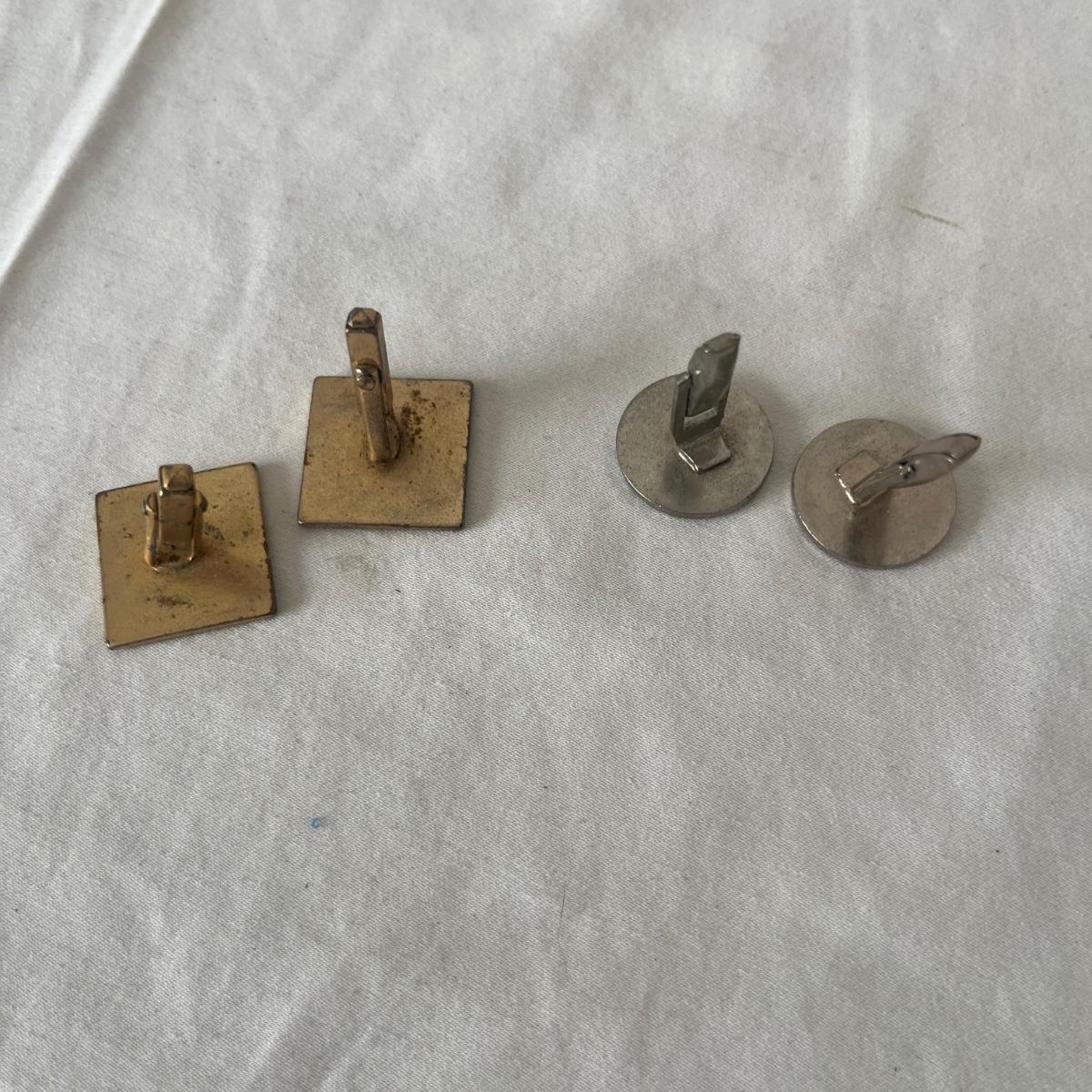 Lot includes a copper wall mount soap dish, brass razor handle and holder, brass Arthur Rubloff shoe horn, three brass wall mount coat hooks, leather tray, Crabtree & Evelyn shaving soap, bristle brush and a silver colored pair of cufflinks and a gold colored pair of cufflinks. Copper soap dish measures 5.5” x 6.5” x 9.5”H.