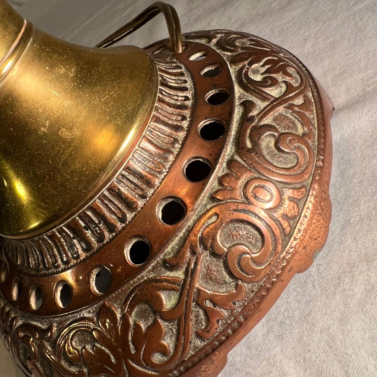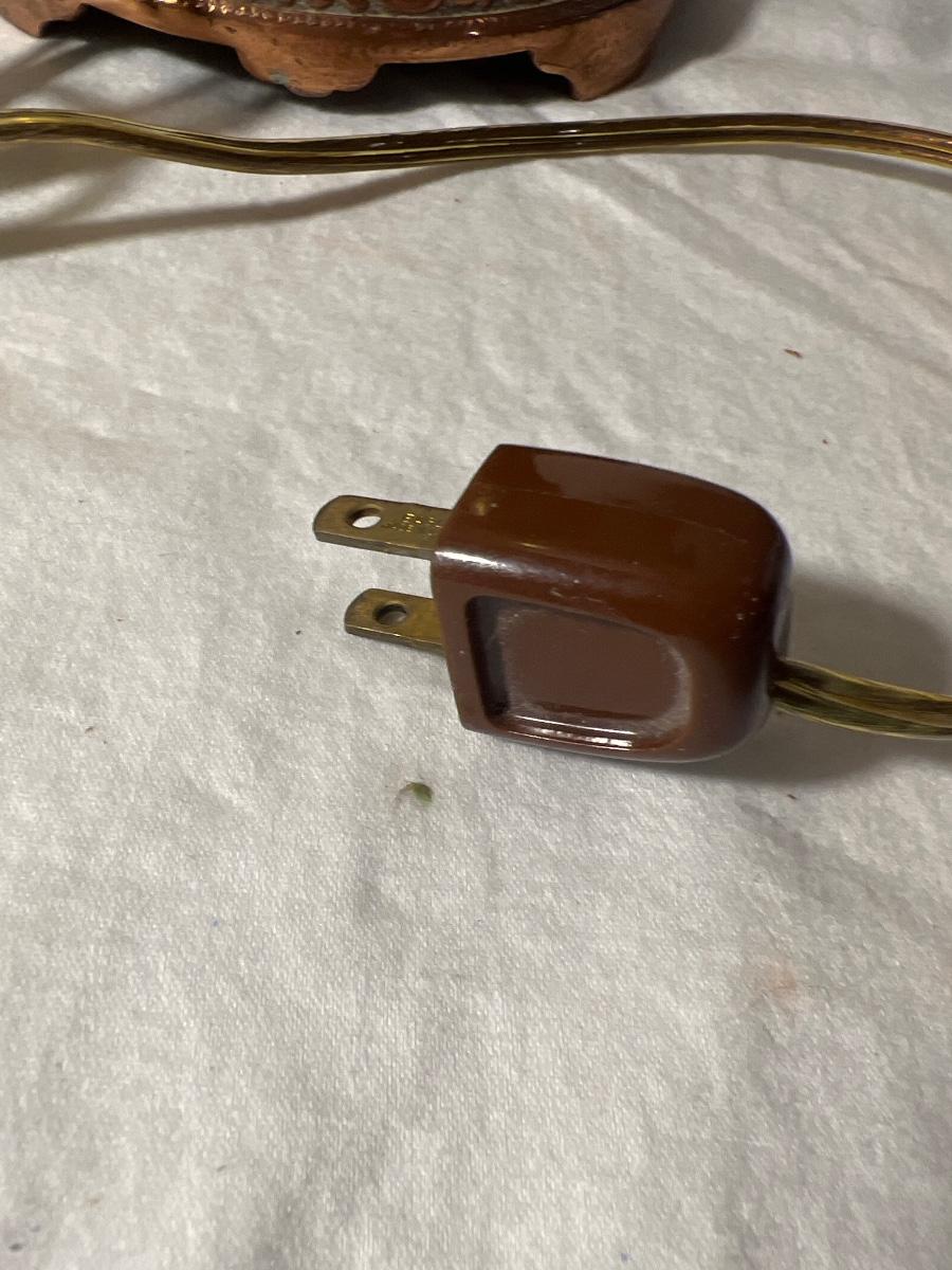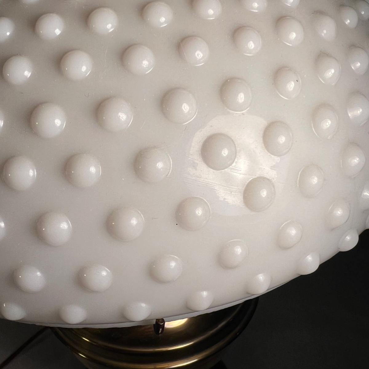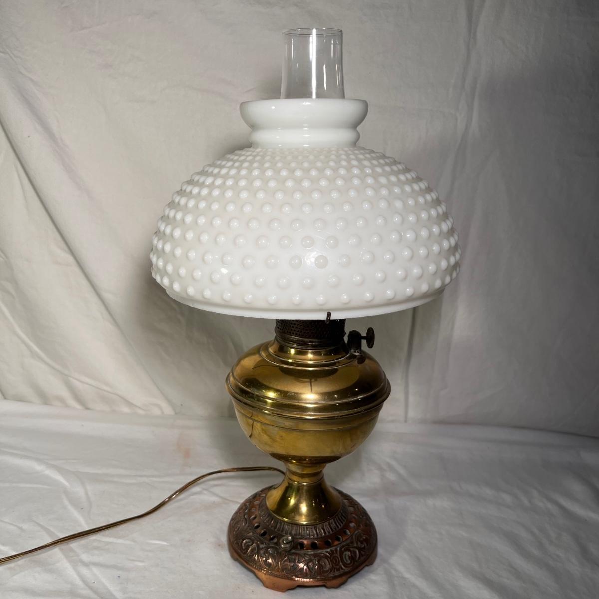 This vintage hurricane style lamp features what appears to be a solid brass and ornate copper base with a Hobnail milk glass shade with a clear glass cover inside. Lamp has a on/off switch on the base. and turned on when plugged in. Base measures 6”D x 19”H.