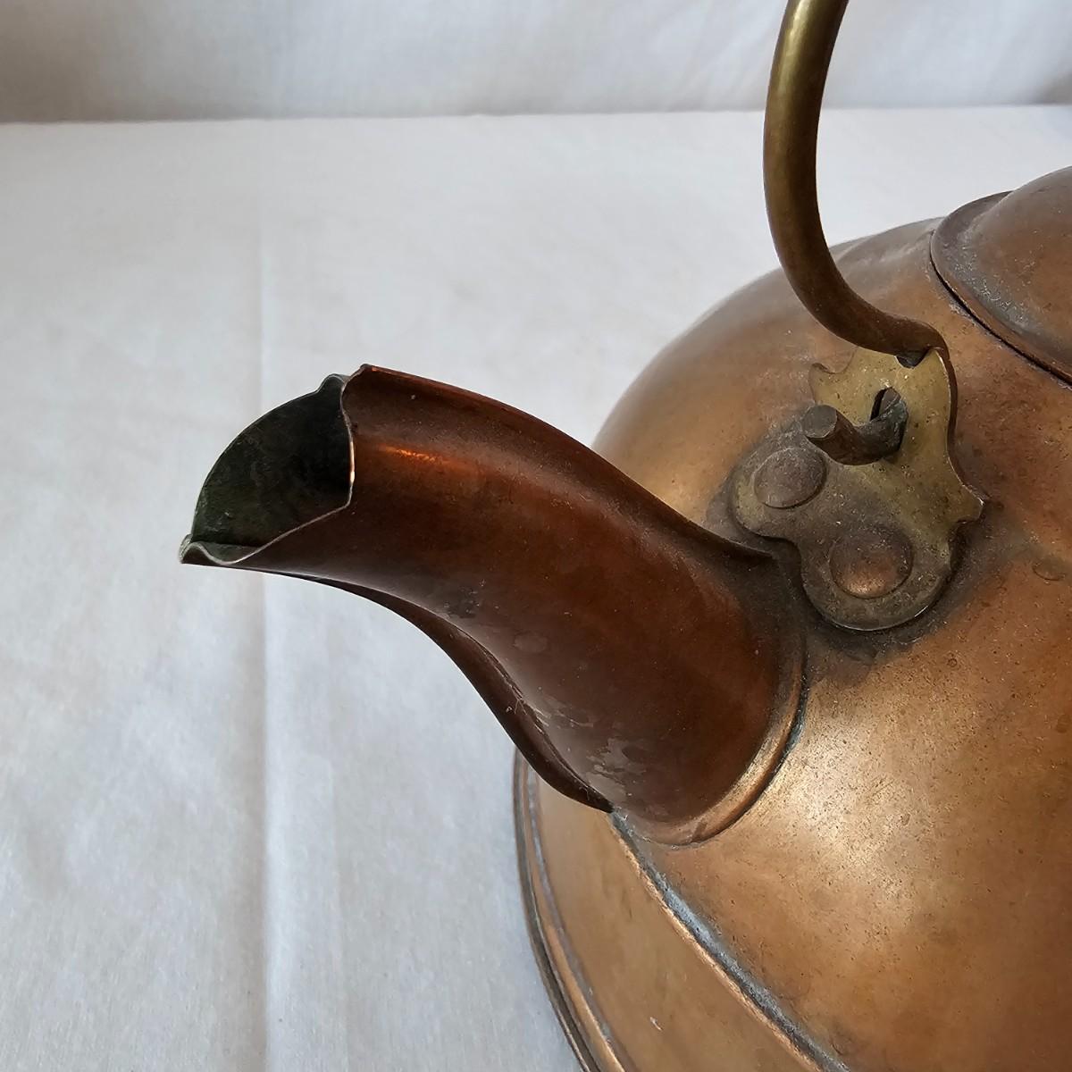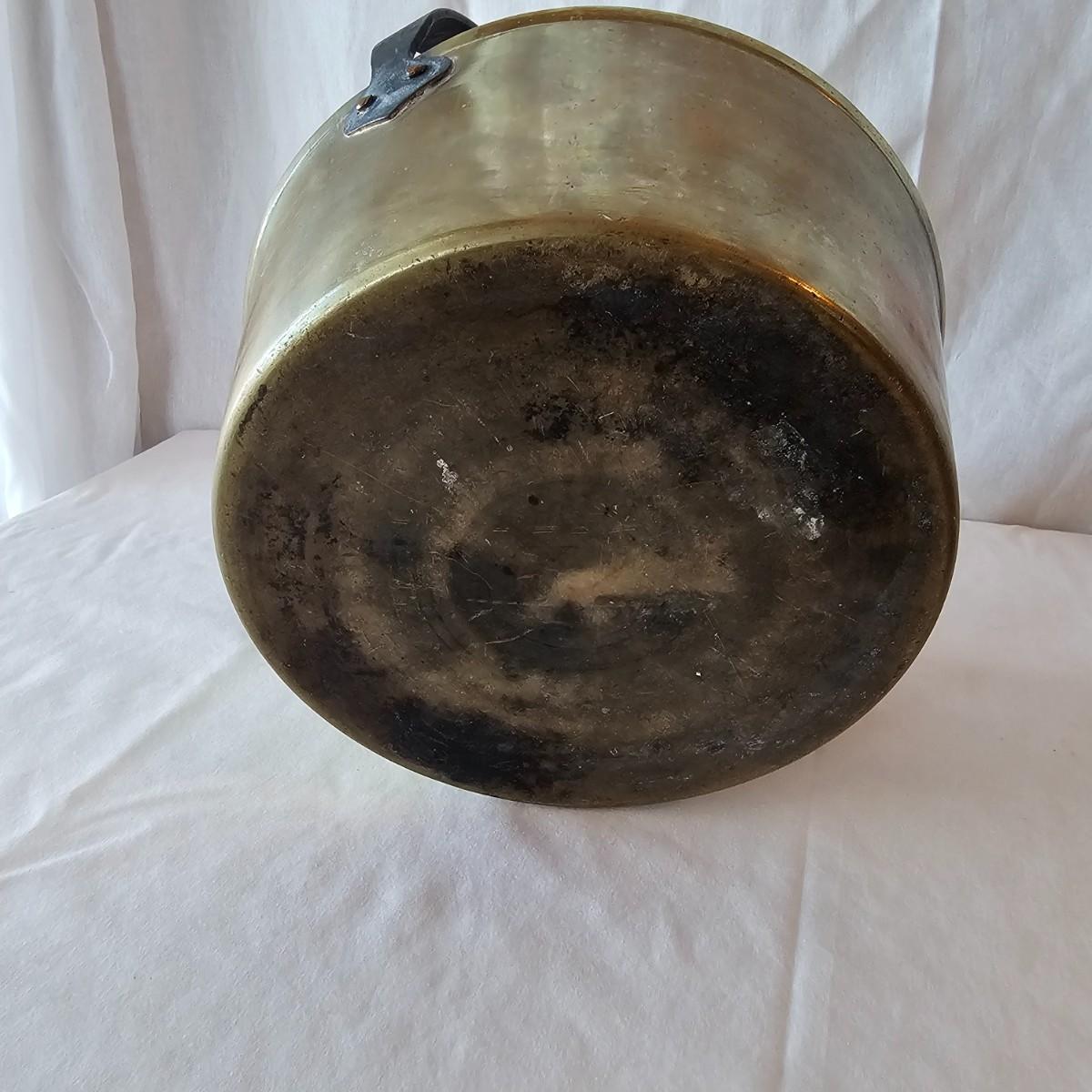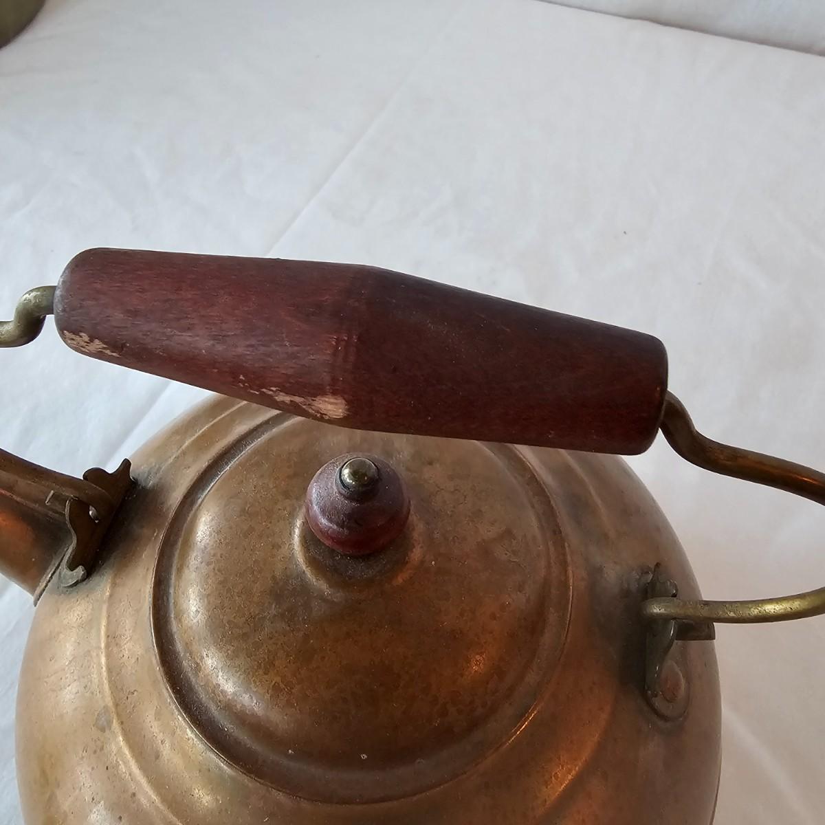 Pots, pans and kettles made of copper and brass. Large round pot is solid brass, is 12"D x 13"H, has riveted iron handle. Tea kettle with handles is solid copper, has removable lid and measures 8.5" x 7" x 7"H. Other side handle teapot is marked 'Tagus, Made in Portugal'. Brass scoop is 9" x 4.5". All items show some tarnish and wear. See photos for details. Shipping available.