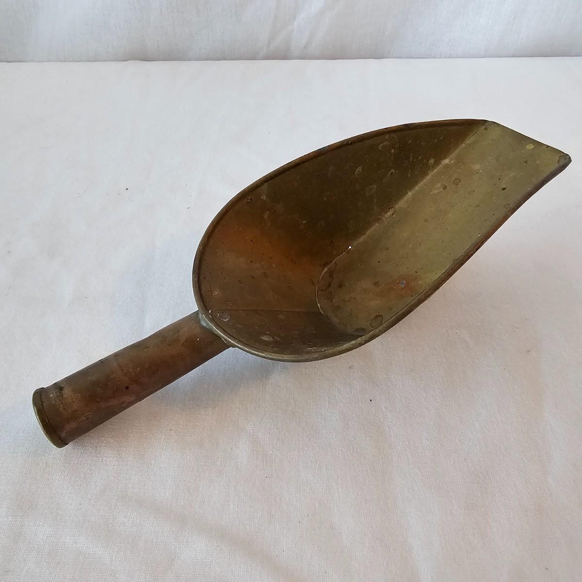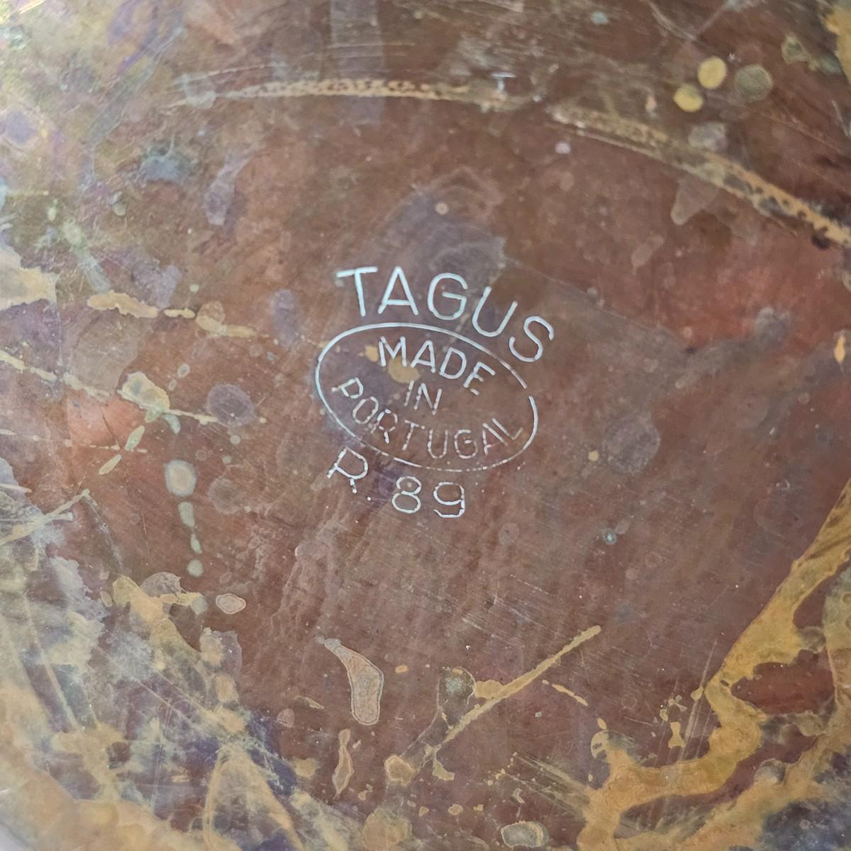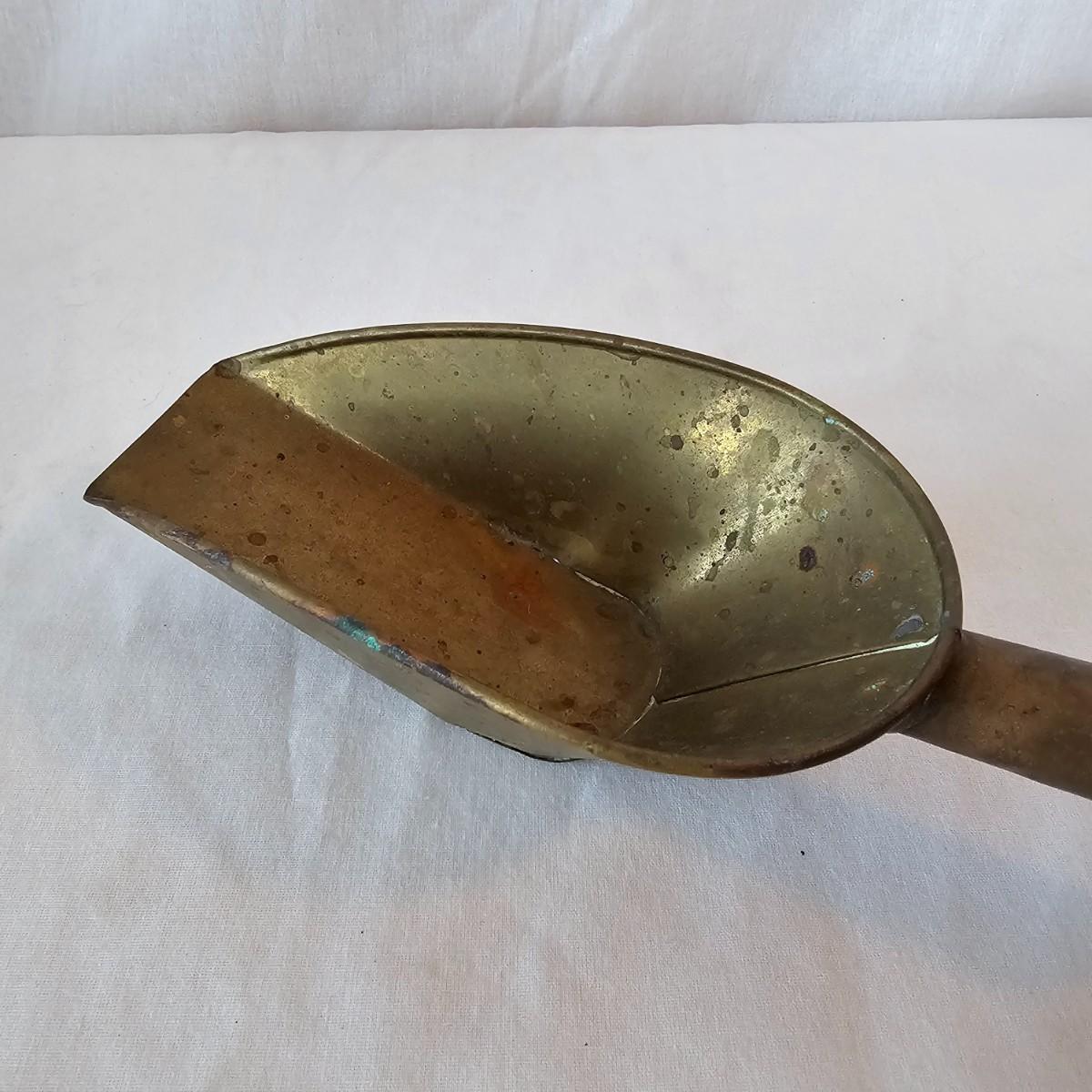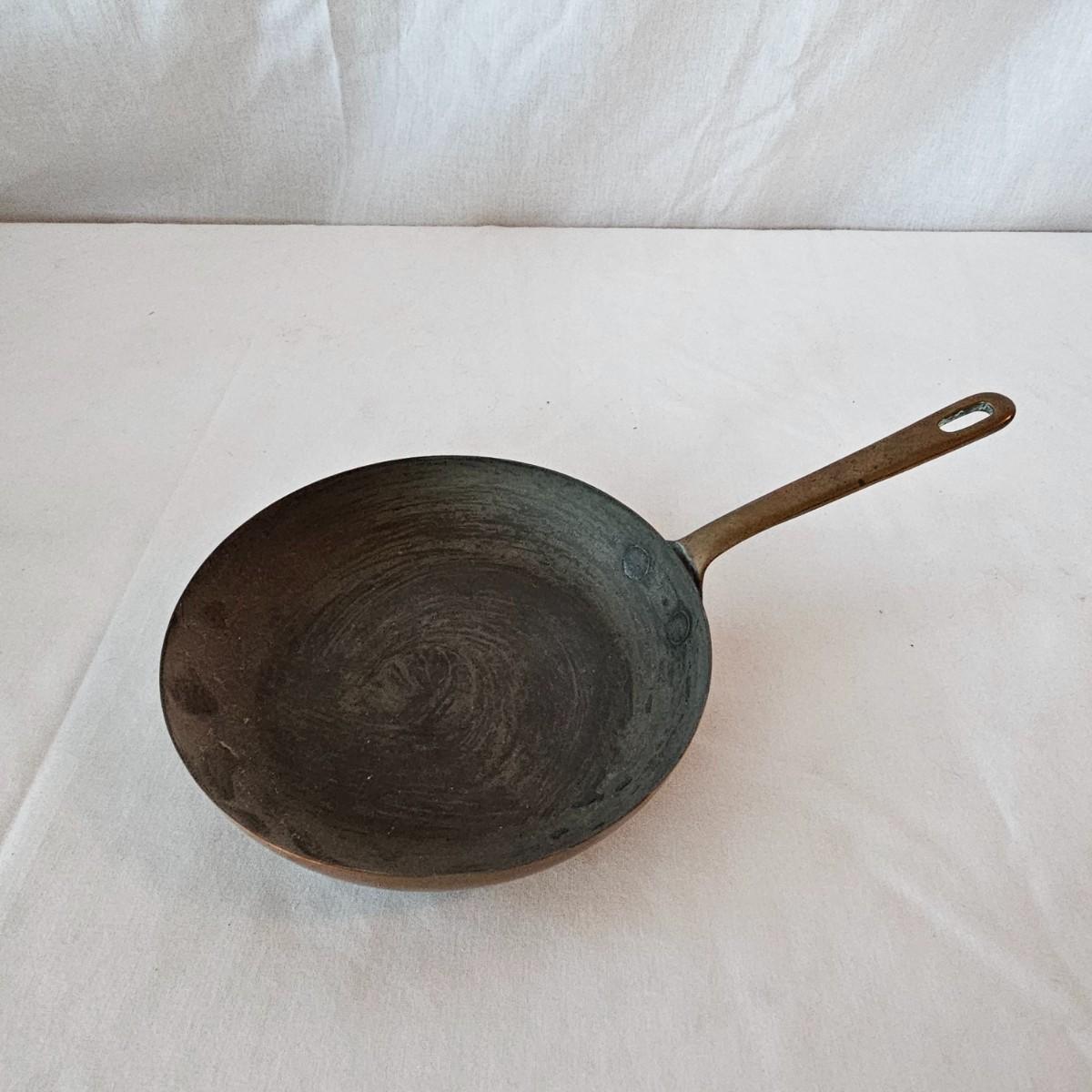 Pots, pans and kettles made of copper and brass. Large round pot is solid brass, is 12"D x 13"H, has riveted iron handle. Tea kettle with handles is solid copper, has removable lid and measures 8.5" x 7" x 7"H. Other side handle teapot is marked 'Tagus, Made in Portugal'. Brass scoop is 9" x 4.5". All items show some tarnish and wear. See photos for details. Shipping available.