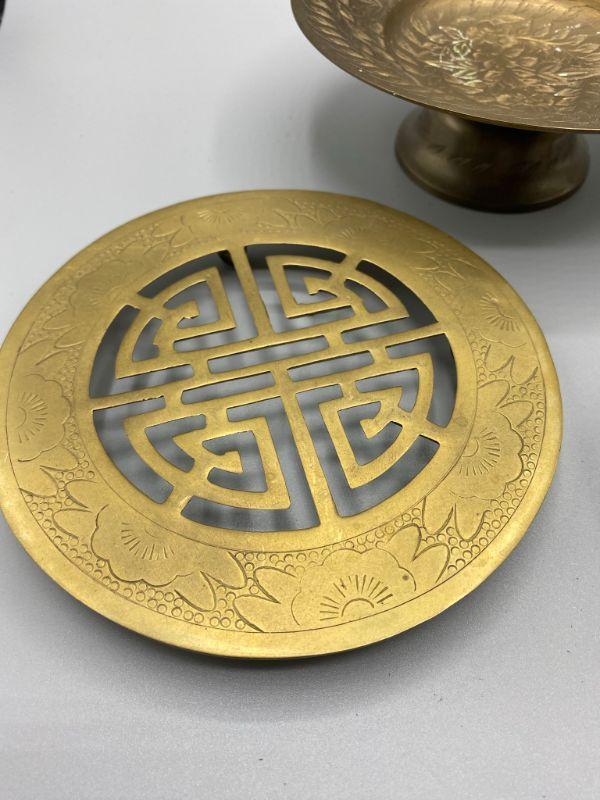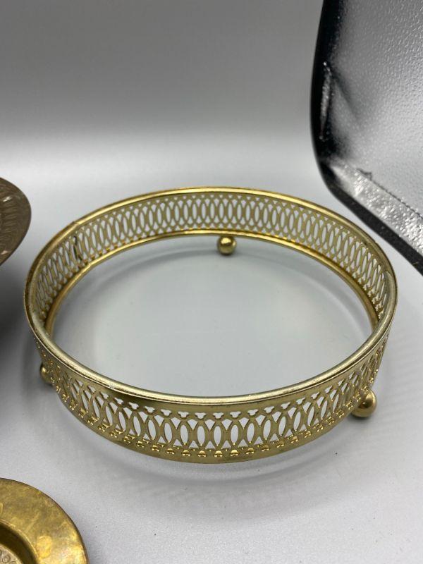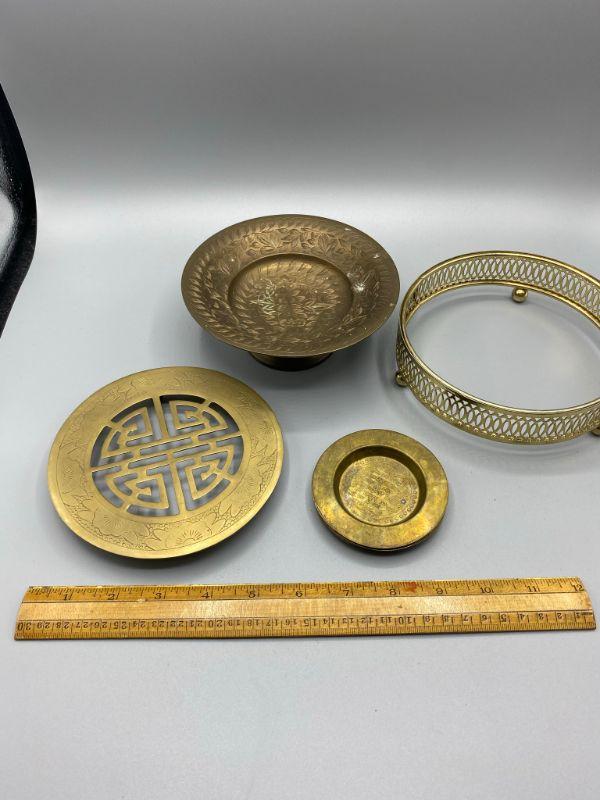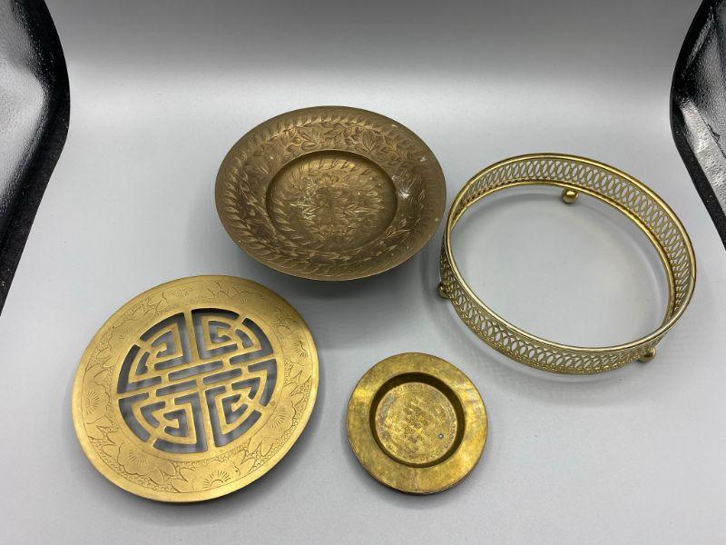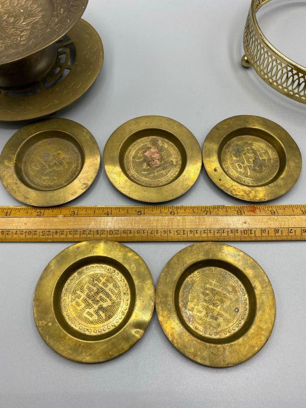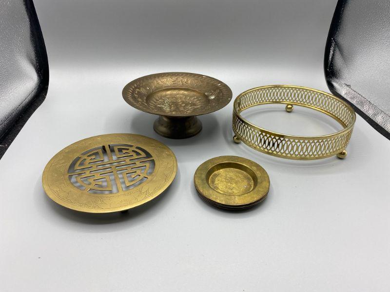 Brass decor items. Includes a trivit, a footed trinket bowl, small coasters/ashtrays, and a decorative candle ring. Some signs of age to the finishes.